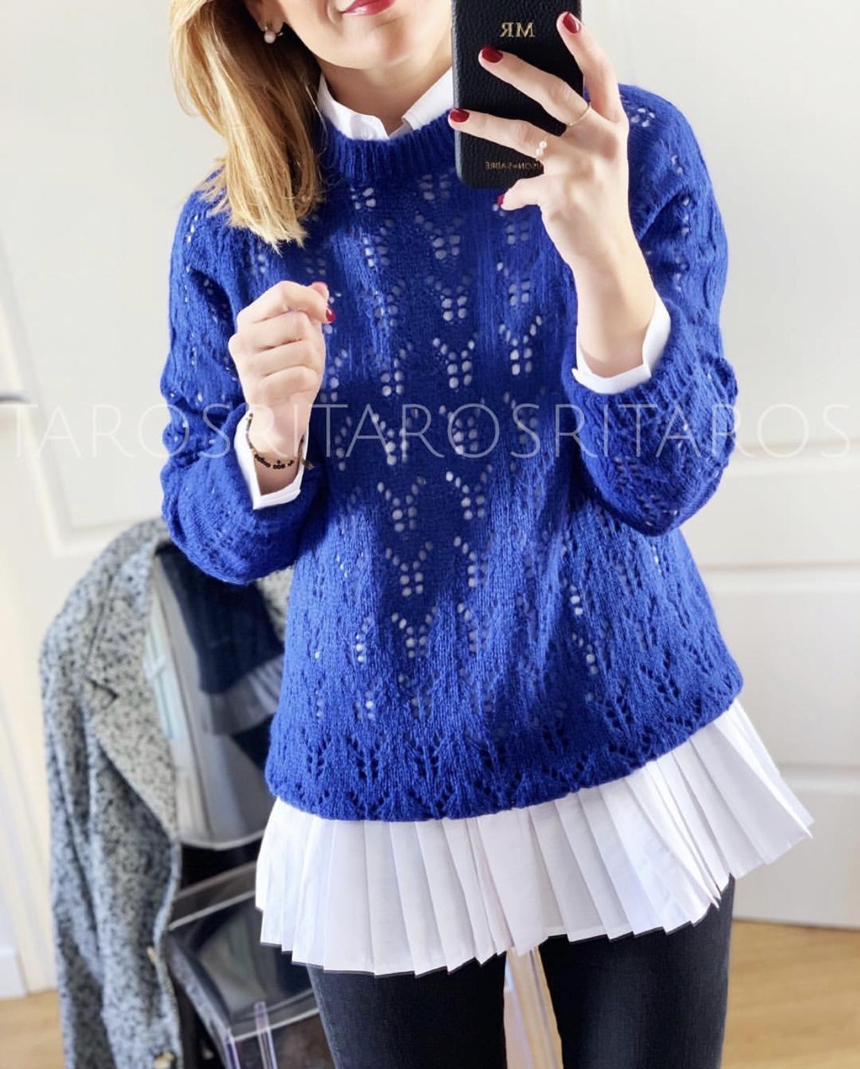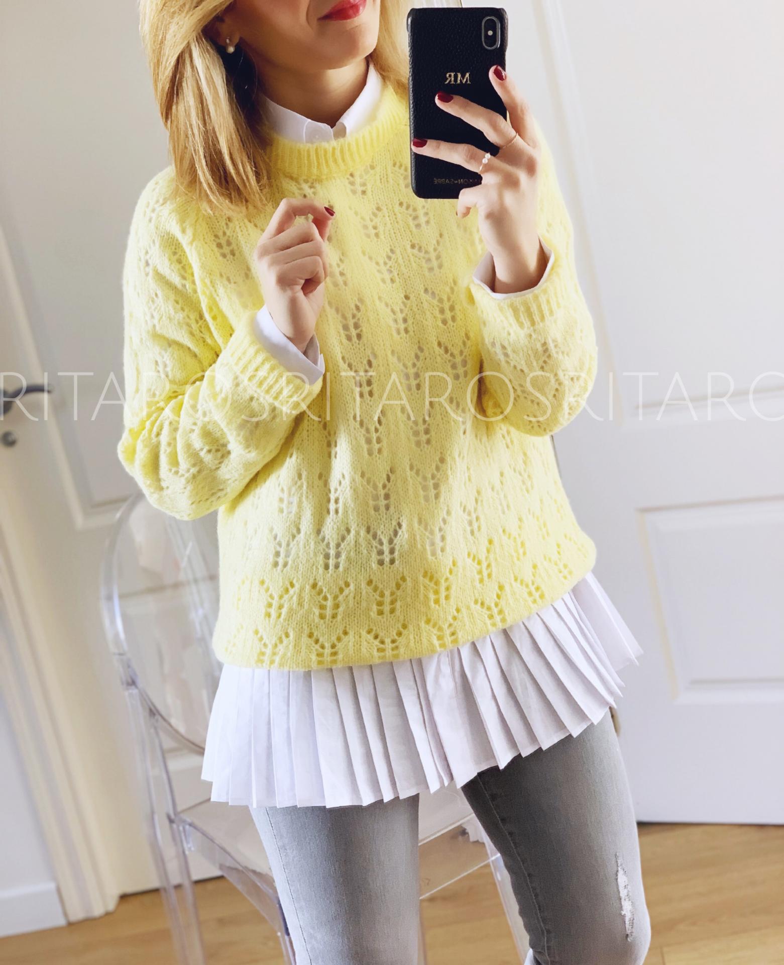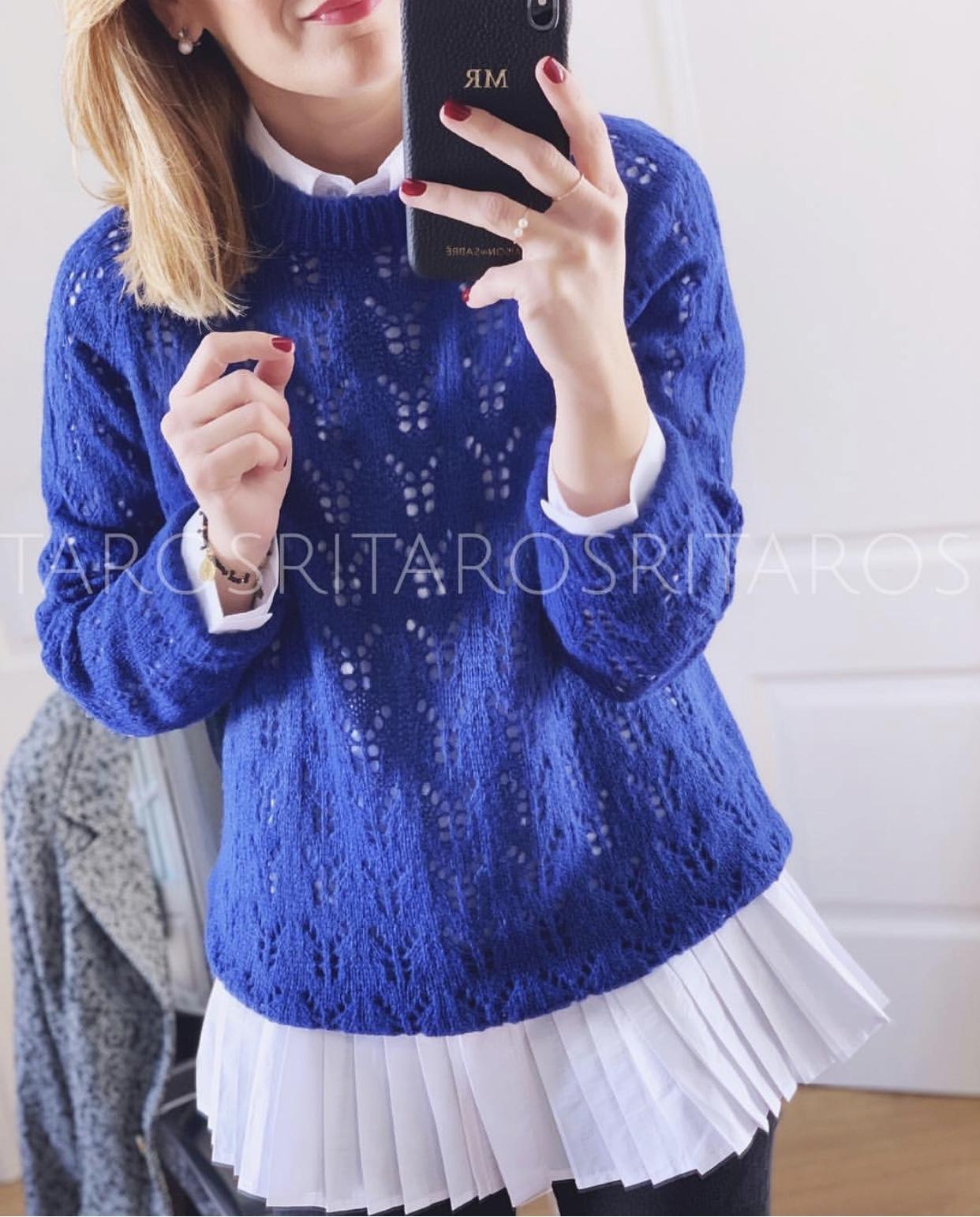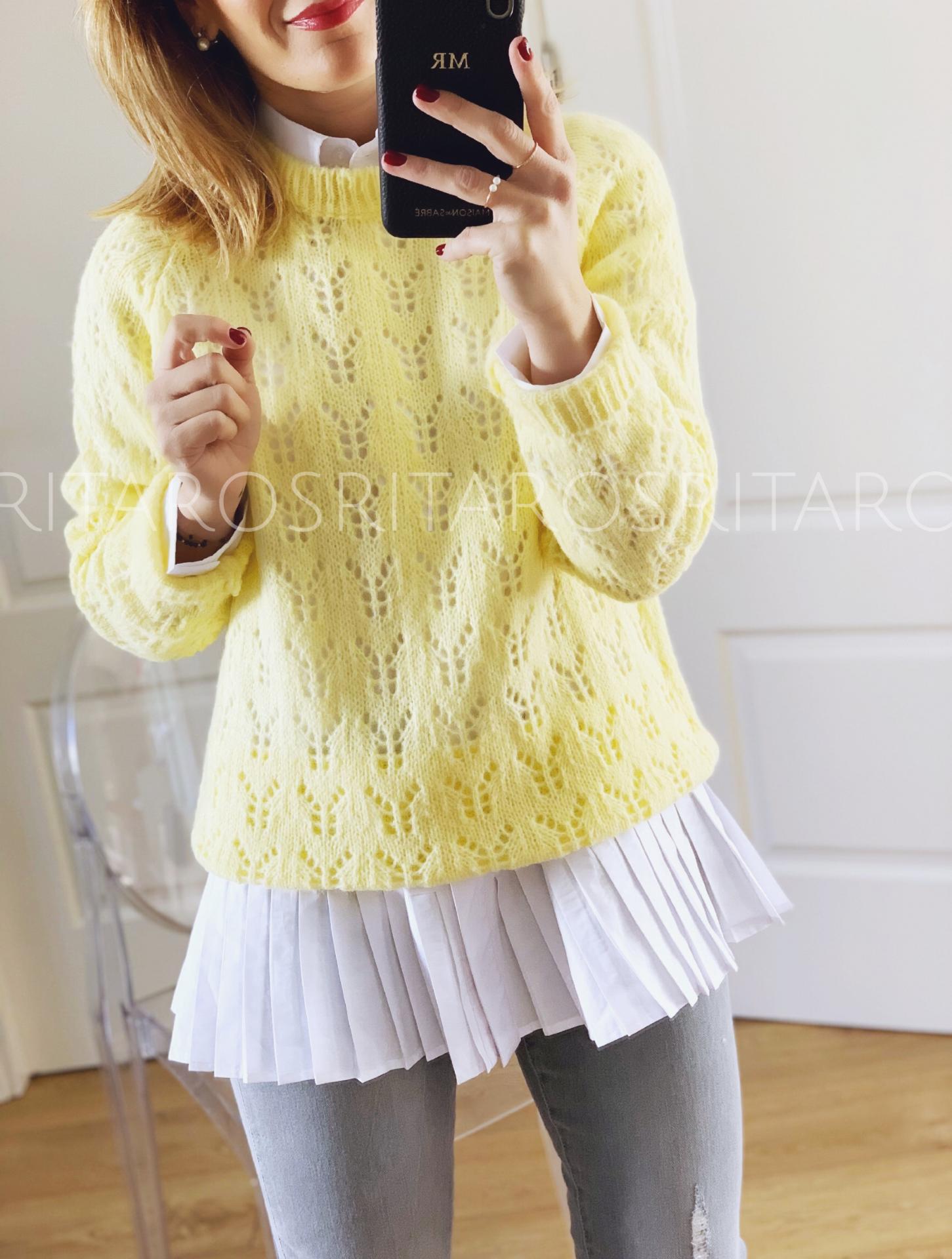 Una cucada de jersey de punto calado perfecto para combinar con la camisa plisada y unos pitillo.
