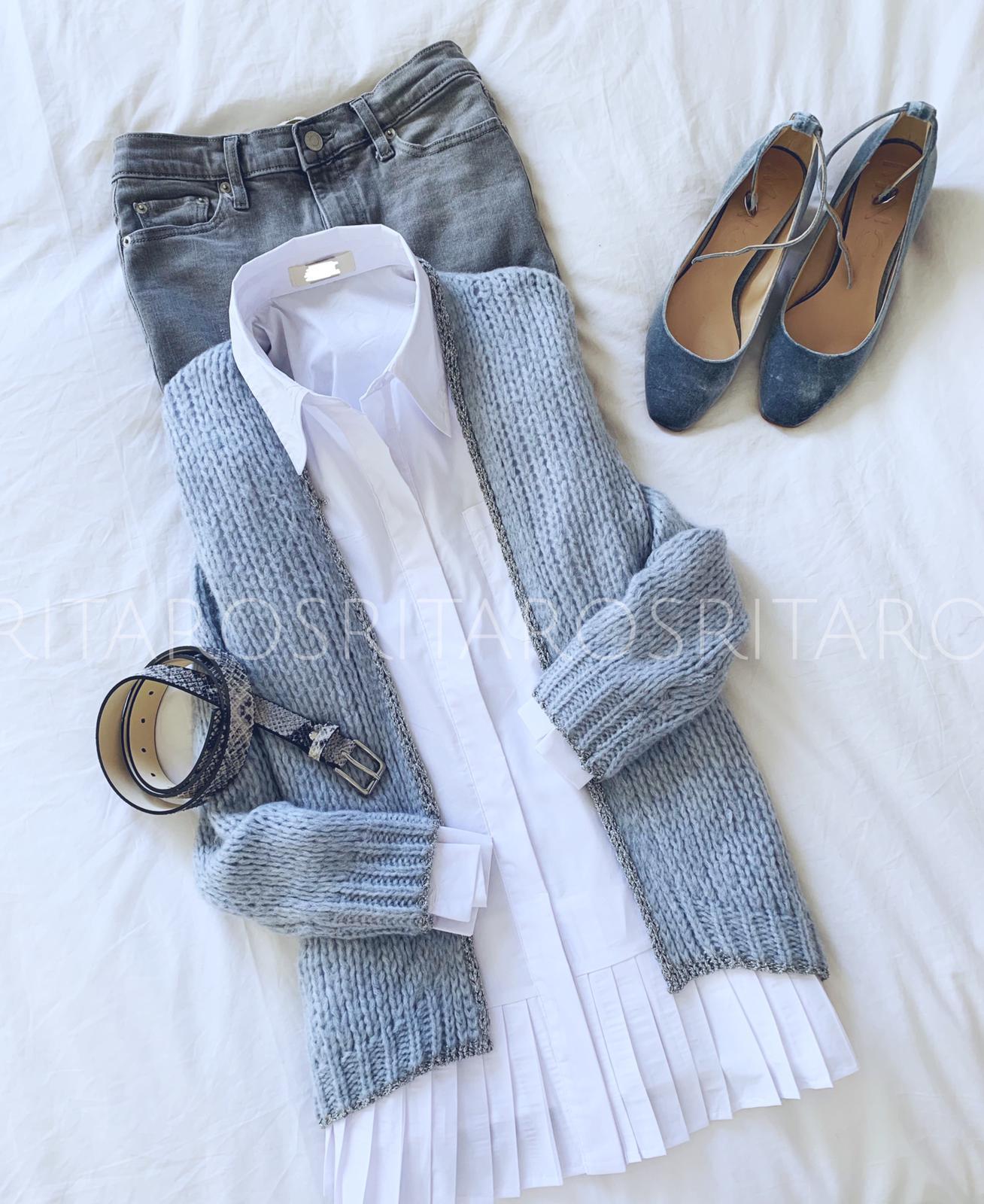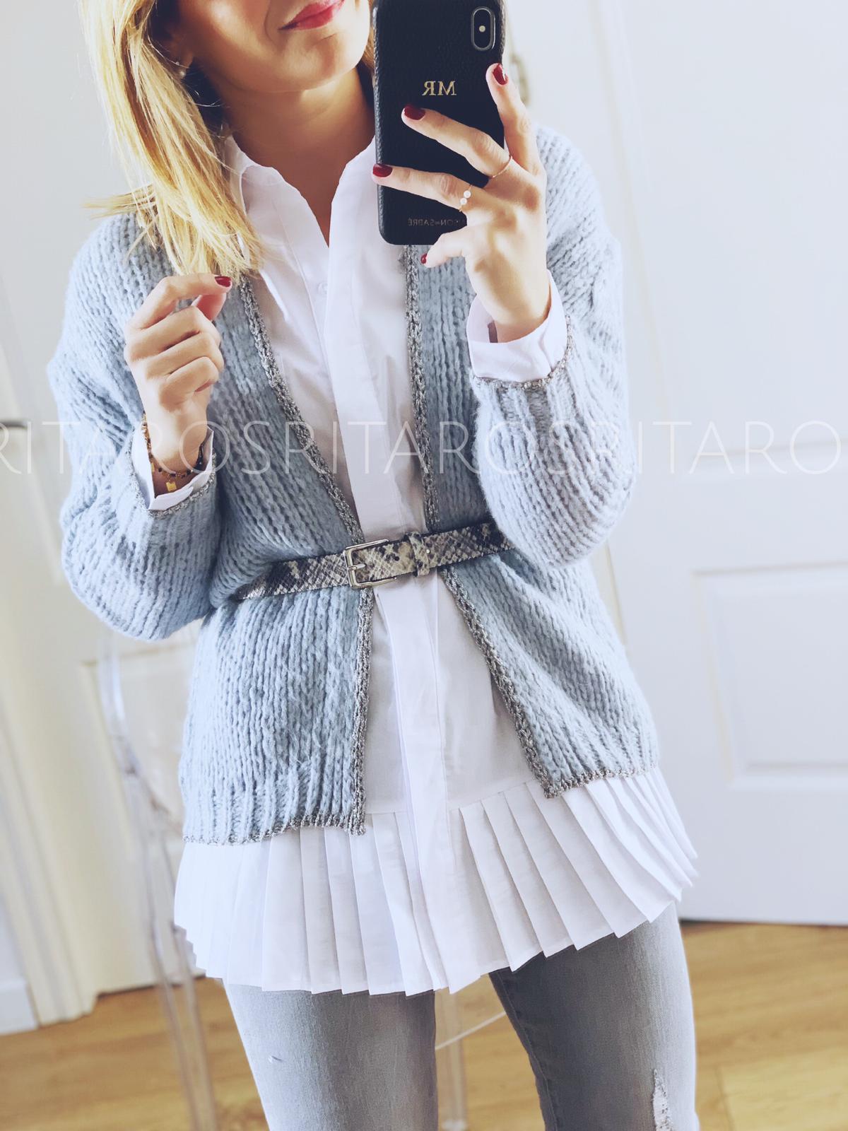 Una monada de cárdigan súper calentito con detalle de hilo plateado en escote y puños.