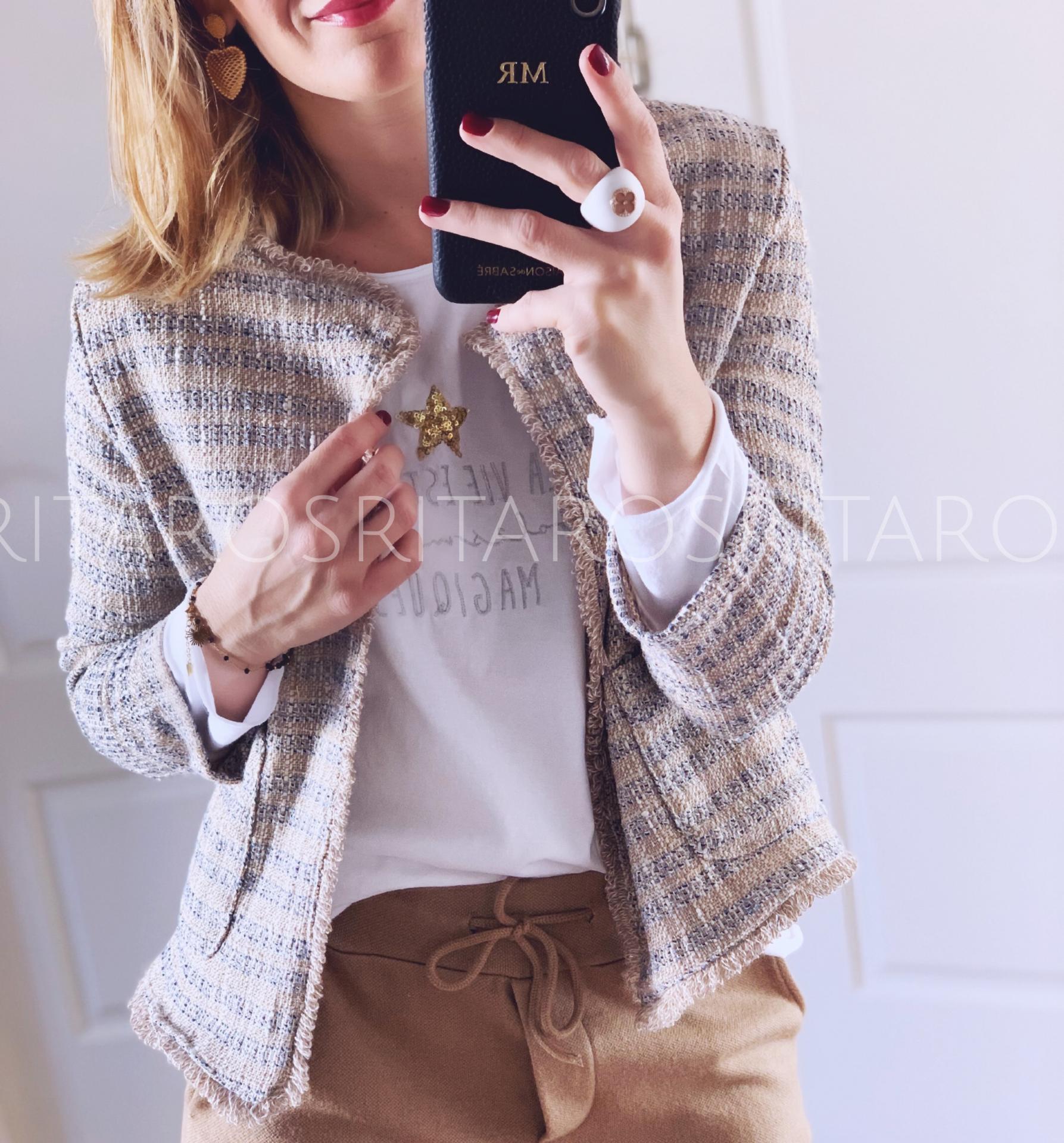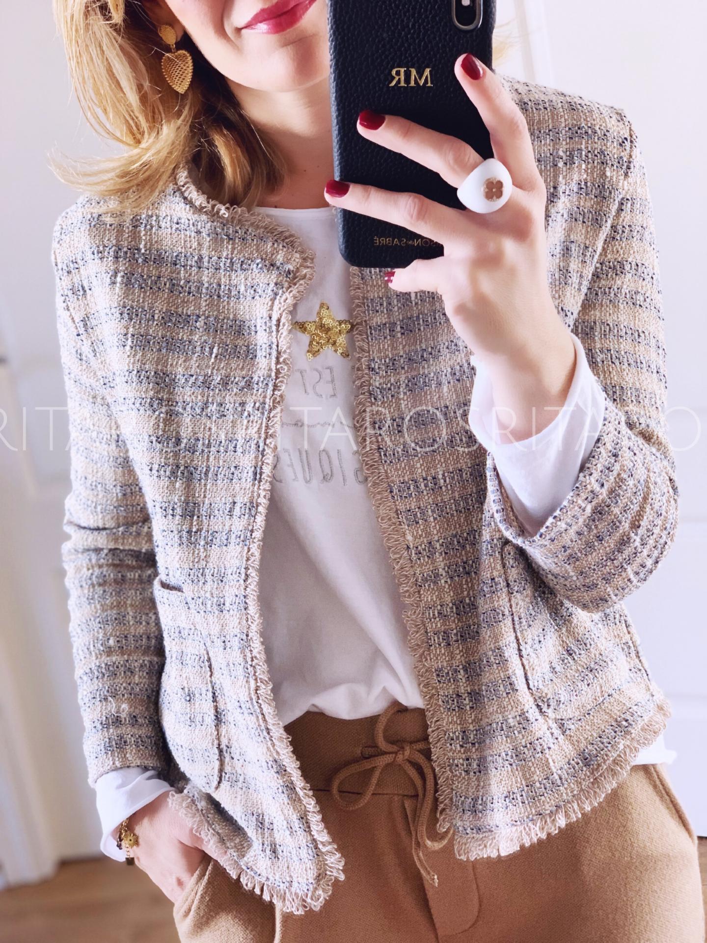 Chaqueta en tejido tweed manga larga en tonos azul y camel. Ribetes desflecados.