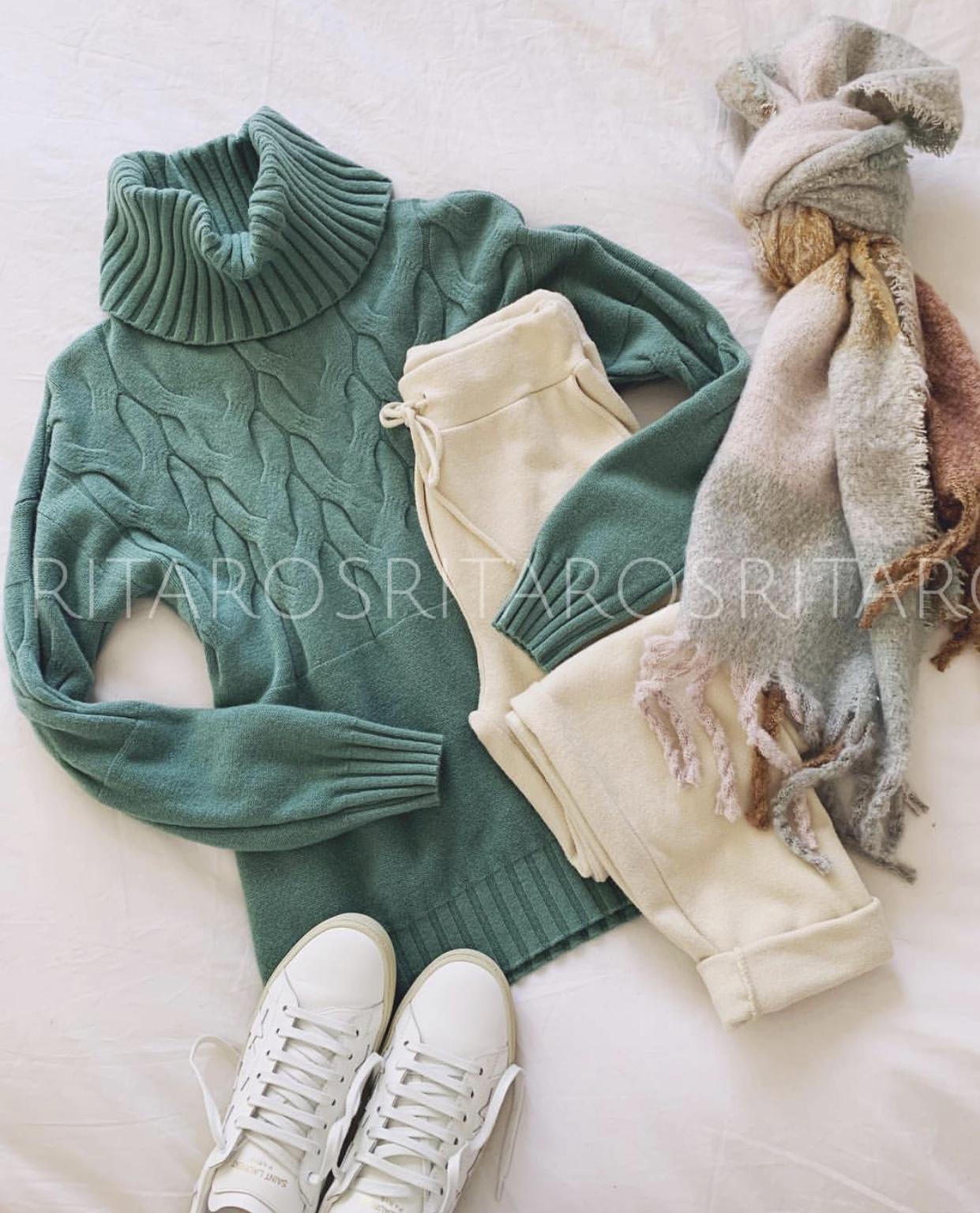 Una monada de jersey con cuello alto y manga larga con un tejido súper amoroso. Lo hemos combinado con nuestro pantalón París en color crema.
