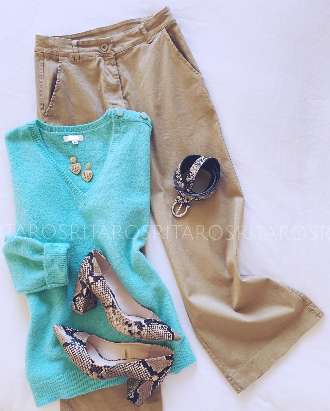 Precioso jersey de punto cuello redondo y manga larga con detalle botones en el hombro. El tejido es una maravilla y el color favorece un montón.