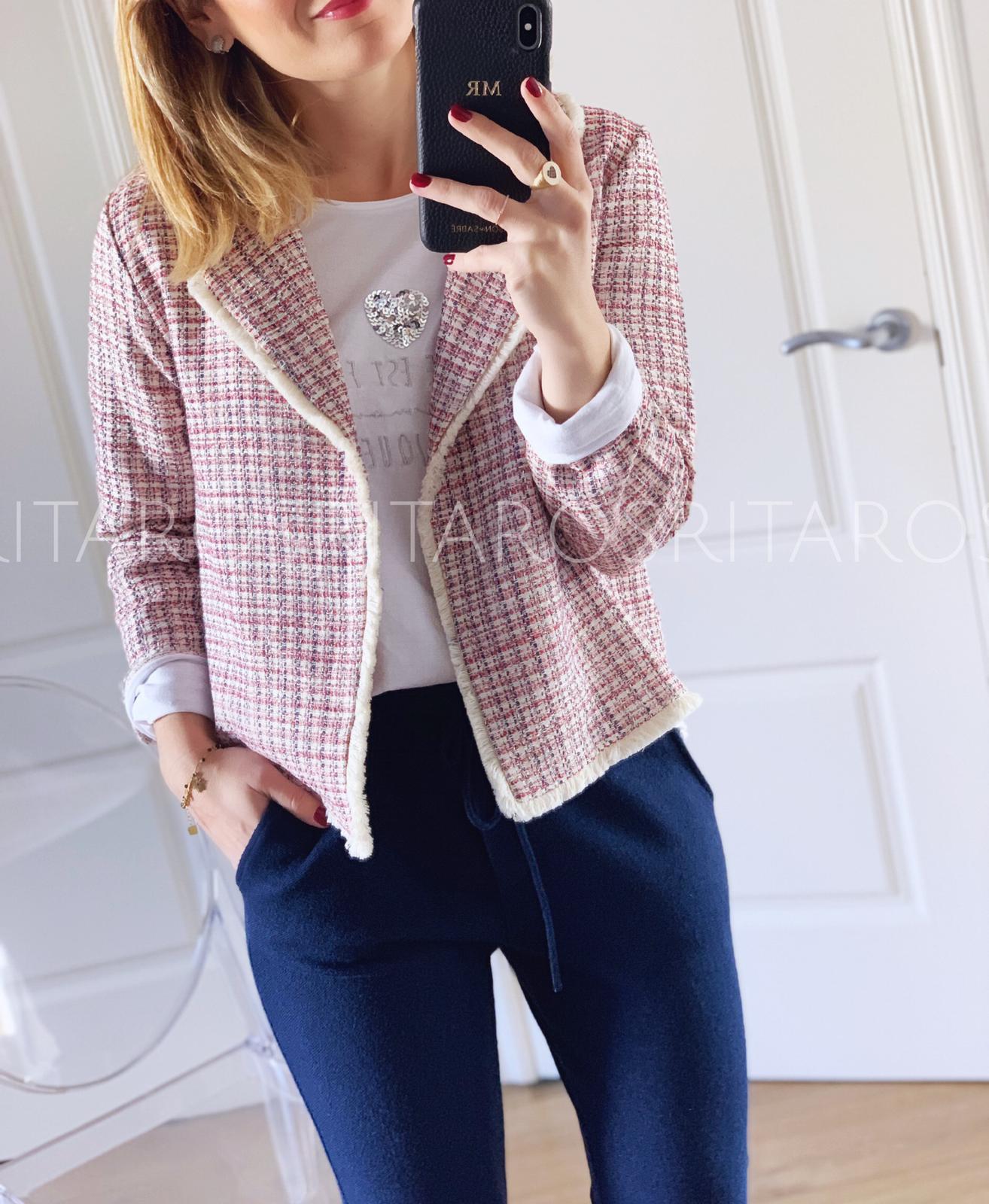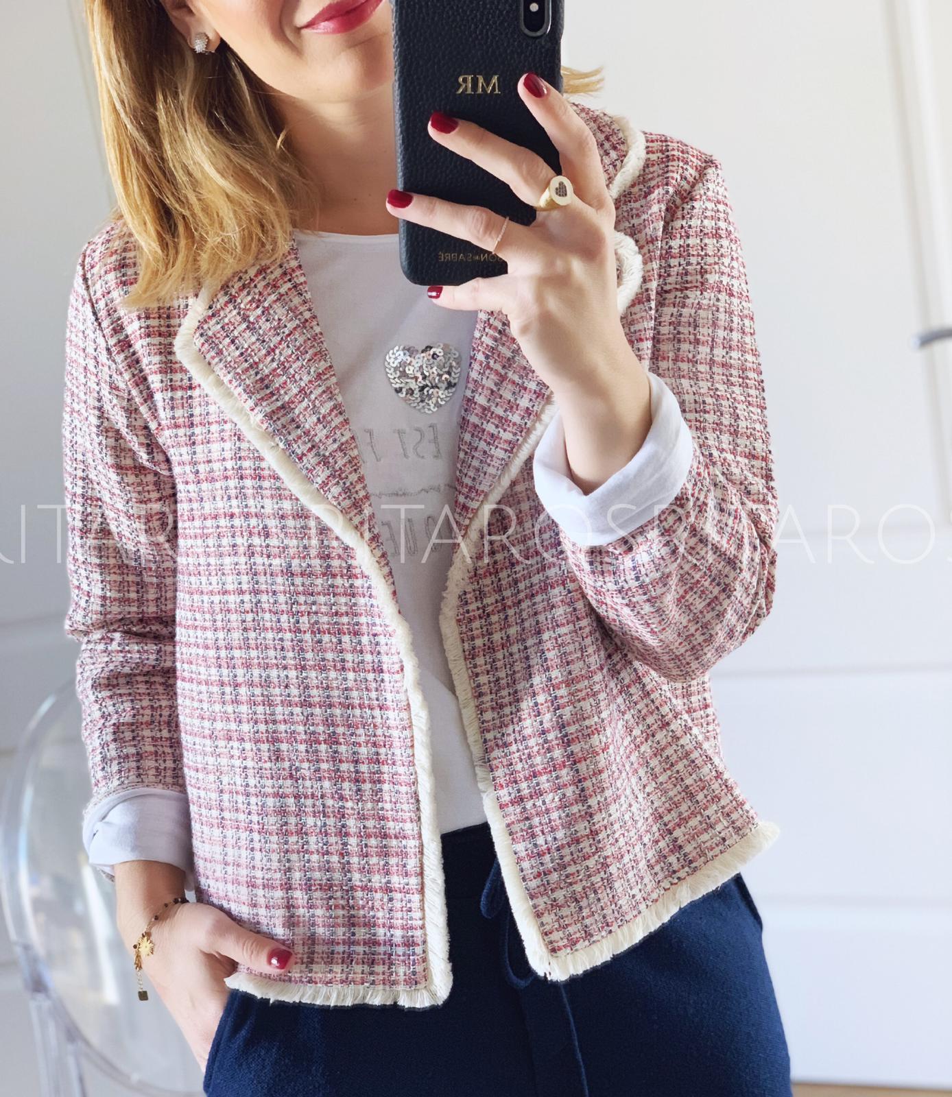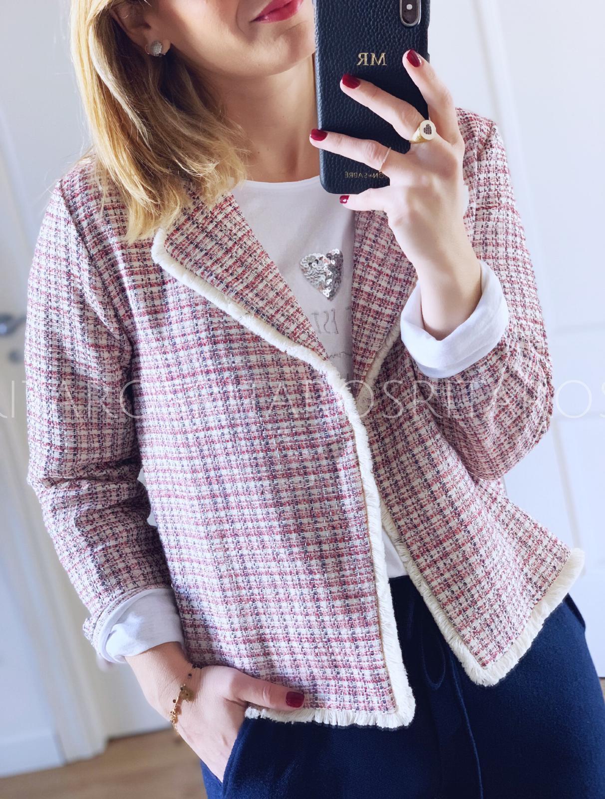 Chaqueta de tejido tweed con cuello y solapa. Combínala con nuestra camiseta heart, pantalón París azul marino y unas zapatillas deportivas y el resultado te encantará.