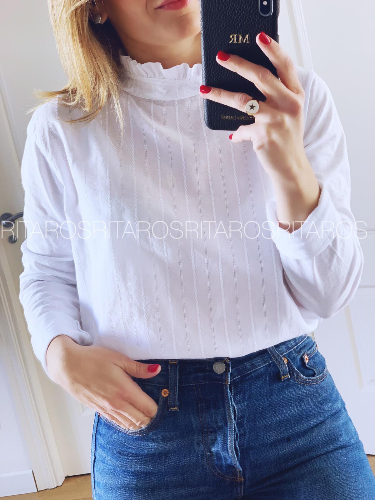 Camiseta con la parte de delante a modo de blusa con cuello mao y volantito. Una prenda versátil súper cómoda que hemos combinado con nuestra levita jaspeada en azul marino.