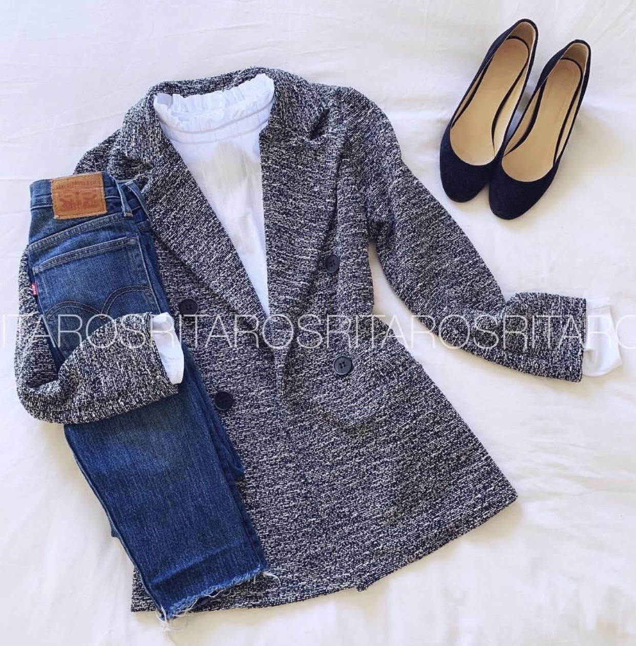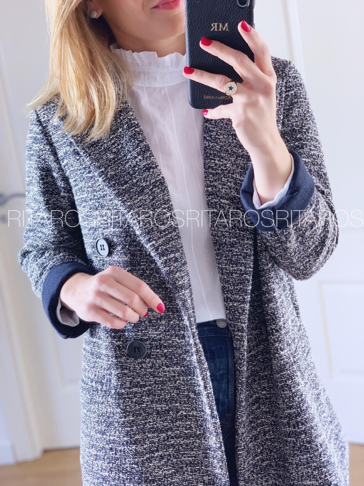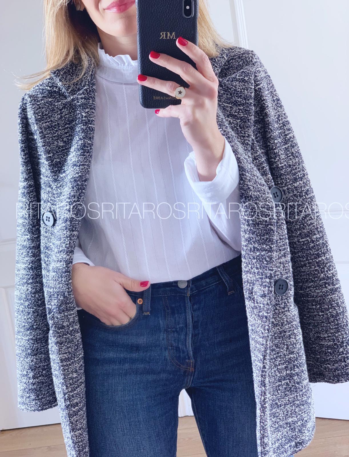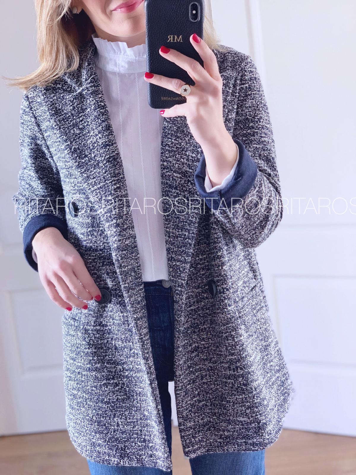 Una monada de levita jaspeada con cuello y solapa. Una chaqueta perfecta y comodísima que hemos combinado con nuestra camiseta Emilie.