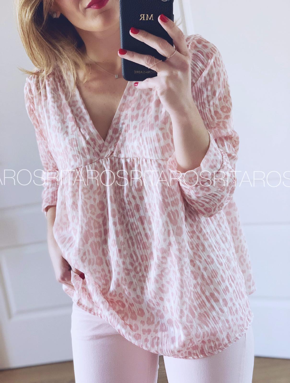 Blusa estampada con escote de pico y manga larga y detalle hilo plateado. Combínala con nuestro pantalón María en rosa y la americana Cotton en beige y te encantará el resultado.
