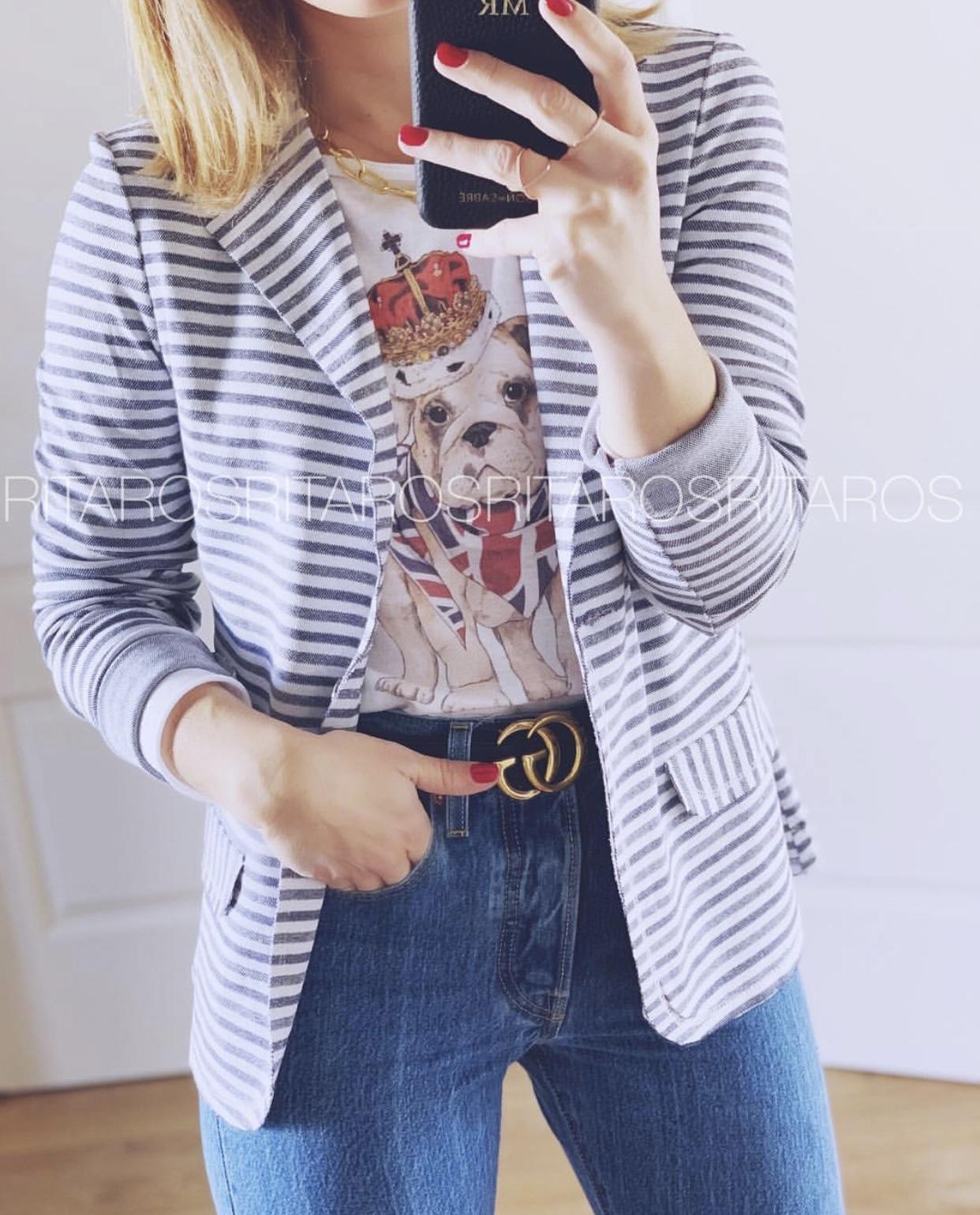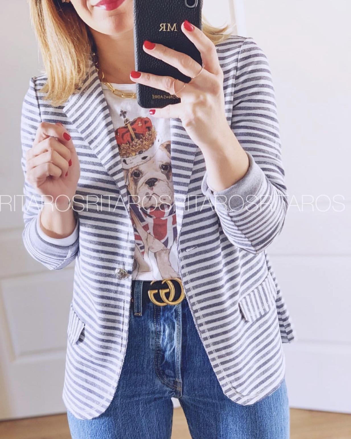Camiseta de manga larga con detalle dibujo. Una prenda perfecta que hemos combinado con nuestra americana de rayas.