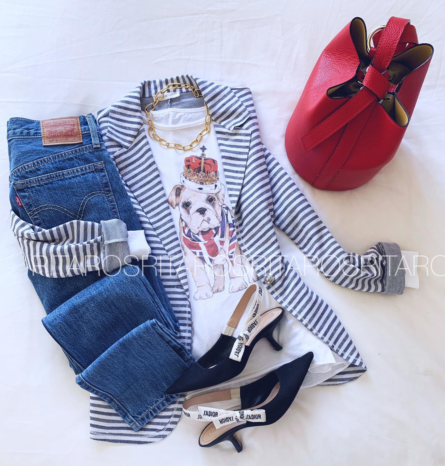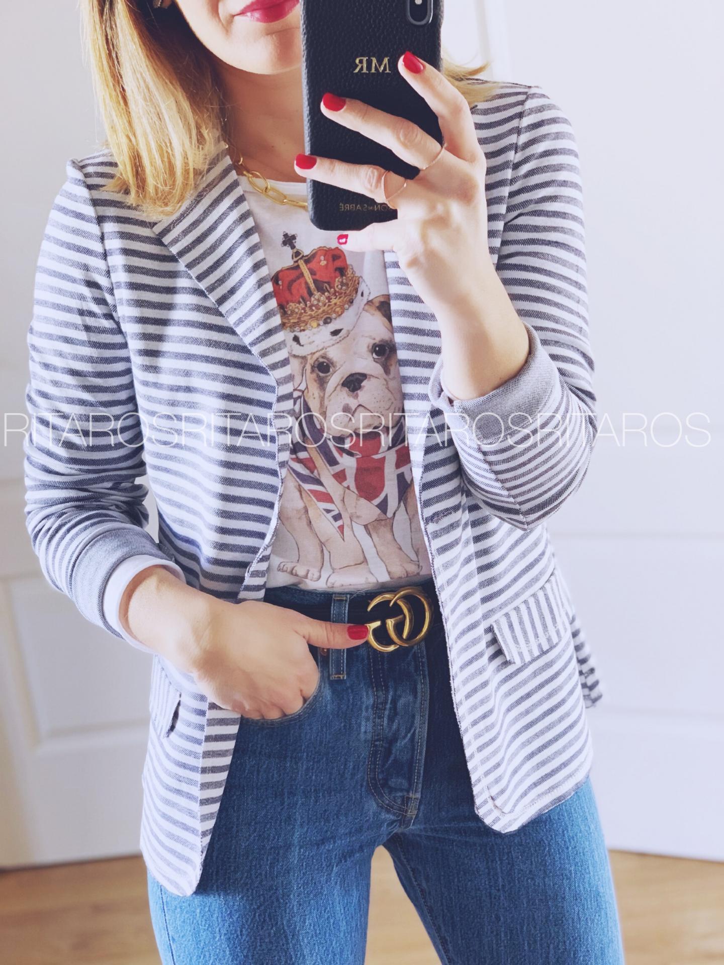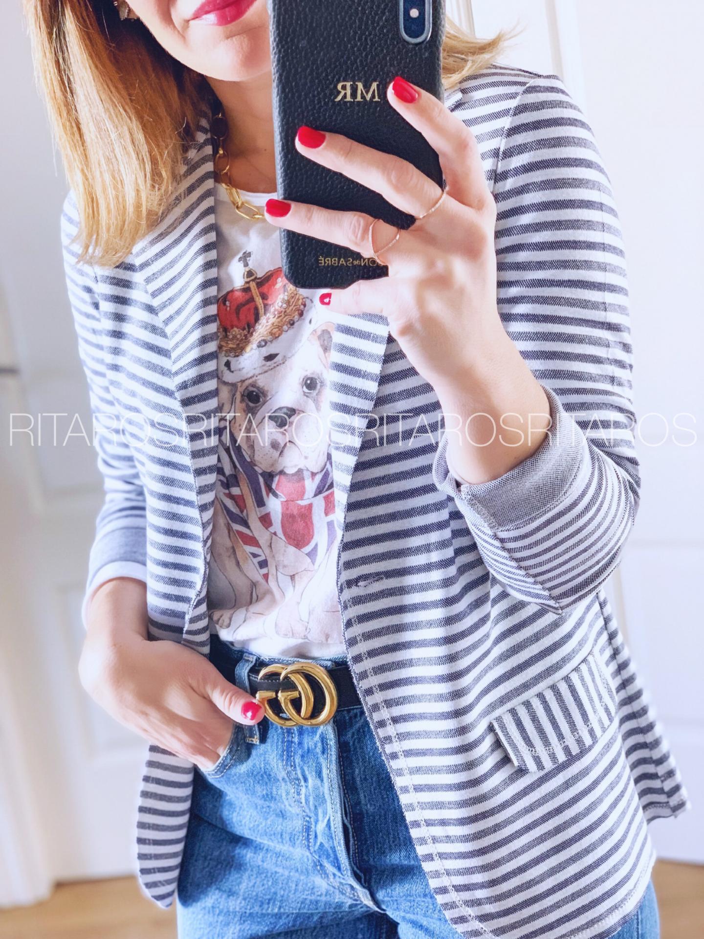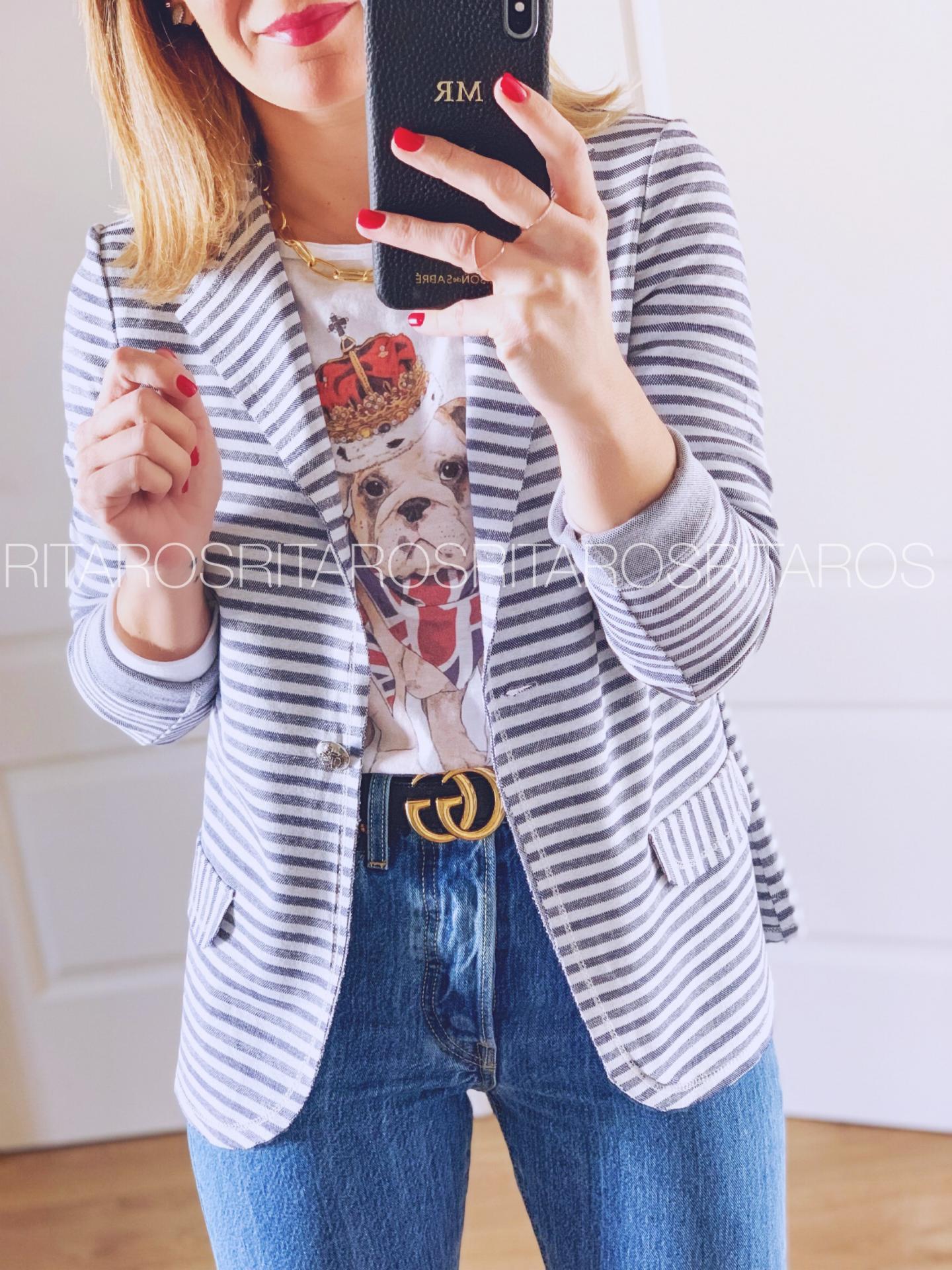 Una monada de americana con cuello y solapa estampada de rayas. Combínala con nuestra camiseta "Dog Quween" y te encantará el resultado.