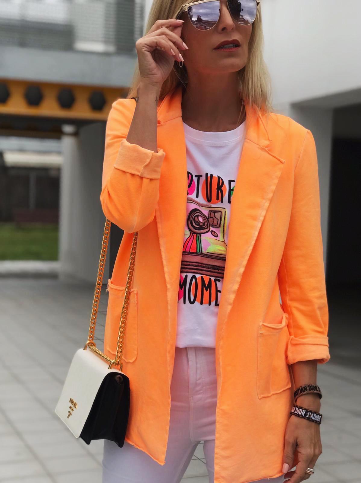 Americana de algodón de corte recto con cuello y solapa. La hemos combinado con nuestra camiseta con mensaje en tonos flúor y nos encanta el resultado.