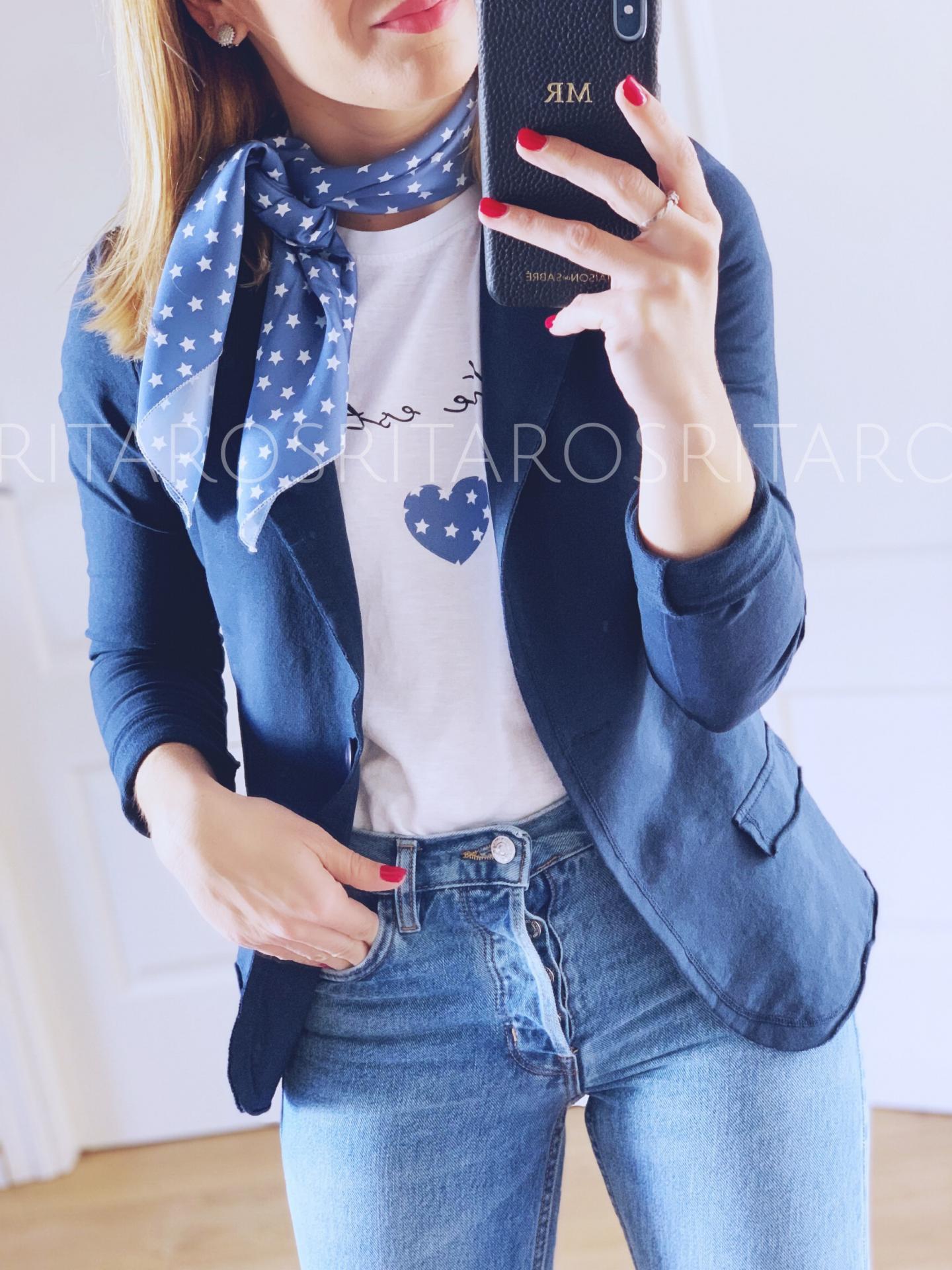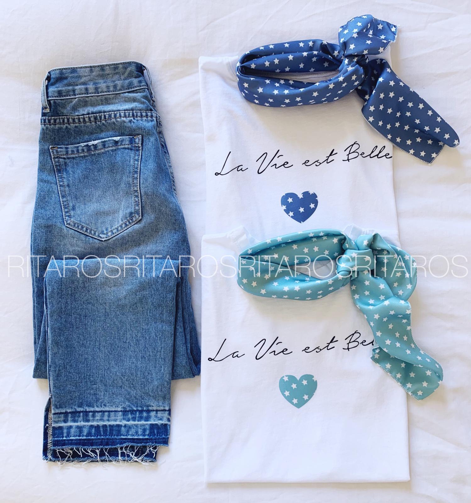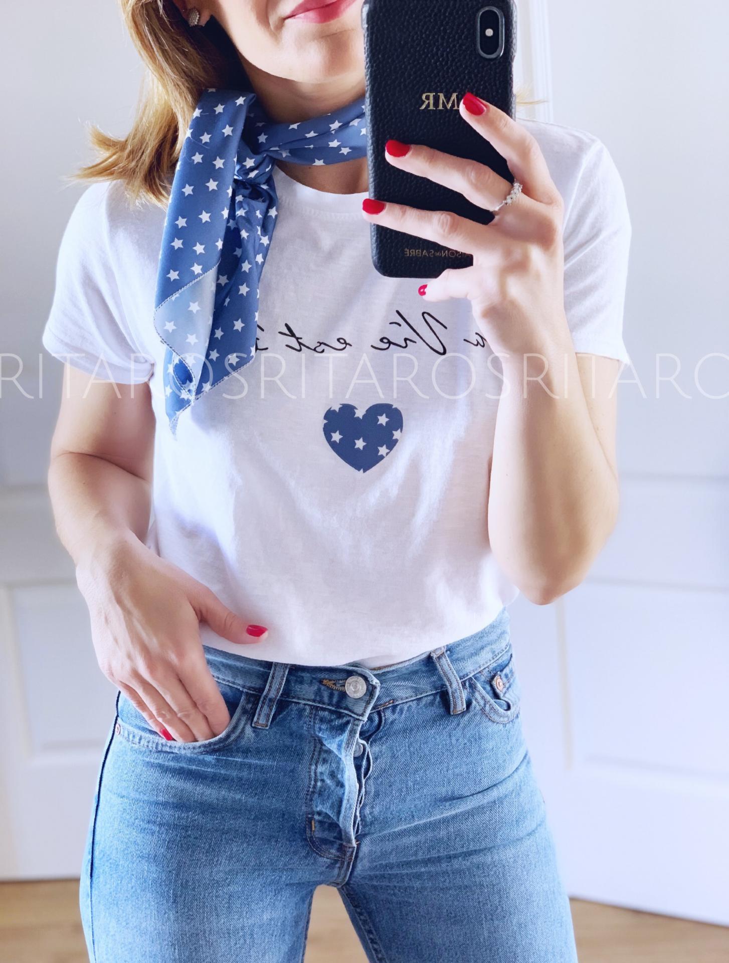 Camiseta de manga corta con detalle mensaje a conjunto con pañuelo. Una prenda y complemento perfectos que hemos combinado con nuestra americana de punto, te encantará el resultado.