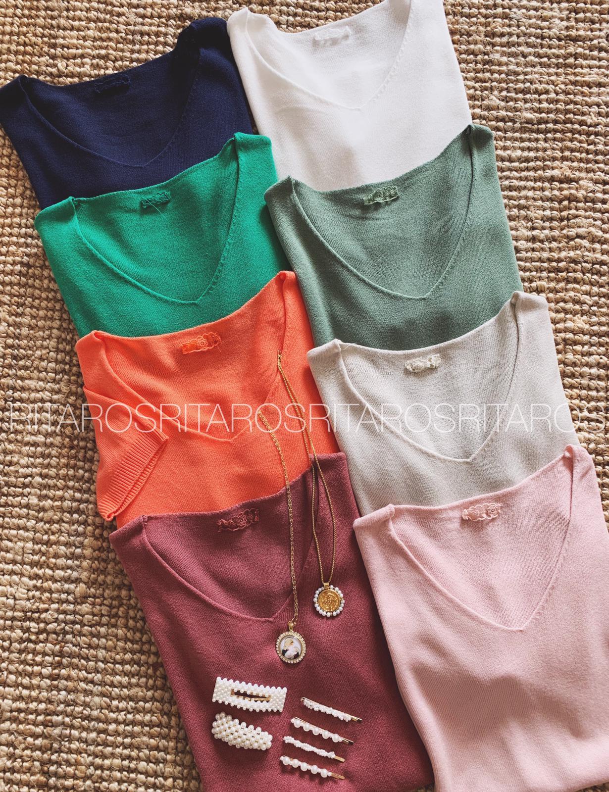 Jersey de punto fino manga corta y escote de pico. Una prenda perfecta que llevarás mucho a diario.