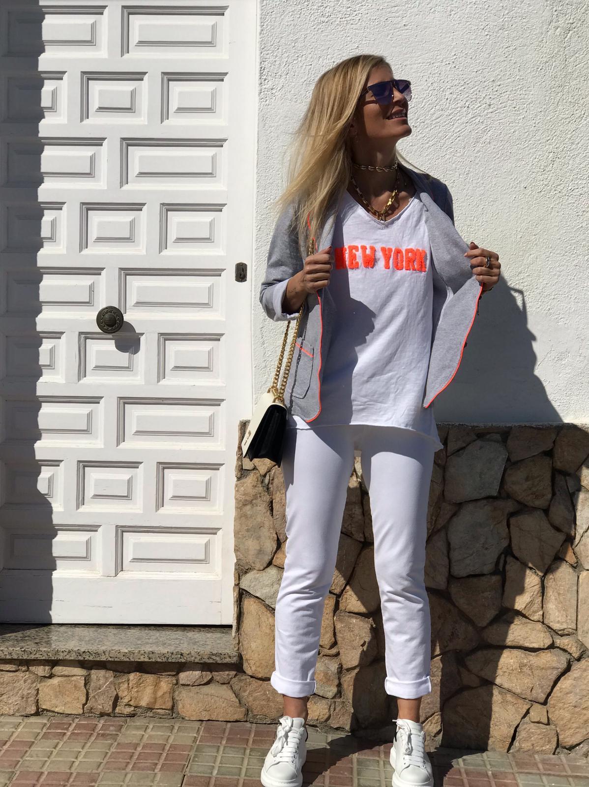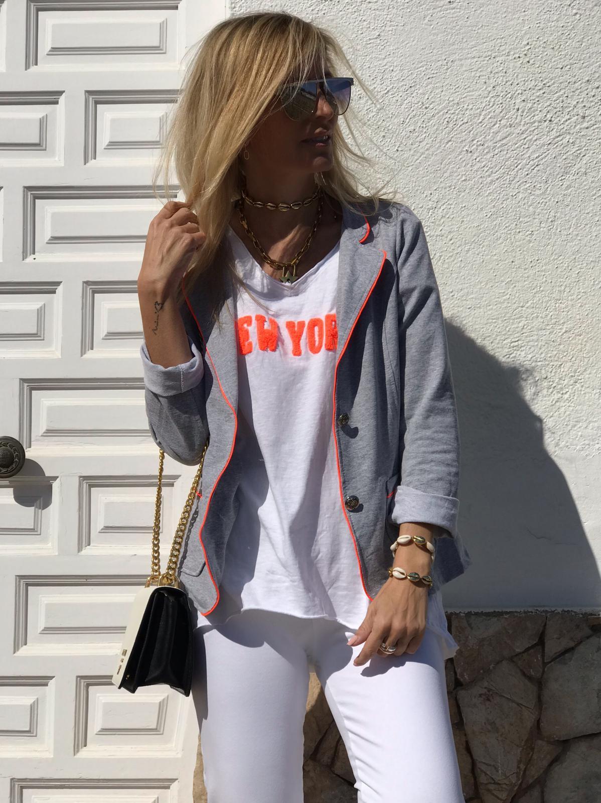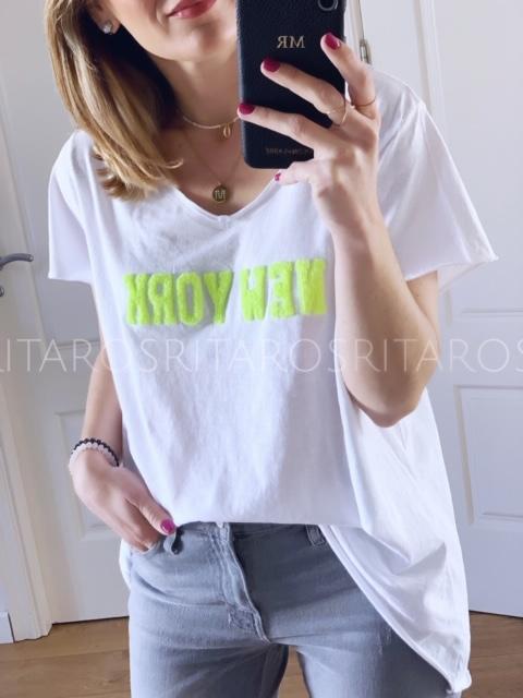 Camiseta de manga corta y cuello de pico con detalle mensaje. Combínala con nuestra chaqueta Tweed flúor, te encantará el resultado.