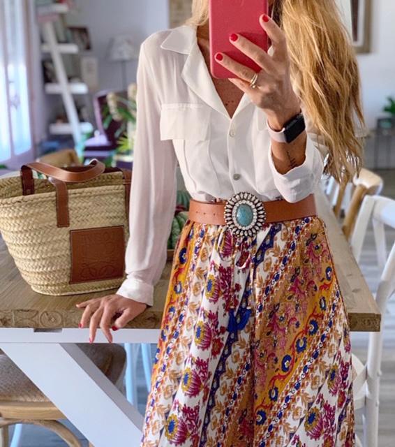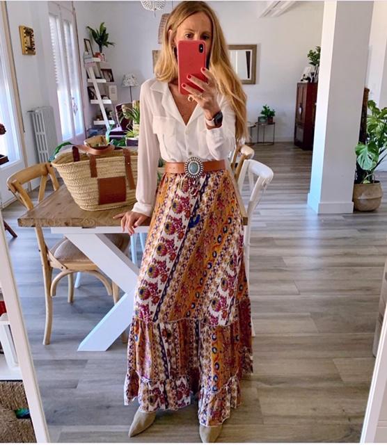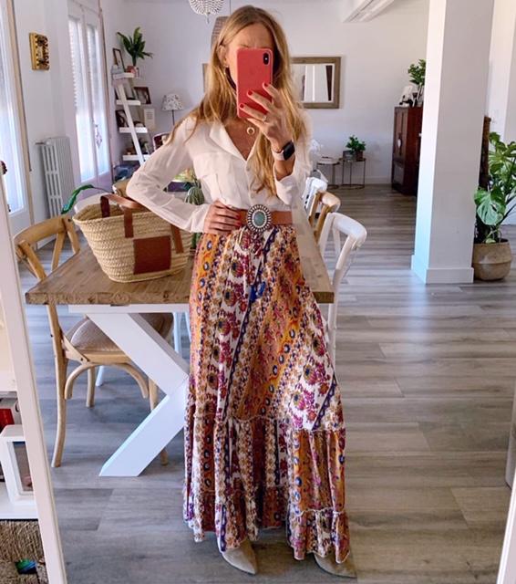Falda larga de vuelo estampada con cintura elástica por detrás y cinta para anudar acabada en pompón.