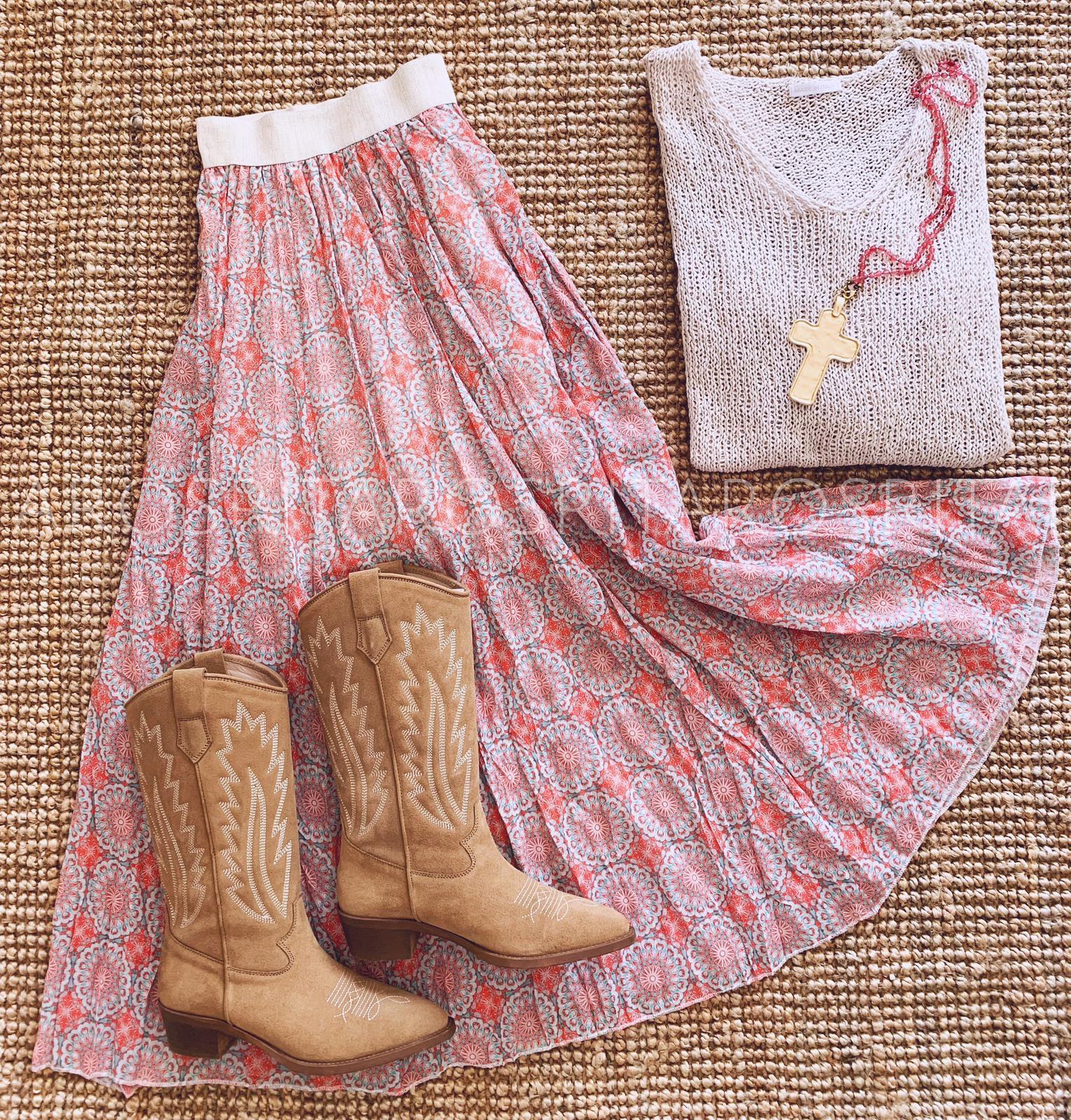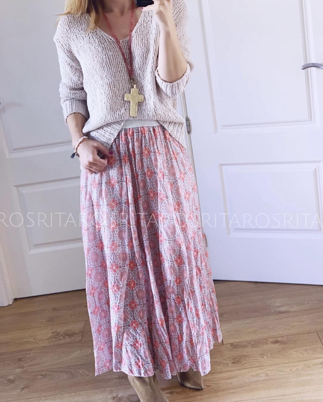 Una monada de falda larga estampada y cintura con goma elástica. Combínala con nuestro jersey Anna y te encantará el resultado.