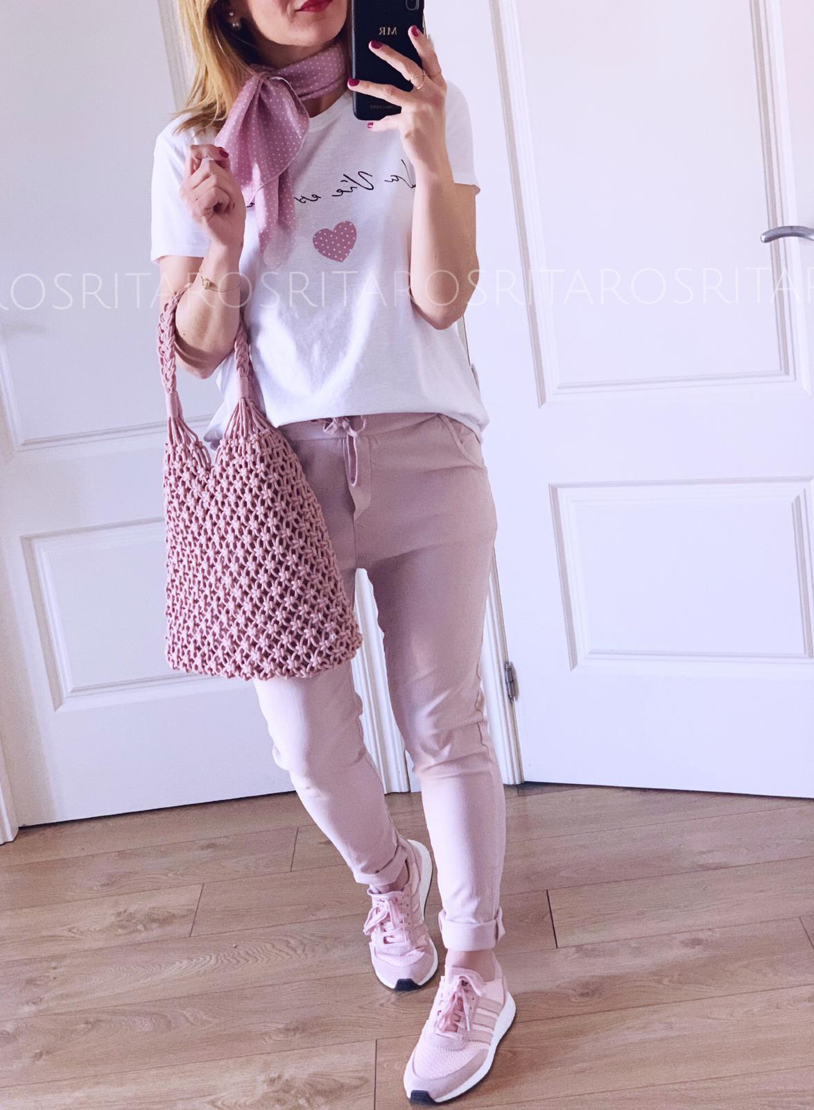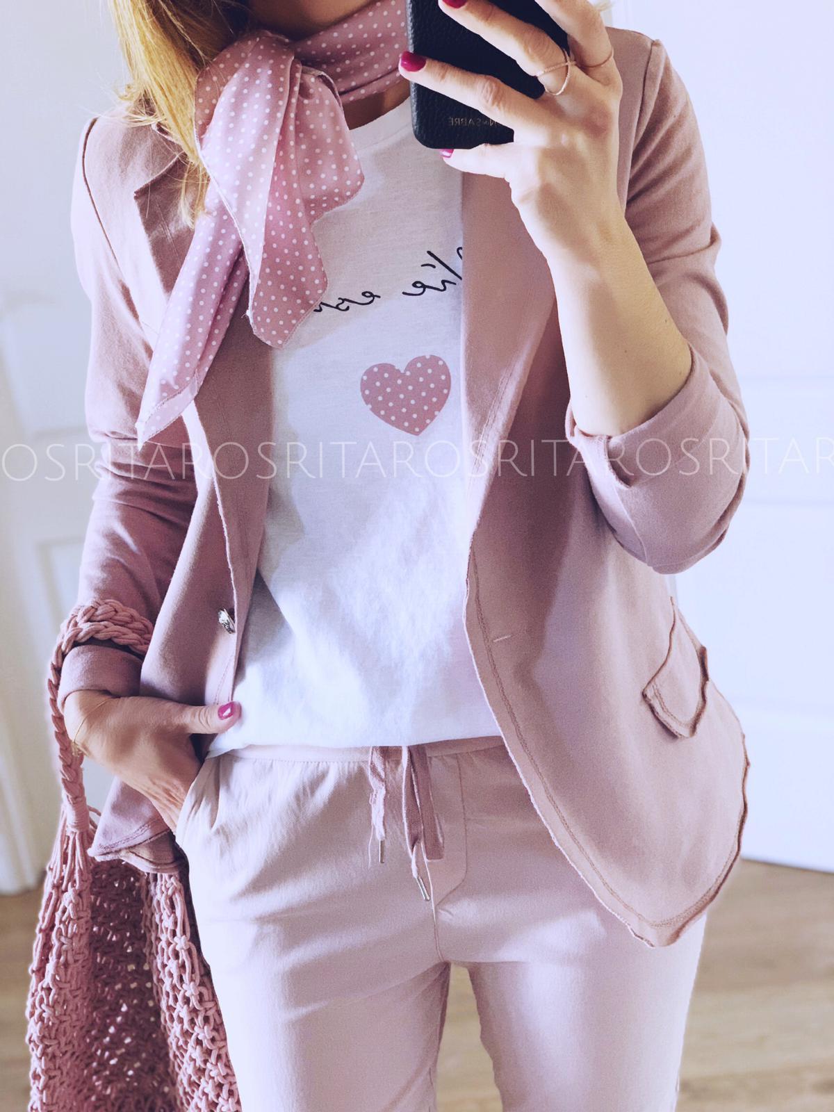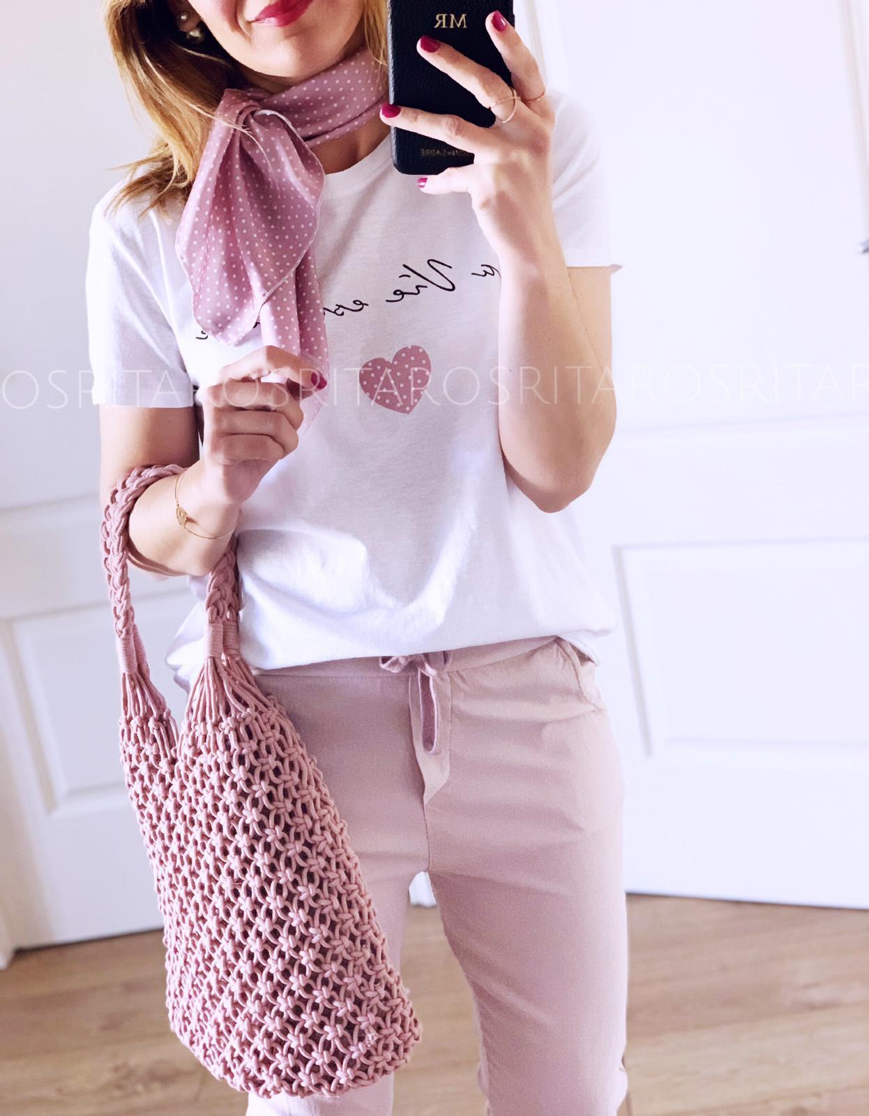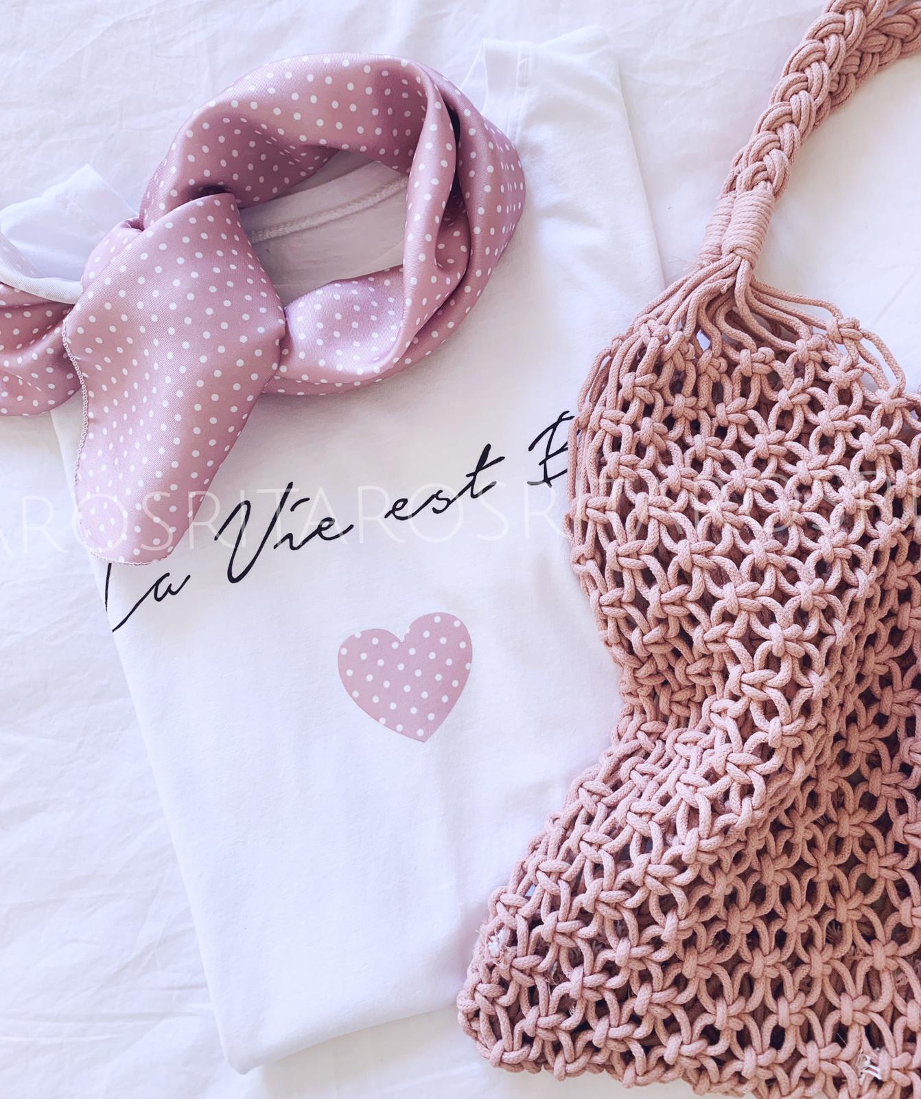 Camiseta de manga corta con detalle mensaje a conjunto con pañuelo. Una prenda y complemento perfectos que hemos combinado con nuestra americana cotton, te encantará el resultado.