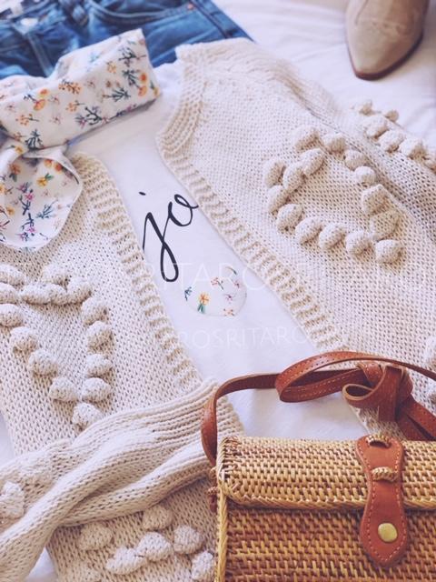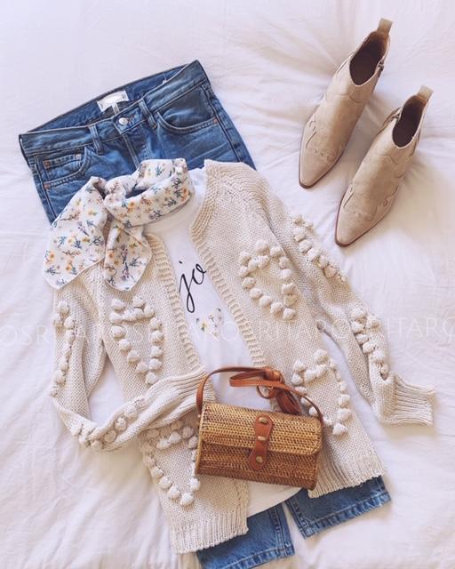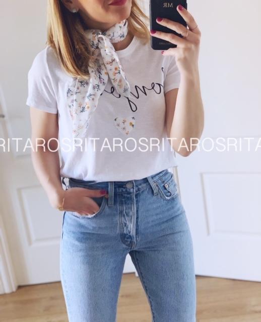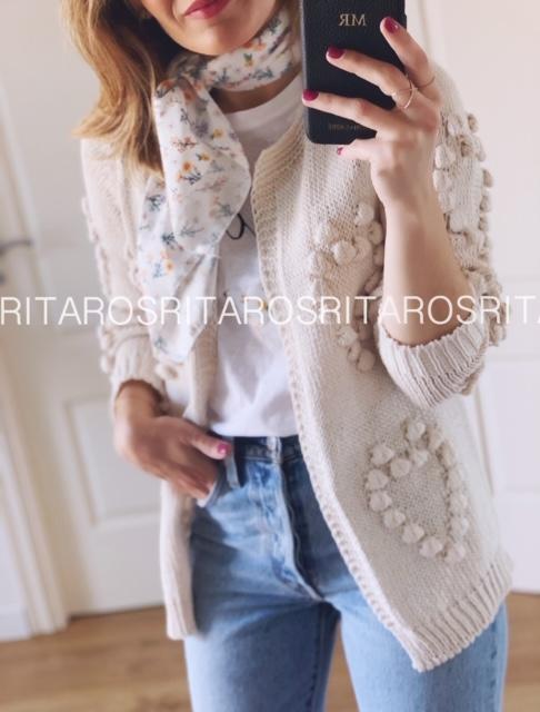 Camiseta de manga corta con detalle mensaje a conjunto con pañuelo. Una prenda y complemento perfectos que hemos combinado con nuestro Cárdigan Corazones en beige, te encantará el resultado.