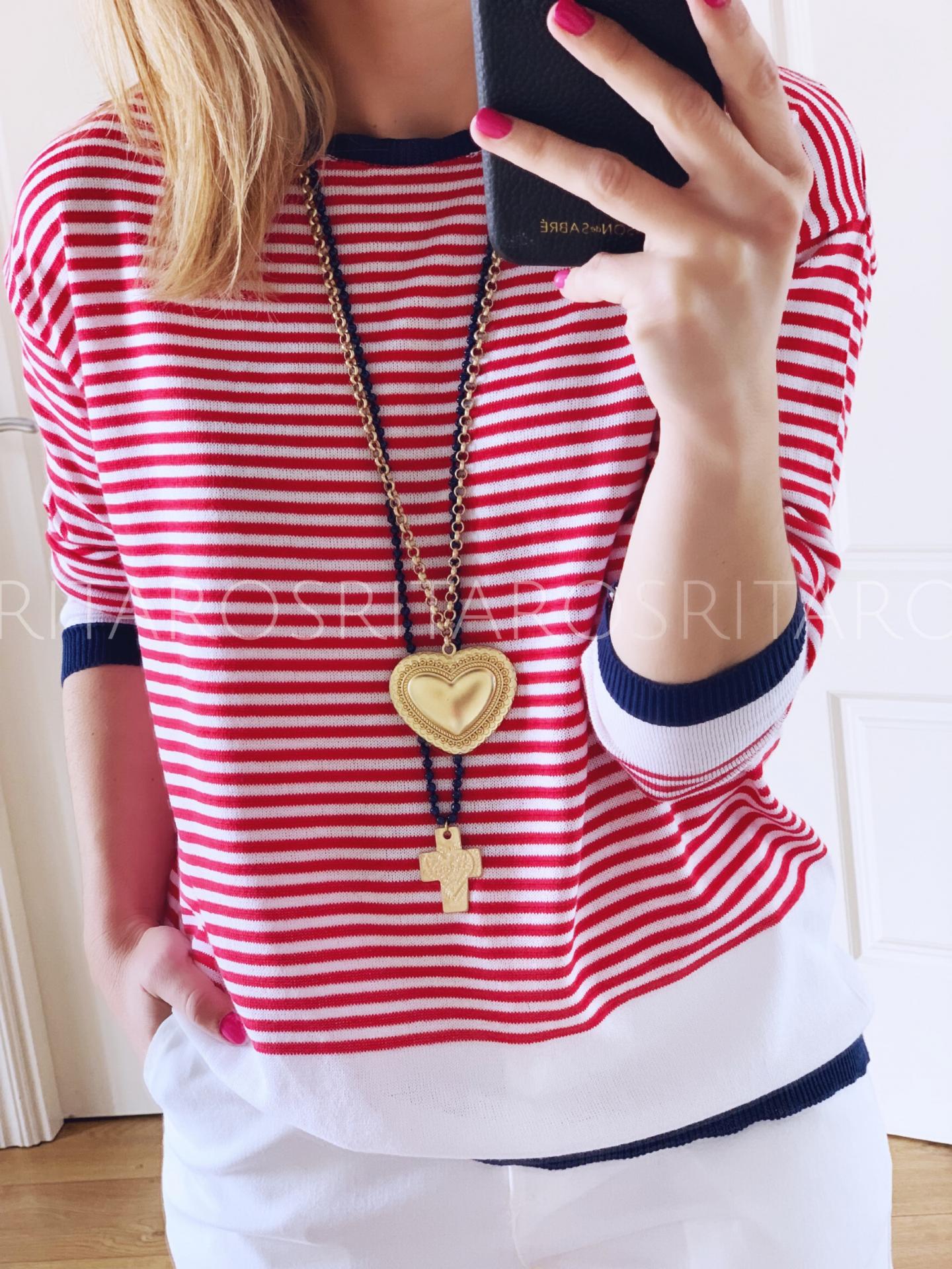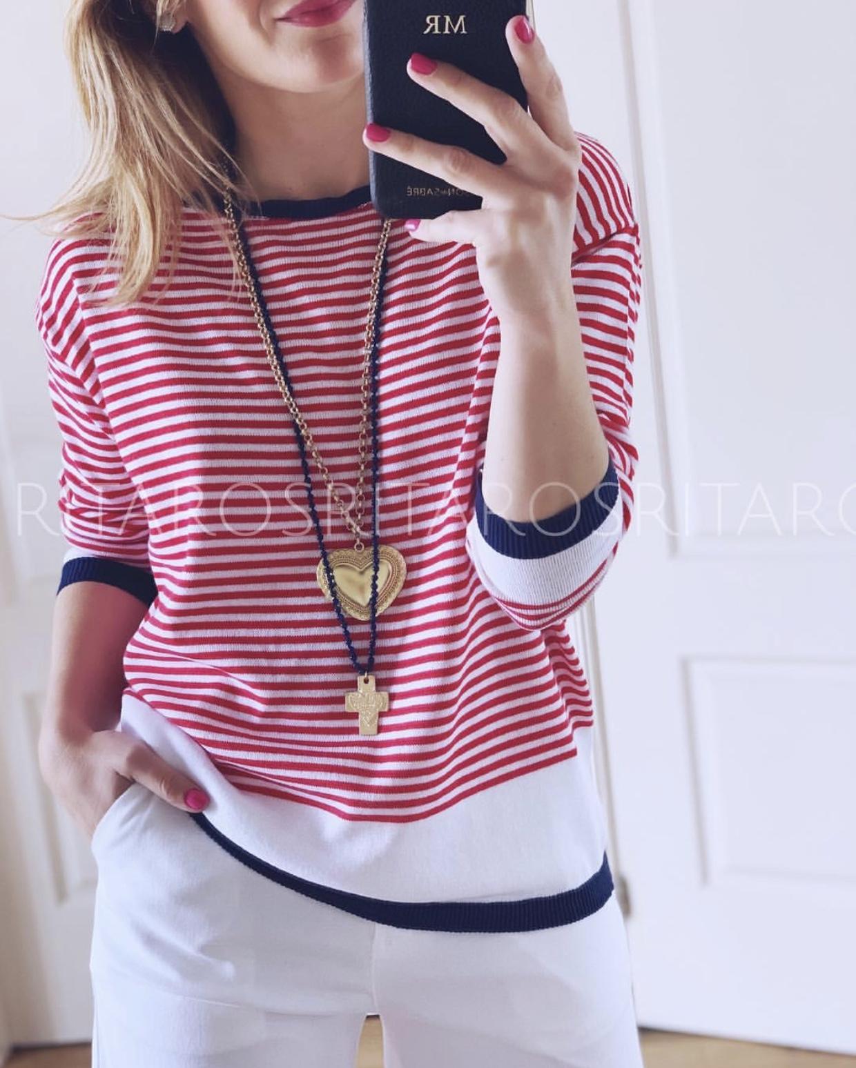 Una monada de jersey de punto en manga larga estampado de rayas. Combínalo con unos jeans en blanco y nuestro bolso Navy y te encantará el resultado.