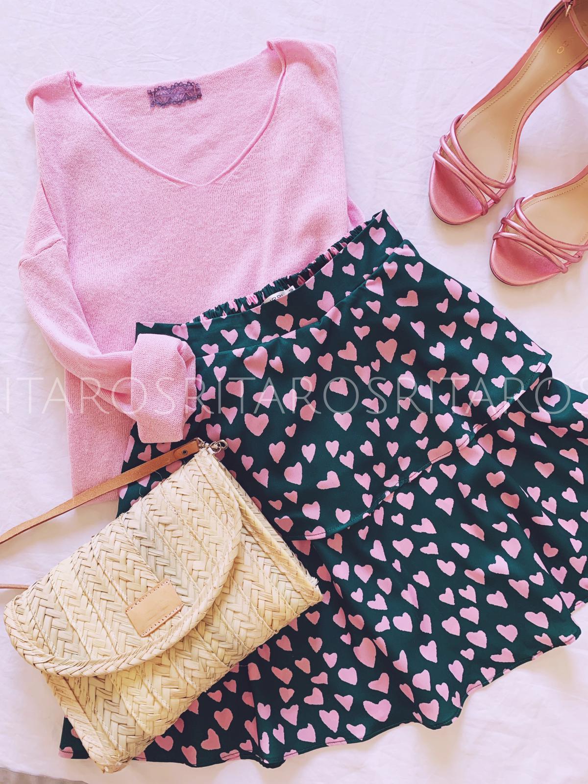 Jersey ancho de punto fino de manga larga con escote de pico. Una prenda ideal para usar a diario que hemos combinado en color rosa con nuestra falda plisada Lucía. Un look perfecto que te encantará.