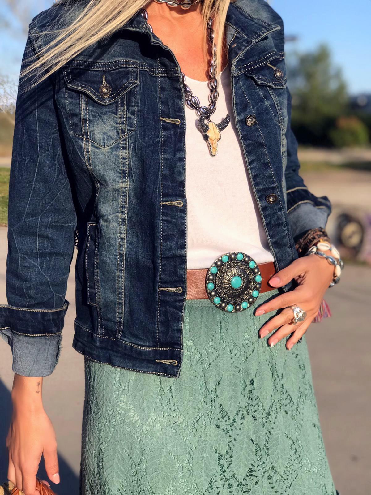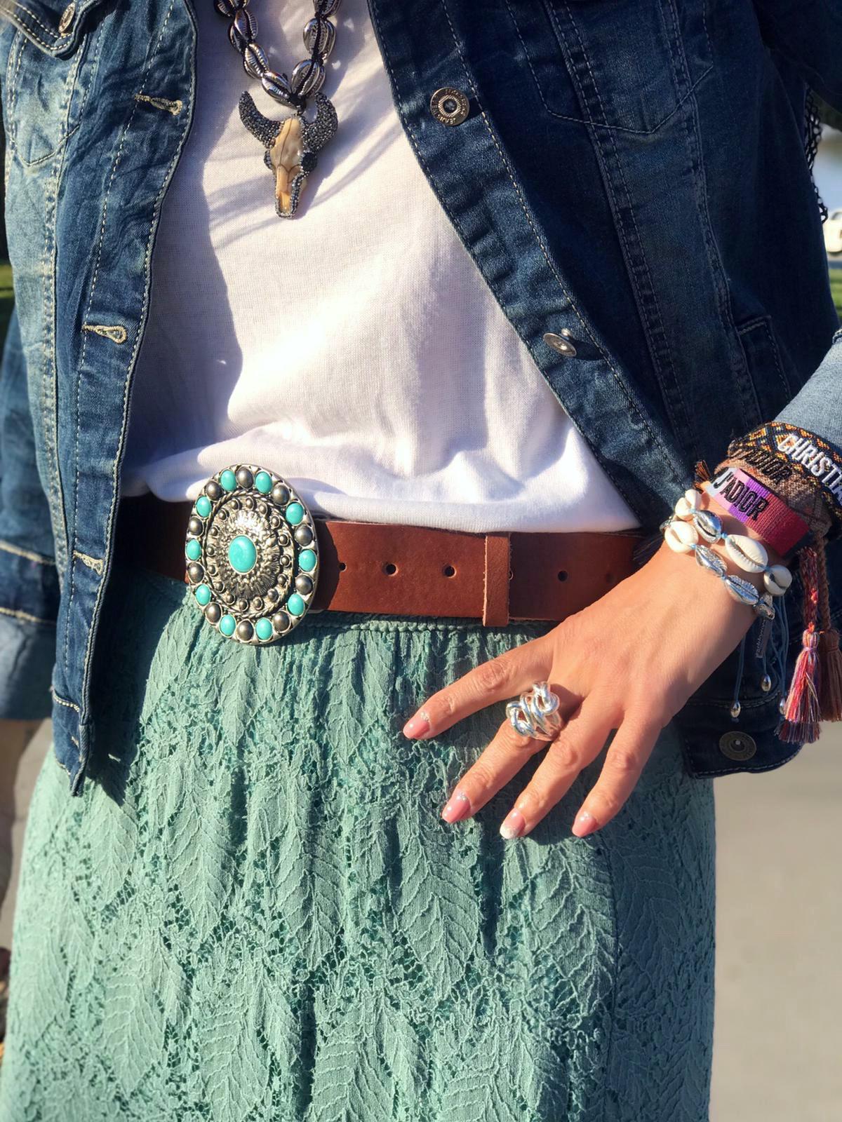 Cinturón de piel con hebilla redonda y piedras en color turquesa. Lo hemos combinado con nuestra falda Laura en color verde agua y nos encanta la combinación.