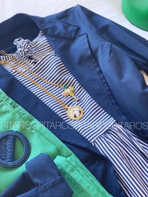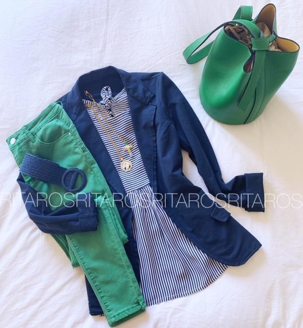 Pantalón pitillo elástico con 5 bolsillos y cerrado con botón y cremallera. Combínalo con nuestra americana Cotton en azul marino, nuestra camisa Natalie de rayas en azul marino, cinturón elástico azul marino y bolso bombonera en color verde, el look es perfecto.