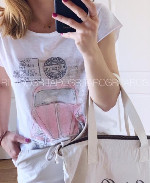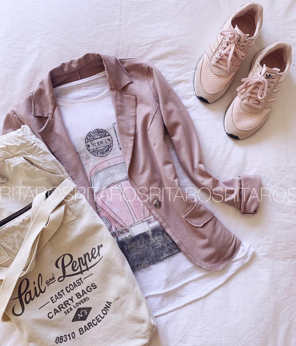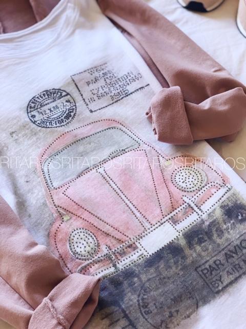 Camiseta de algodón de manga corta con un estampado monísimo. La hemos combinado con nuestra americana Cotton en rosa Palo y el pantalón Dalia, la combinación es perfecta.