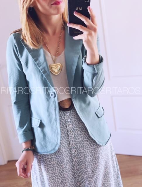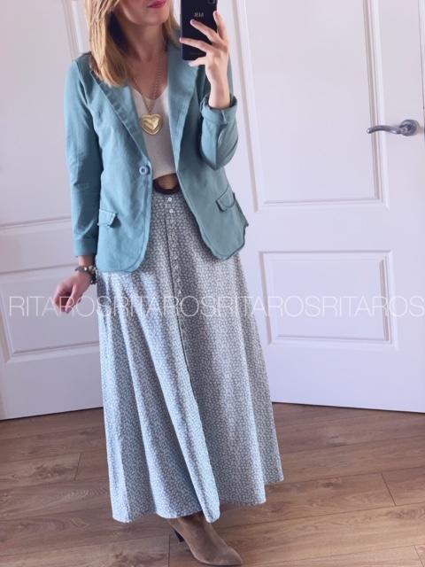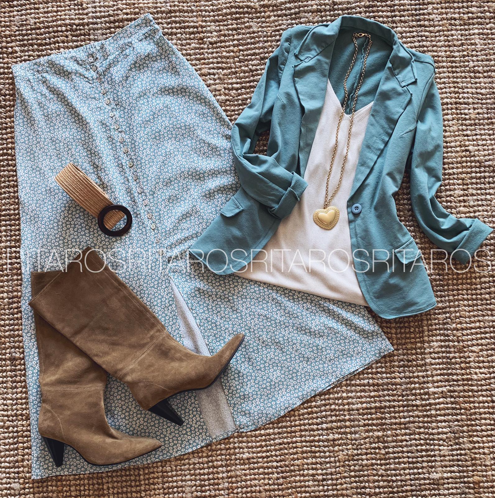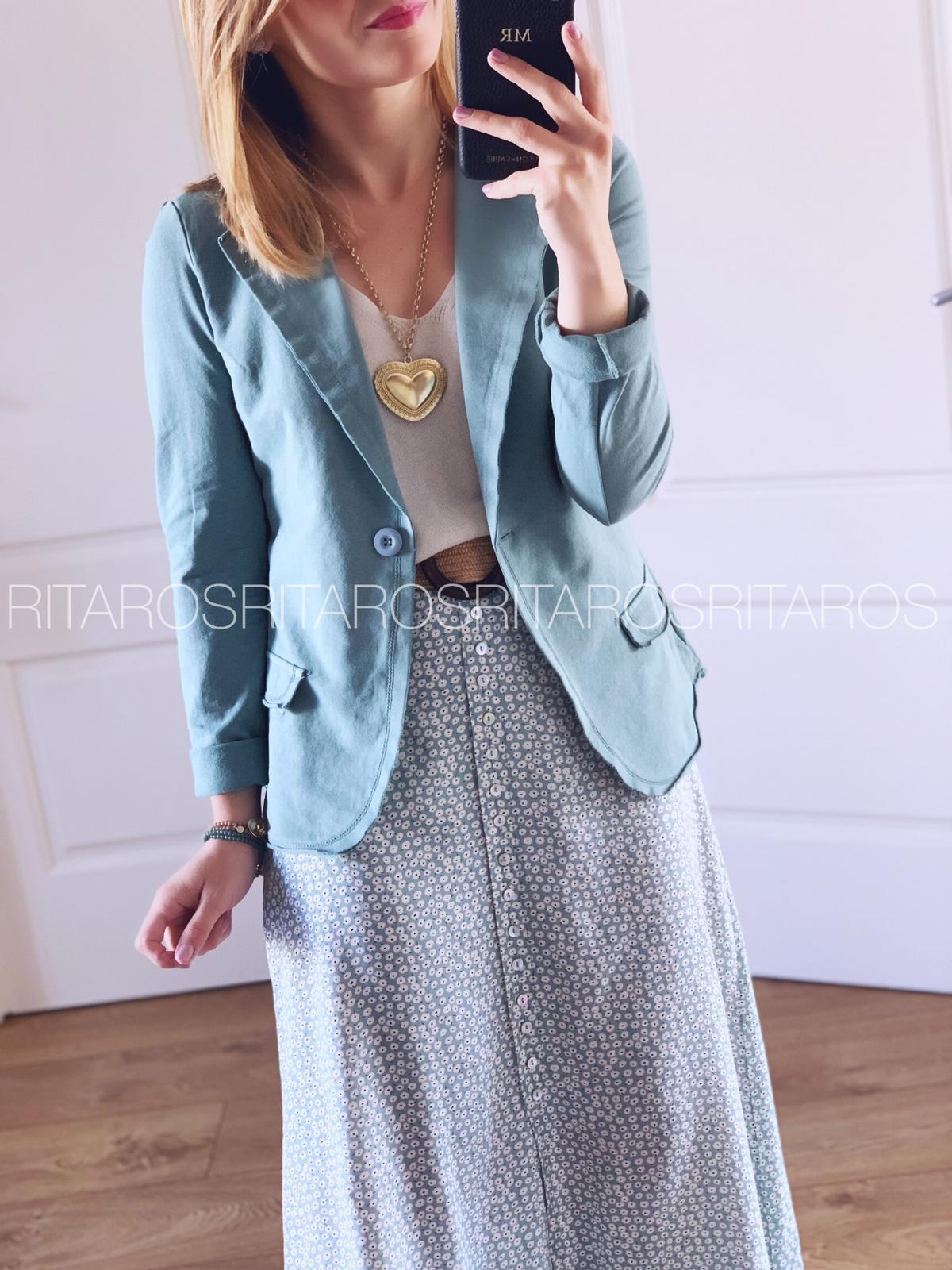 Falda Larga estampada de florecitas con cintura elástica y detalle botones en frontal. La hemos combinado con nuestra americana Cotton en verde agua y top en beige y la combinación es perfecta.