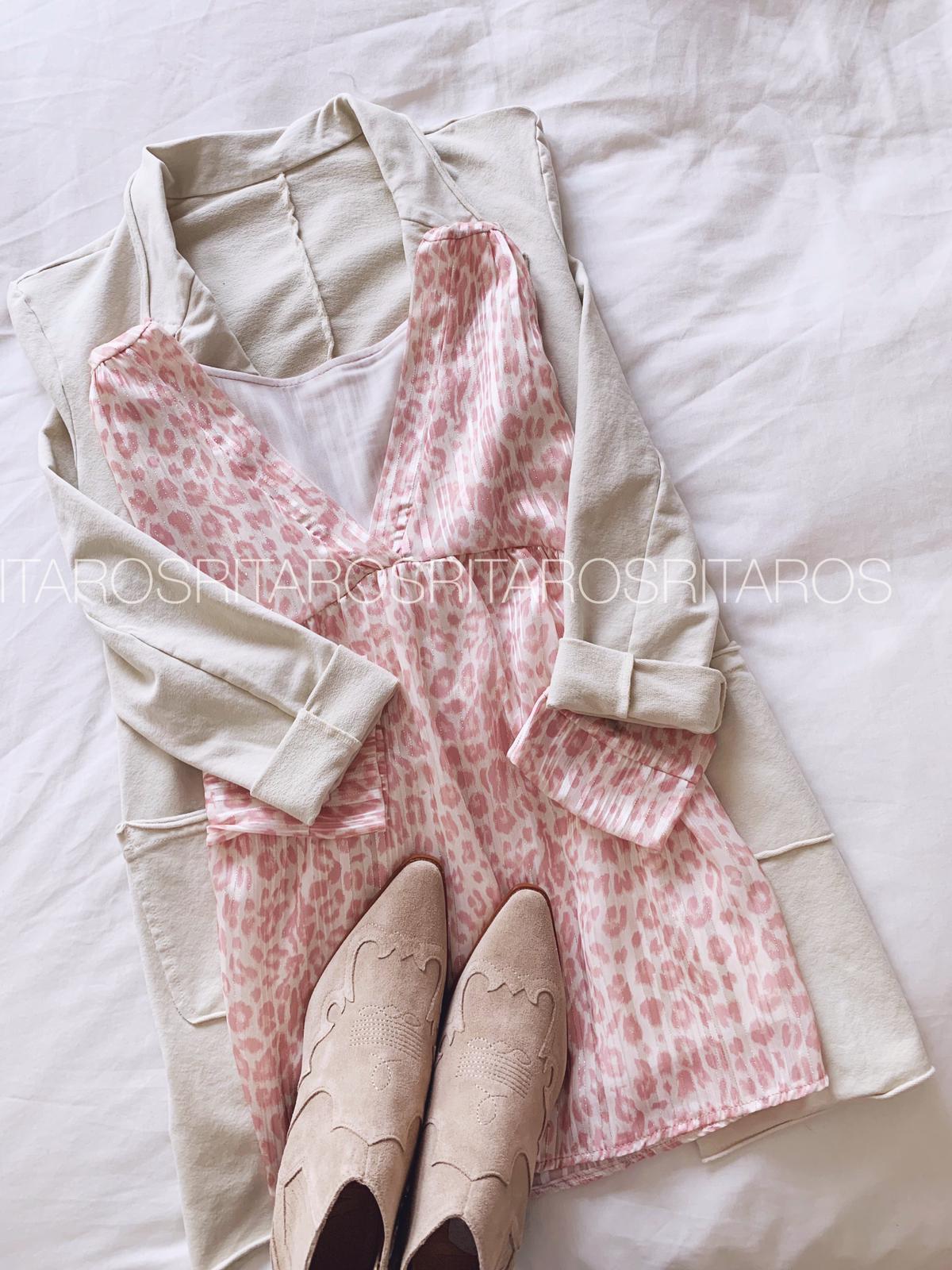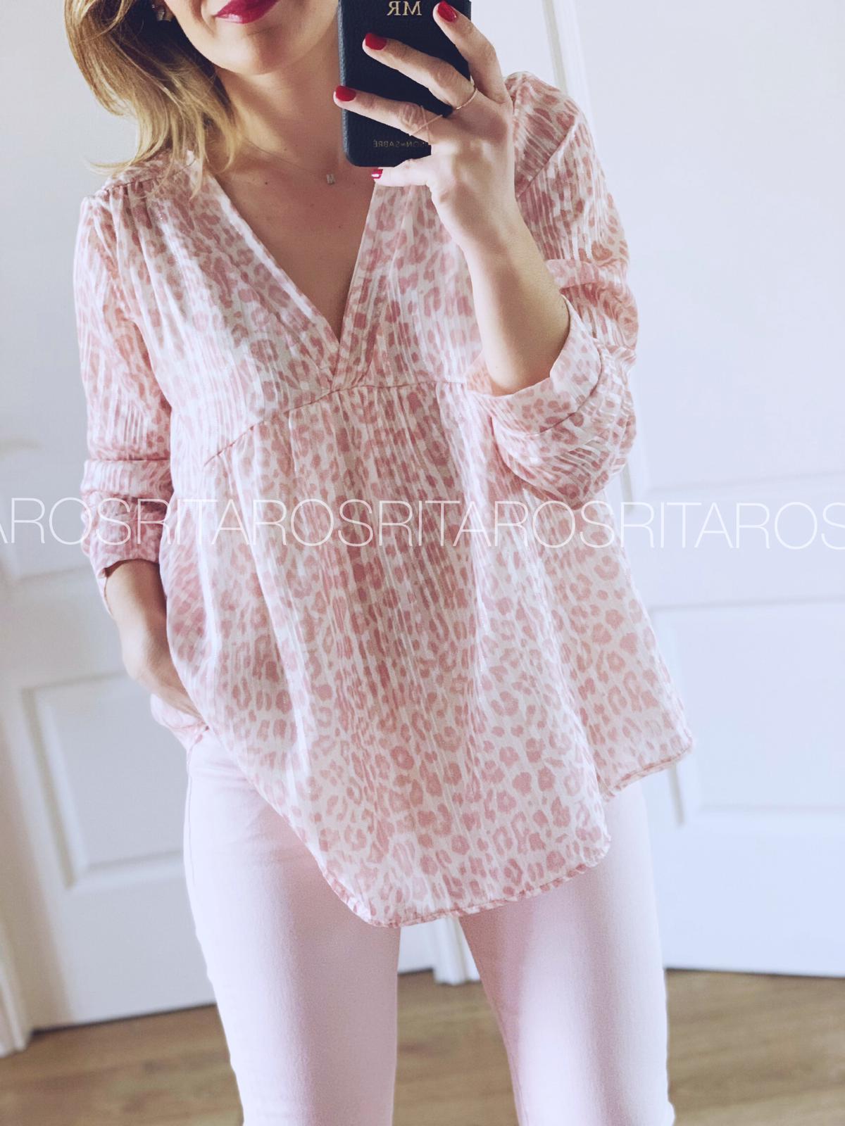 Blusa estampada con escote de pico y manga larga y detalle hilo plateado. Combínala con nuestro pantalón María en rosa y la americana Cotton en beige y te encantará el resultado.