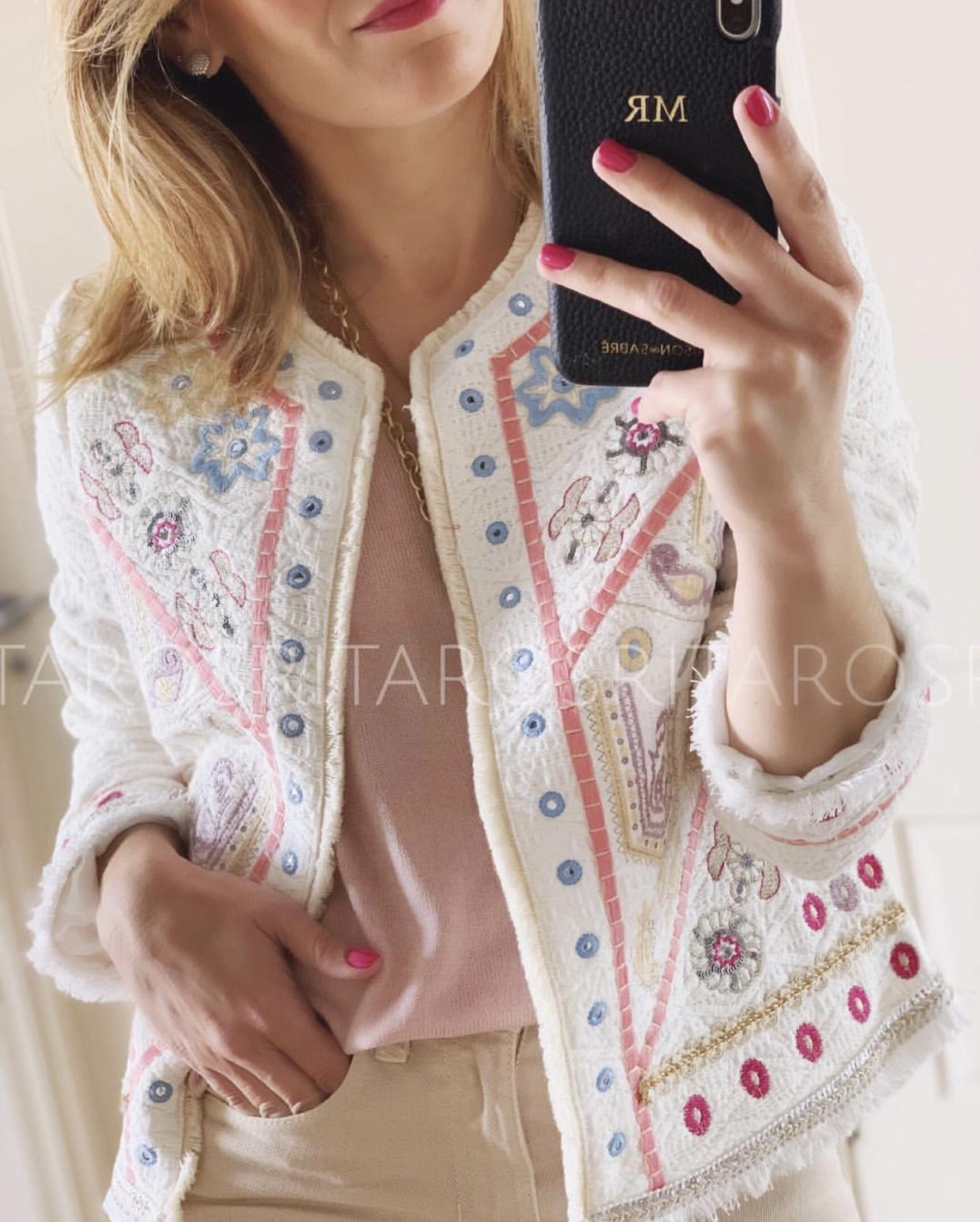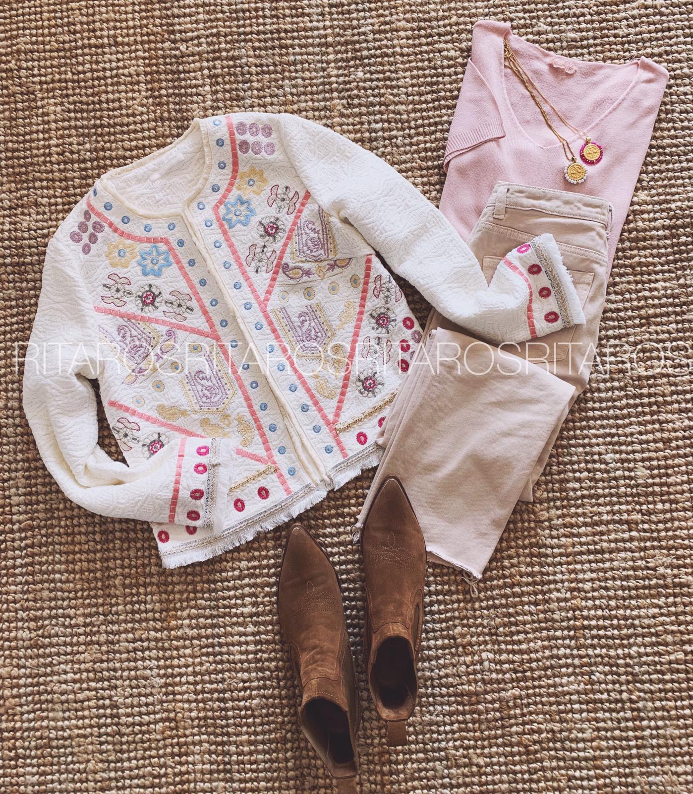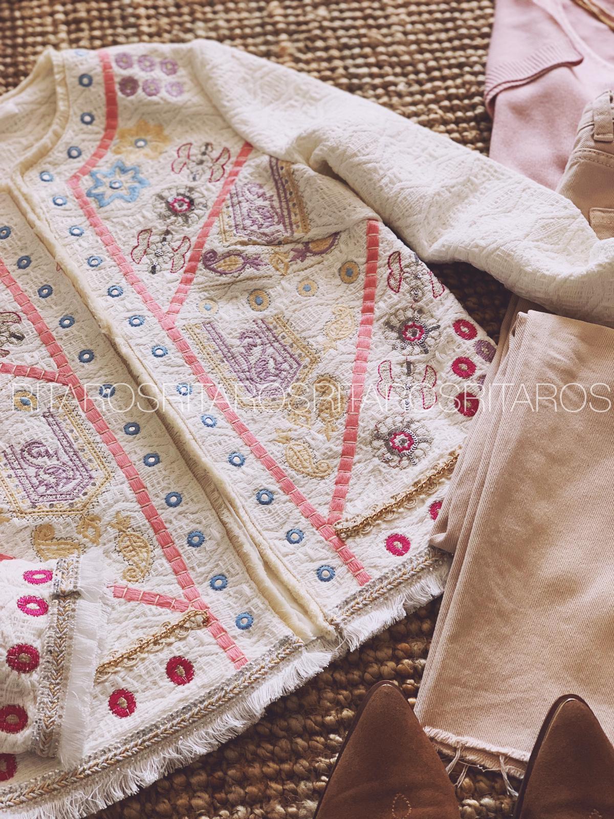 Chaqueta de manga larga y cuello redondo con preciosos detalles bordados y bajos desflecados.