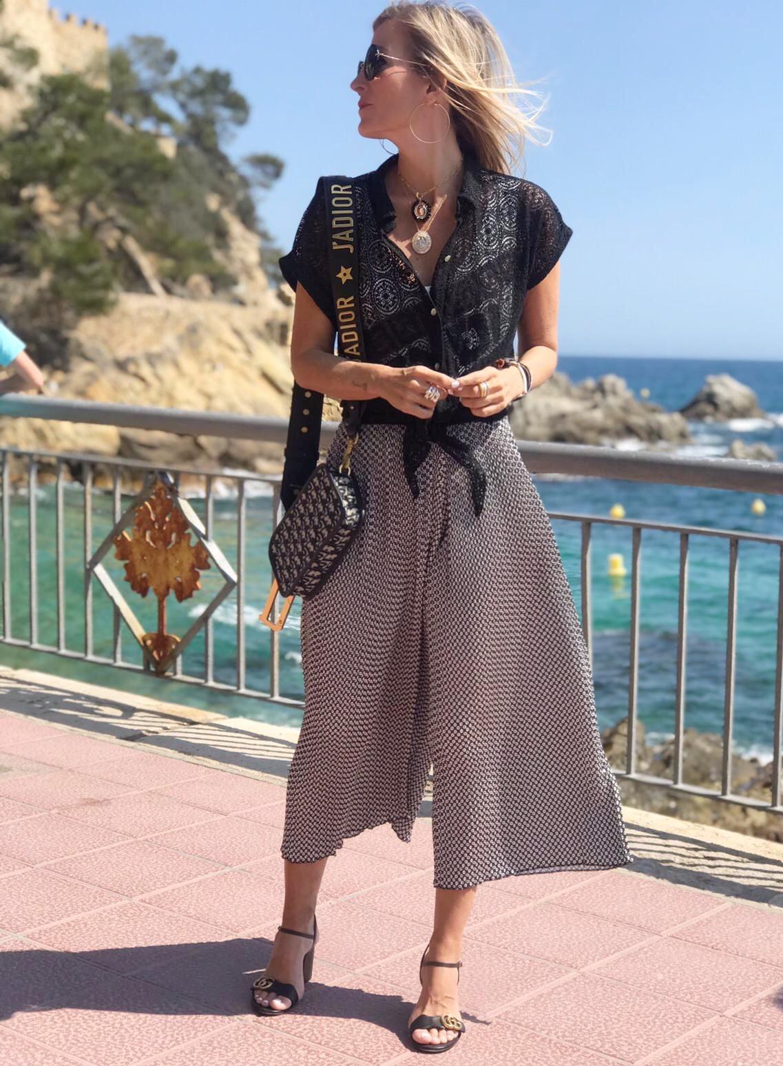 Pantalón palazzo plisado estampado. Cintura con goma elástica
