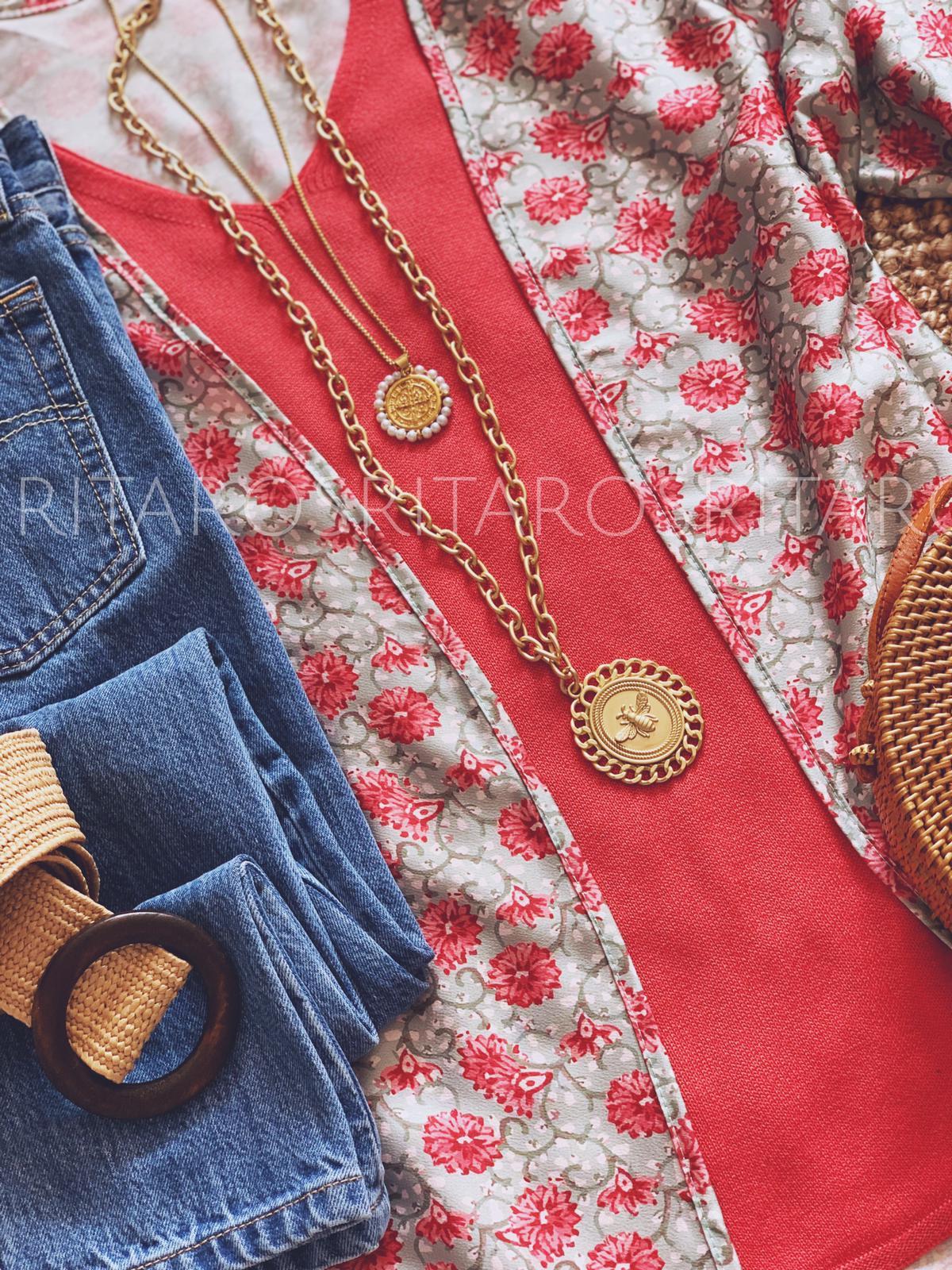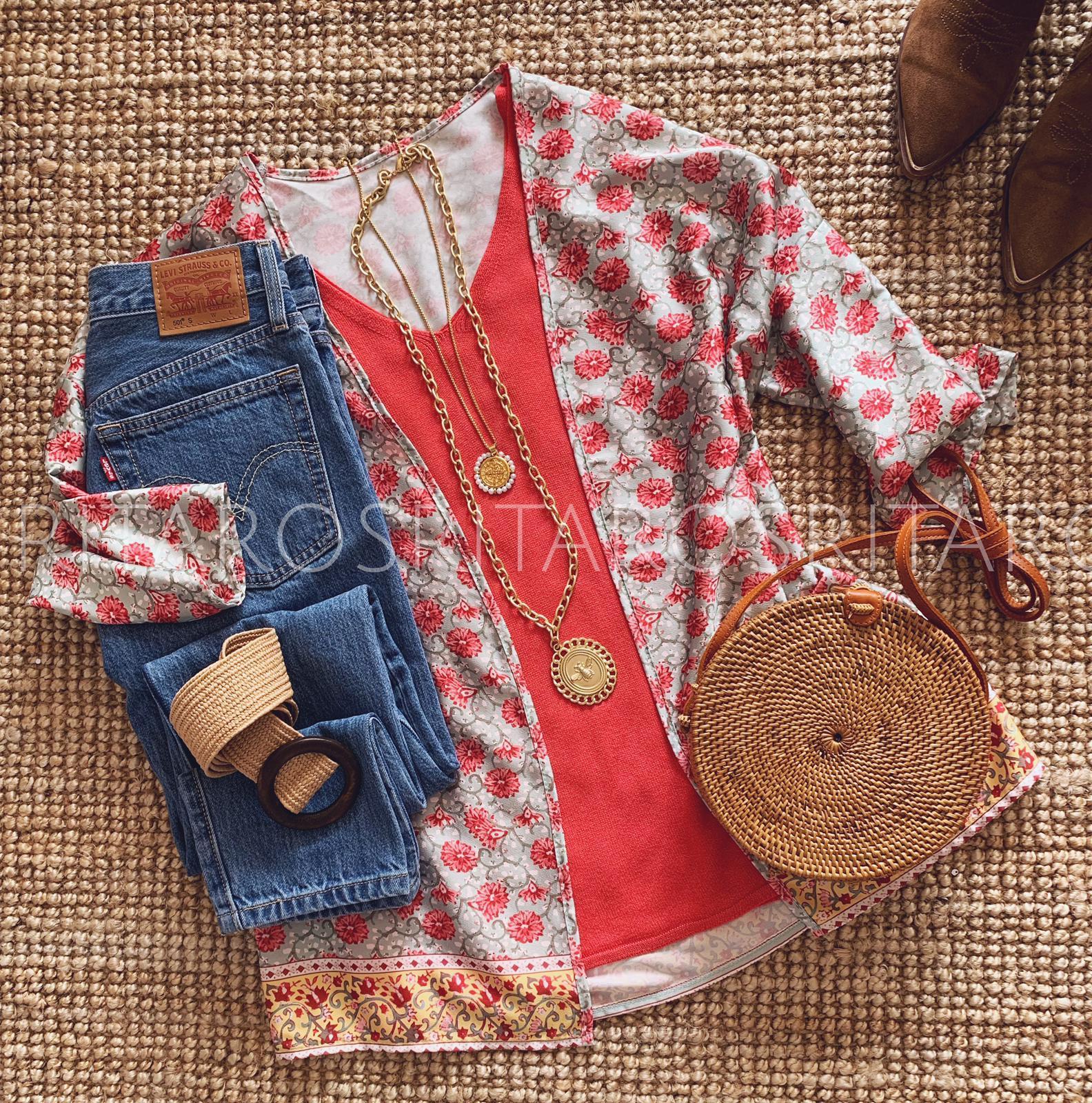 Kimono corto estampado de flores. Combínalo con nuestro top de punt en color coral y la combinación te encantará.