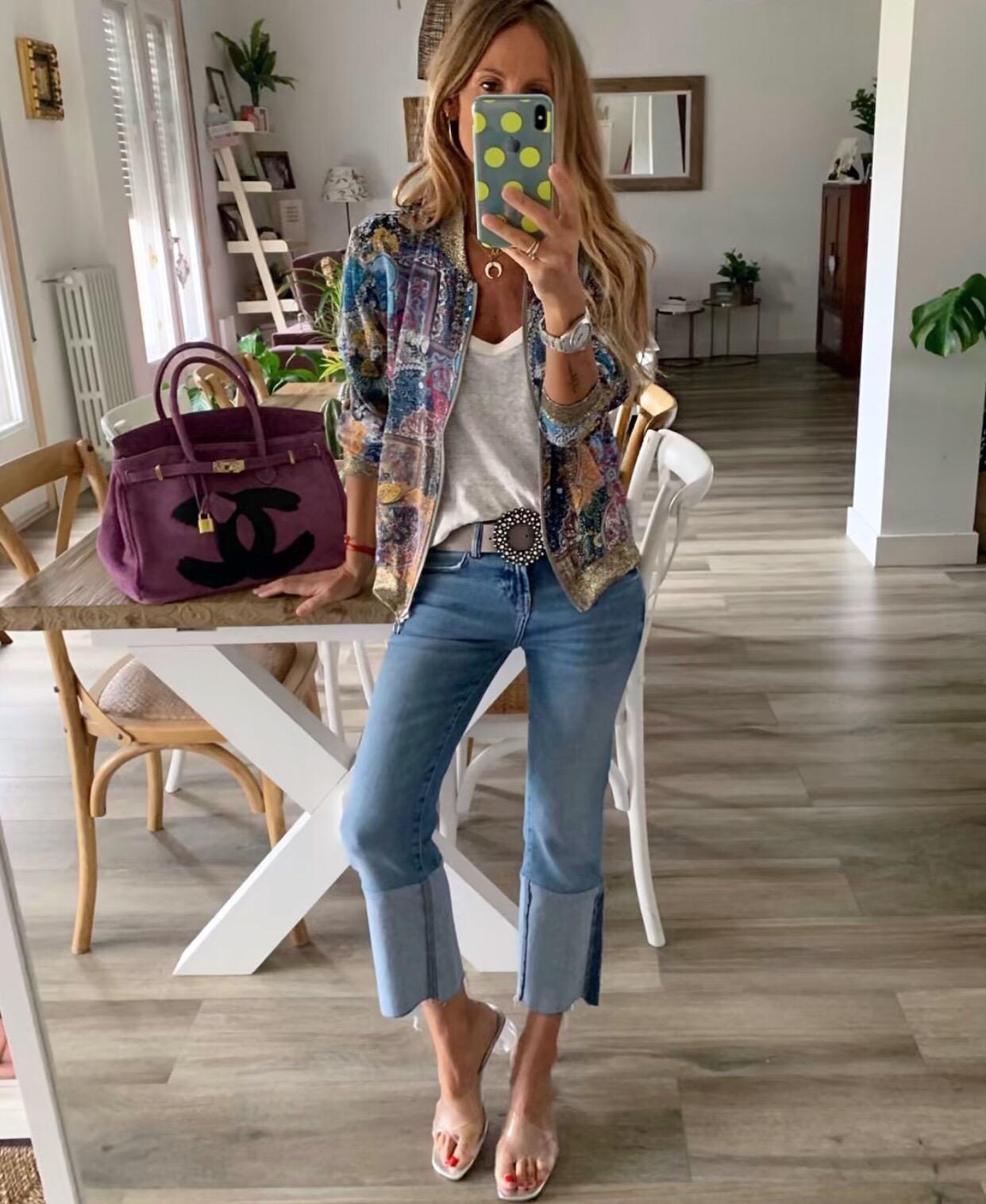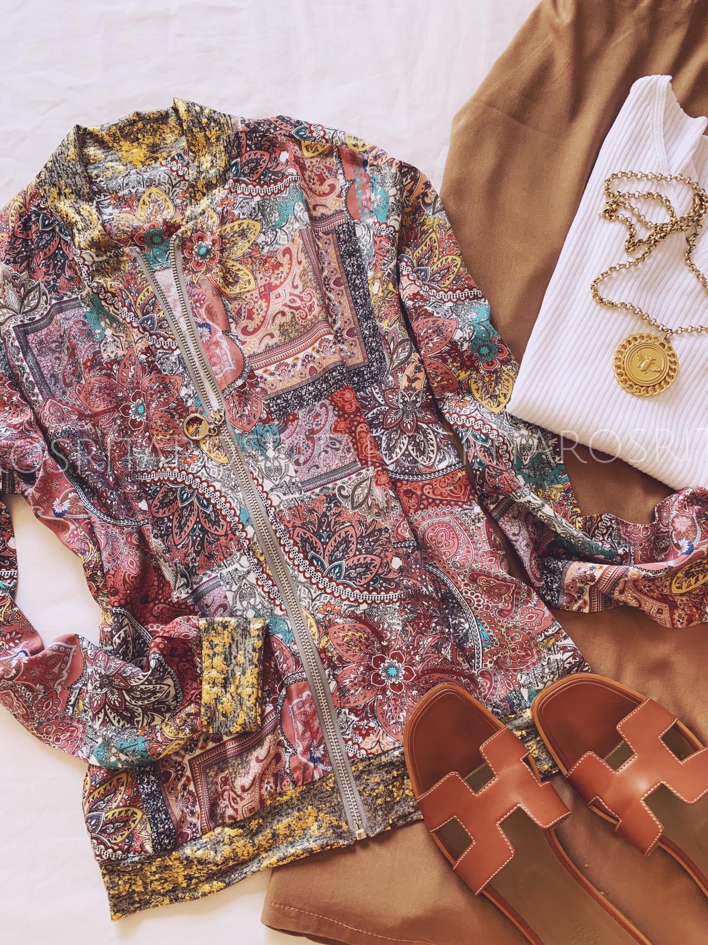 Cazadora tipo bomber estampada, cuello redondo y manga larga. Cuello, puños y bajo en dorado. El tejido es una maravilla.