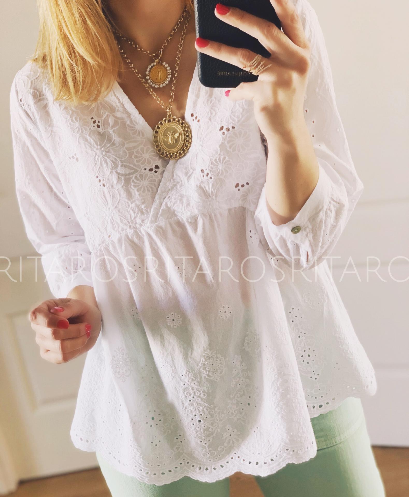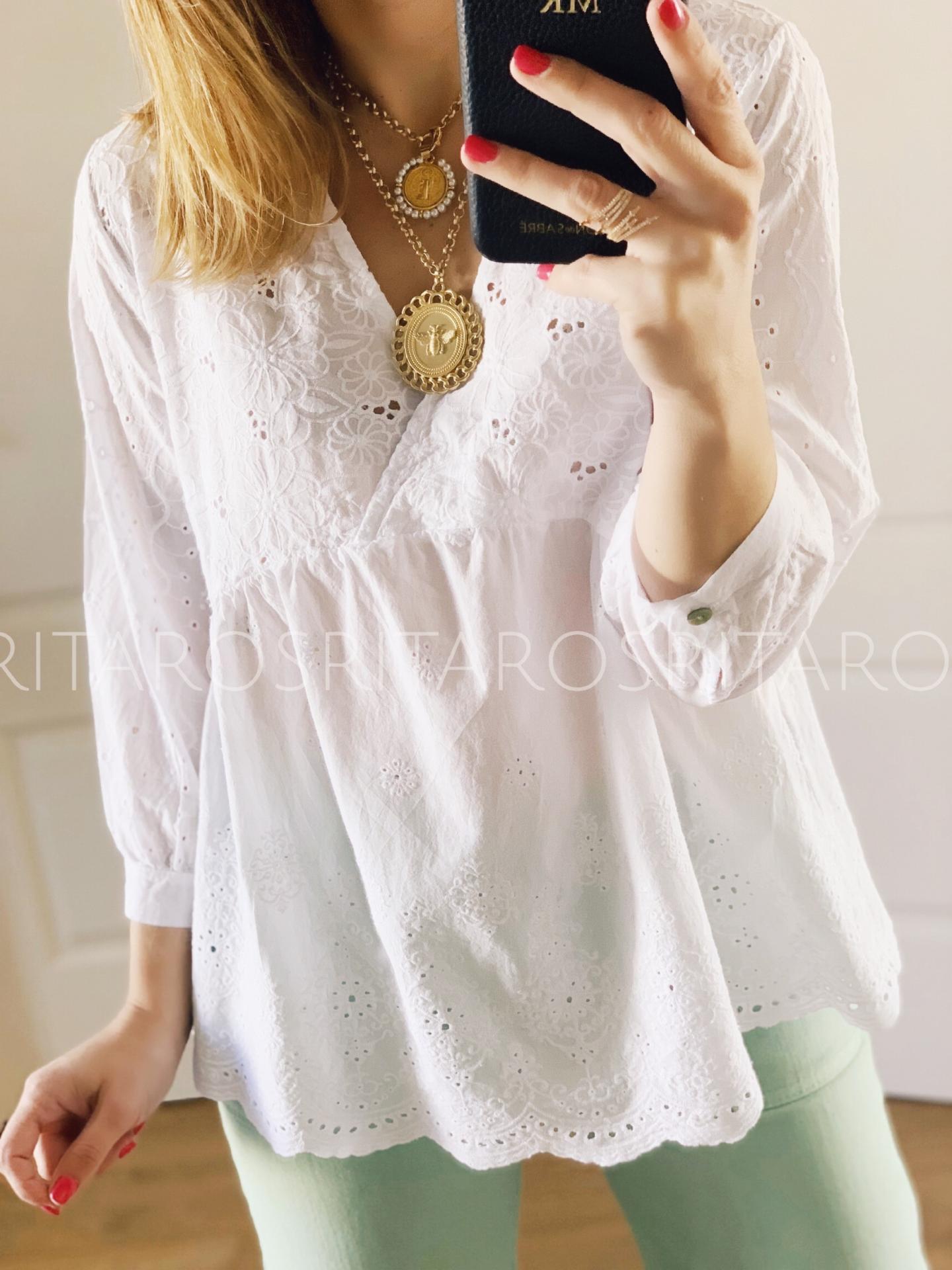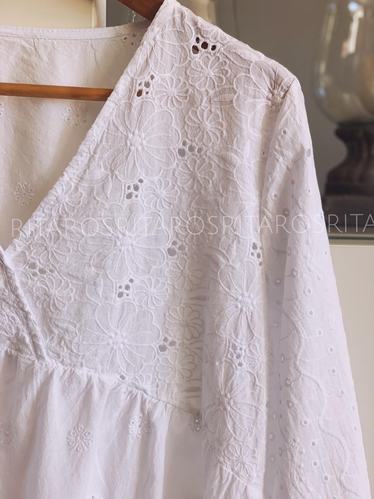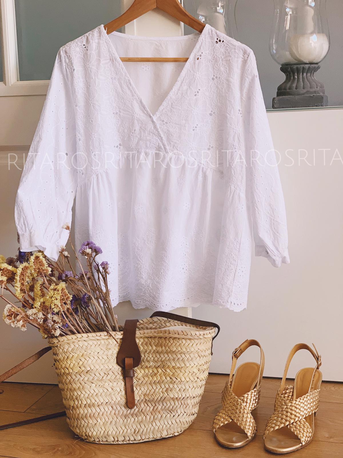 Blusa bordada de algodón con maga 3/4 y escote cruzado. Una monada que podrás combinar con todo.