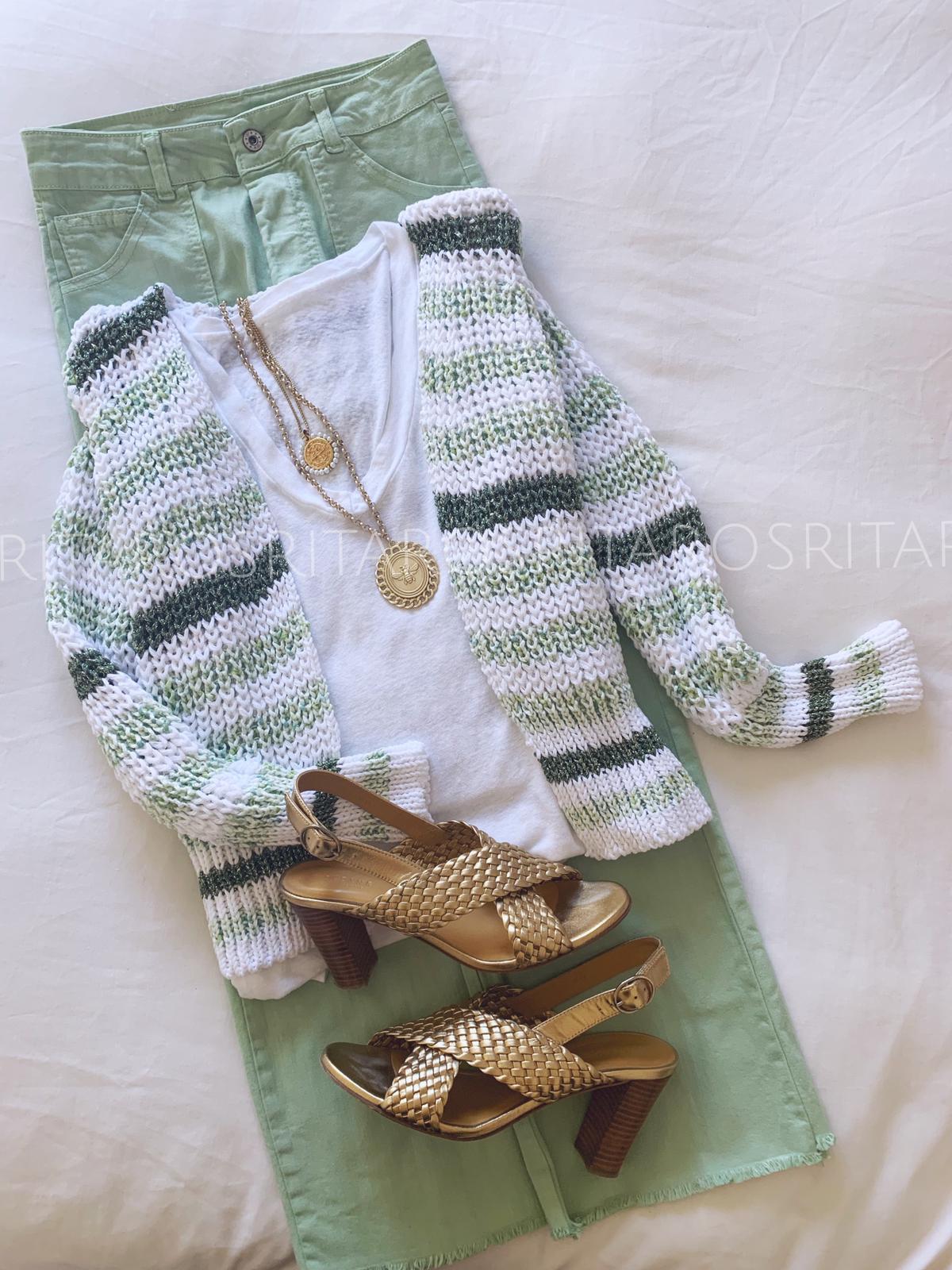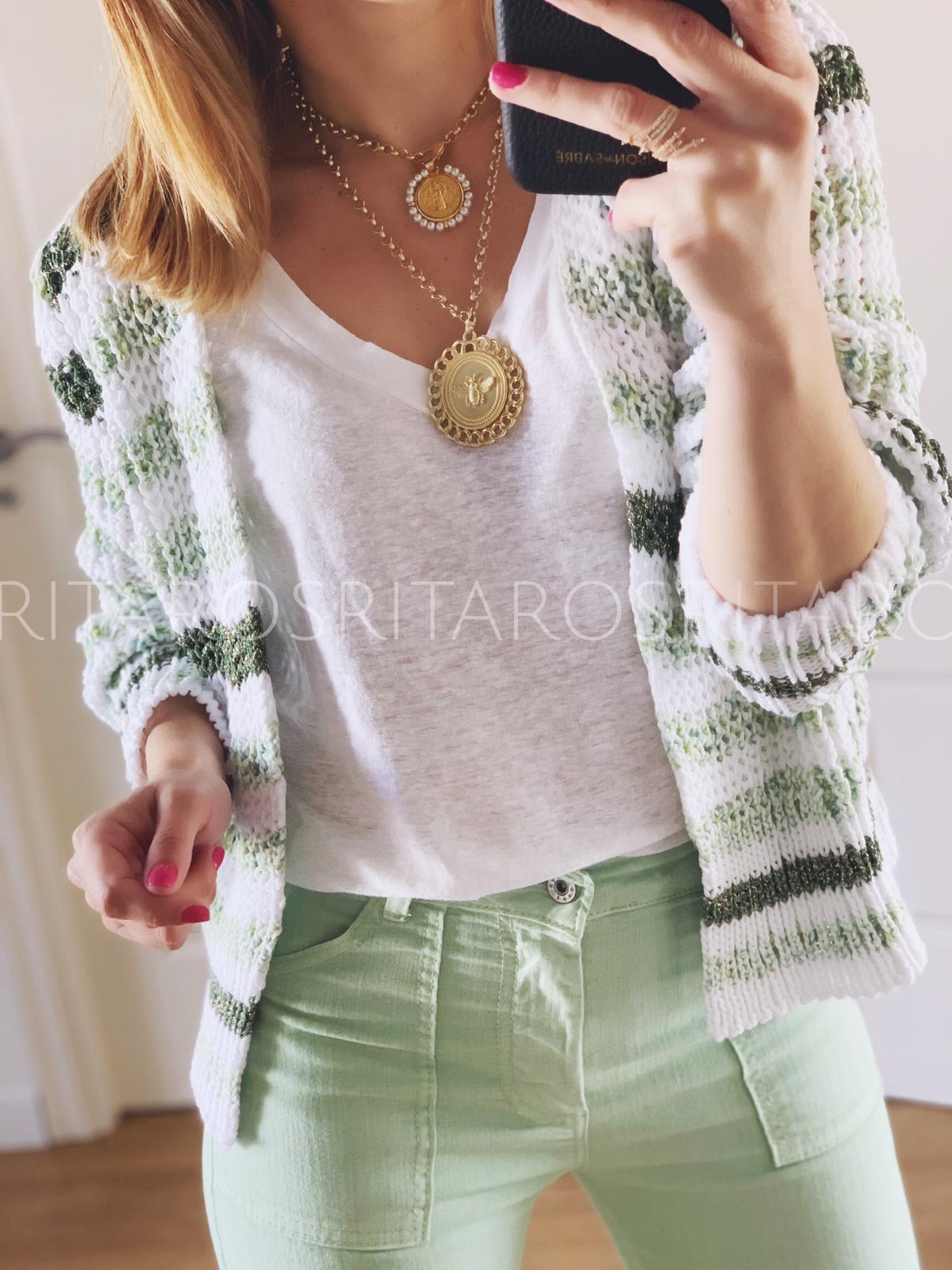 Una monada de chaqueta tricotada en punto grueso con detalles glitter perfecta para combinar con nuestra camiseta de lino en color blanco.