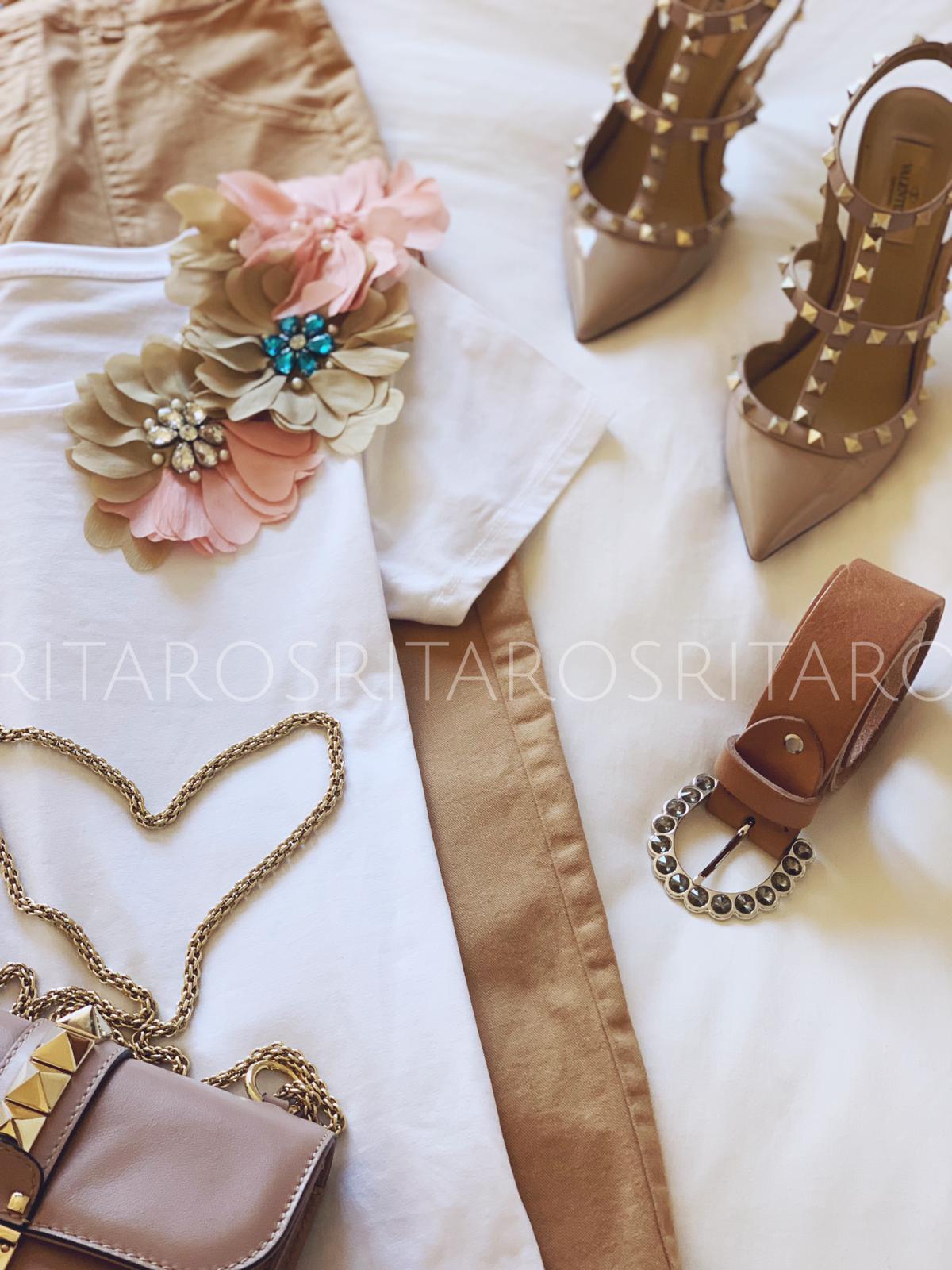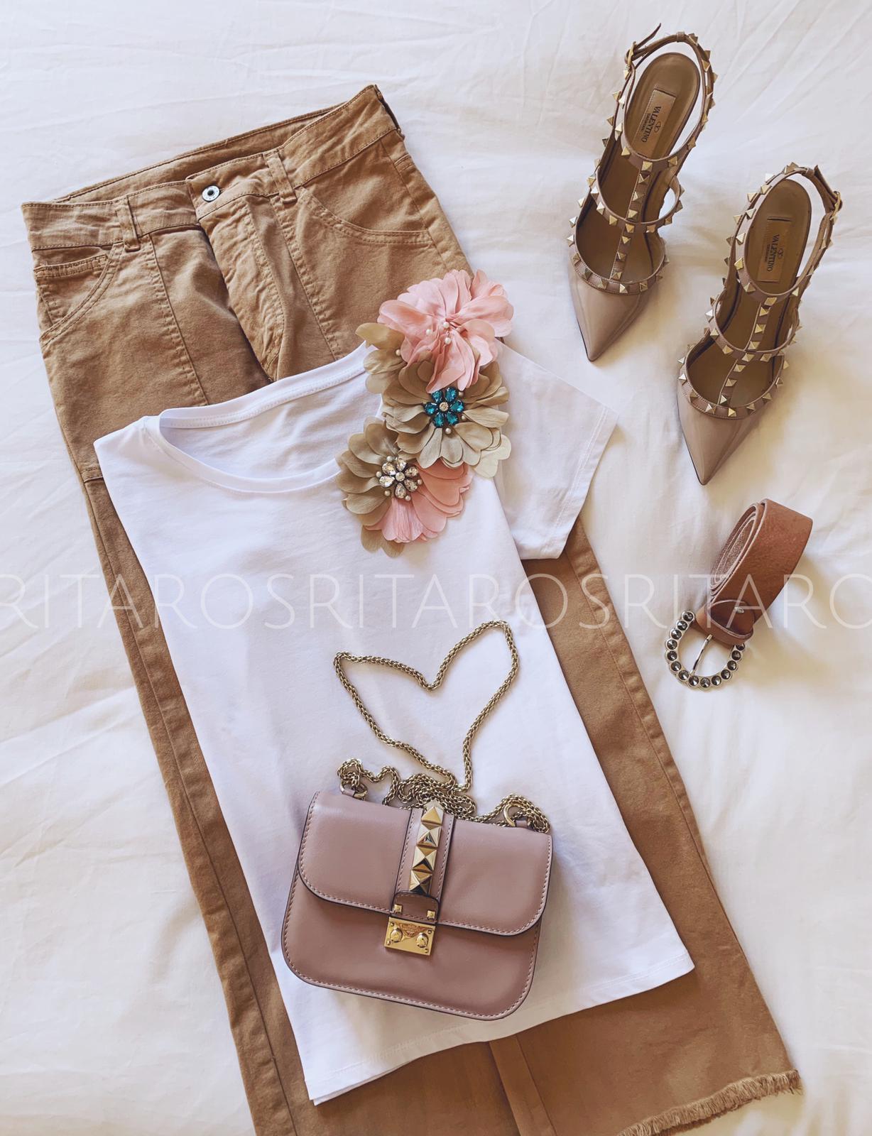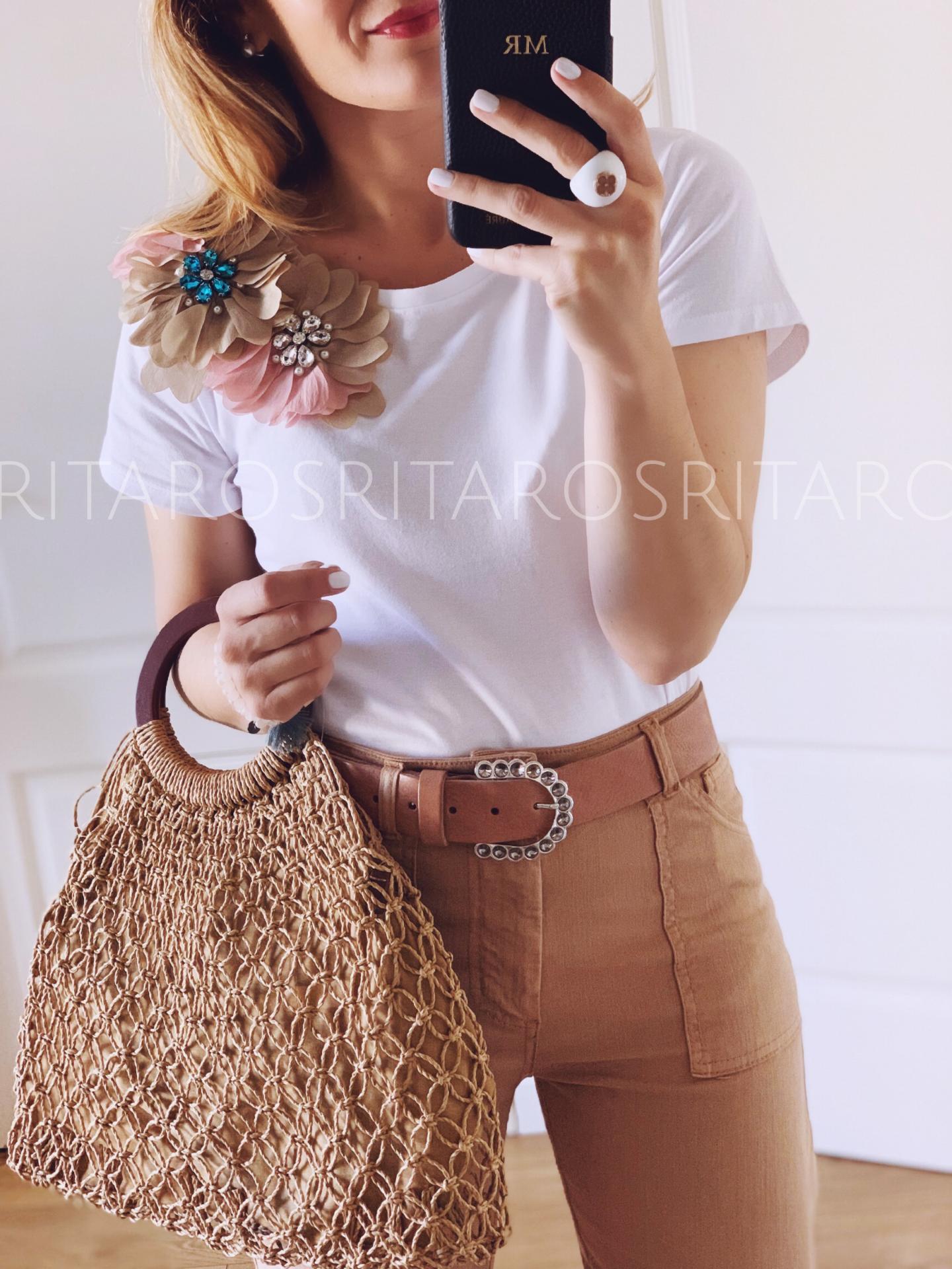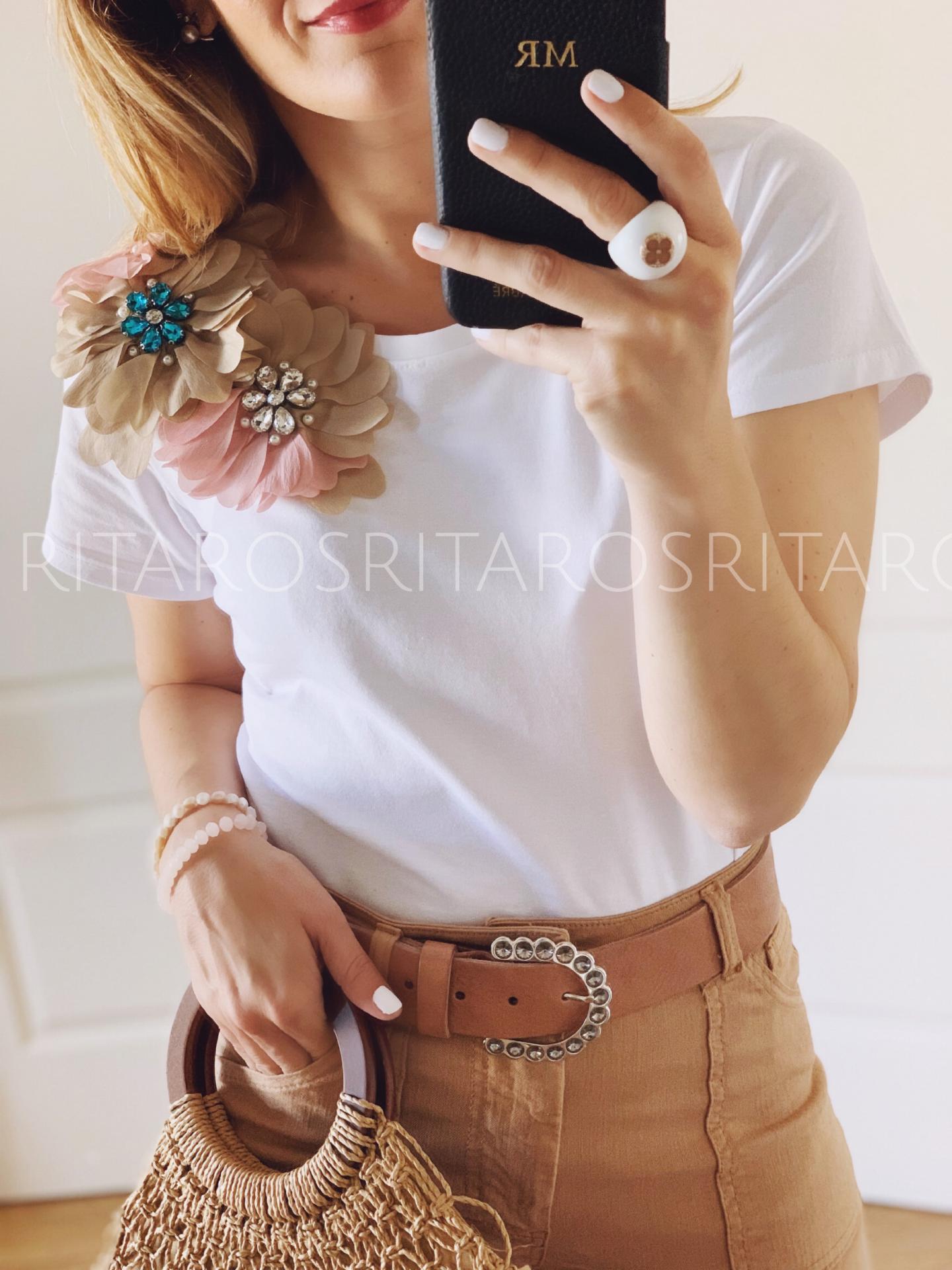 Camiseta de algodón de manga corta con detalle flores en el hombro.