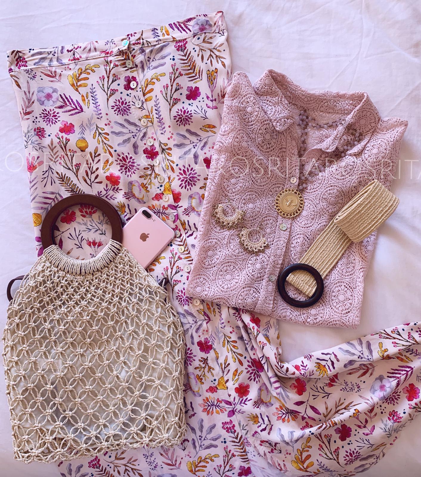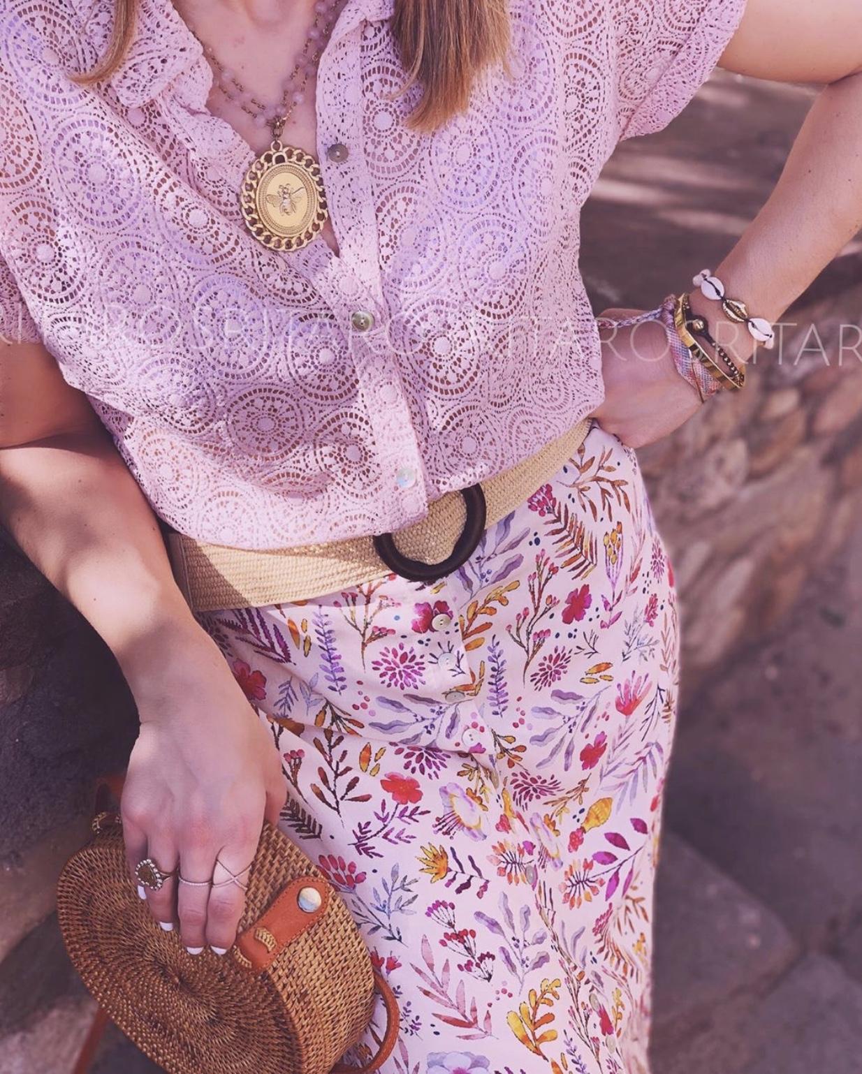 Falda larga estampada con detalle botones en frontal y cintura elástica. Combínala con nuestra blusa Lola en color rosa y te encantará el resultado.