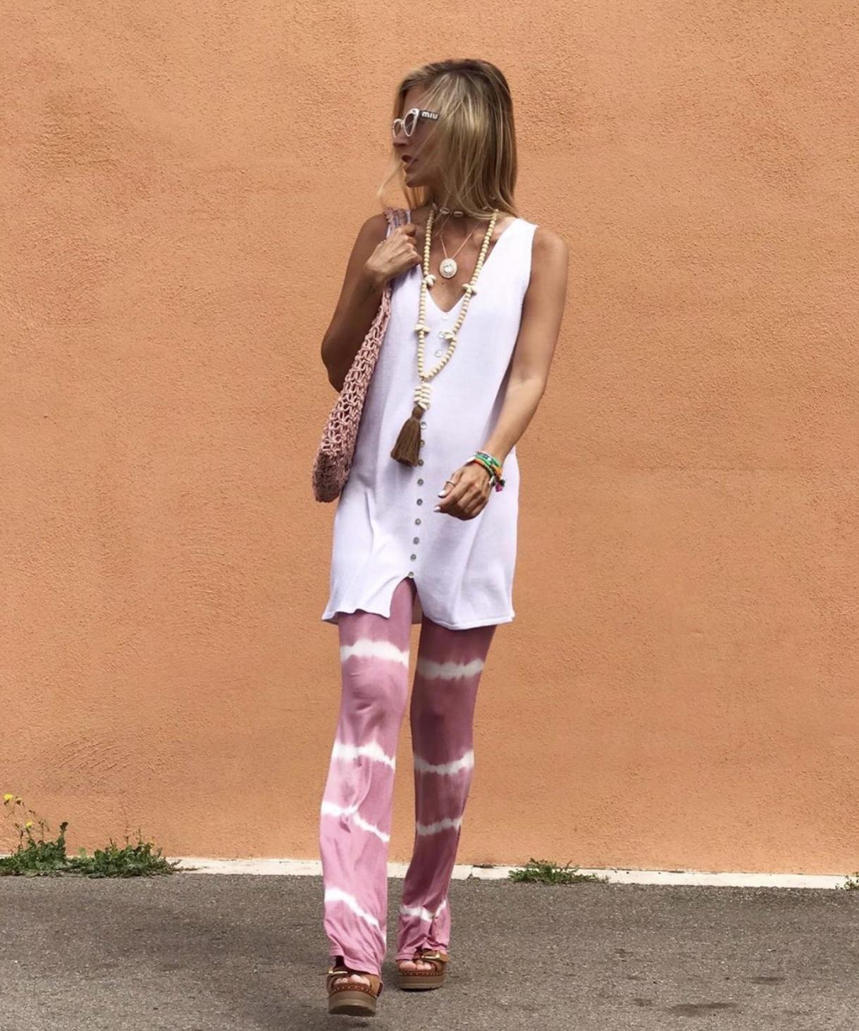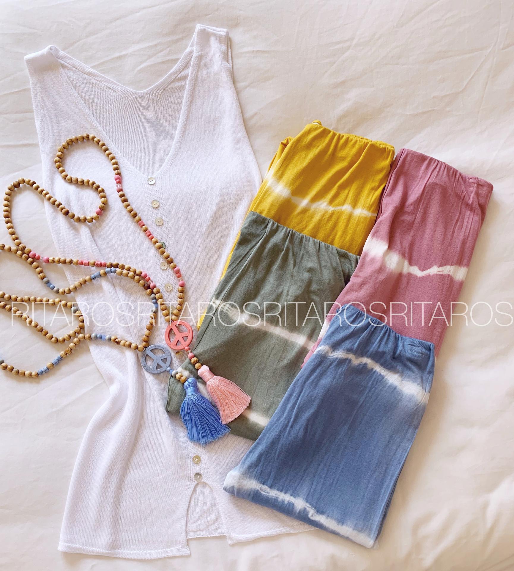Pantalón Largo tie dye con cintura con goma elástica. Una prenda de total tendencia que hemos combinado con nuestro top de punto largo en color blanco, te encantará la combinación.