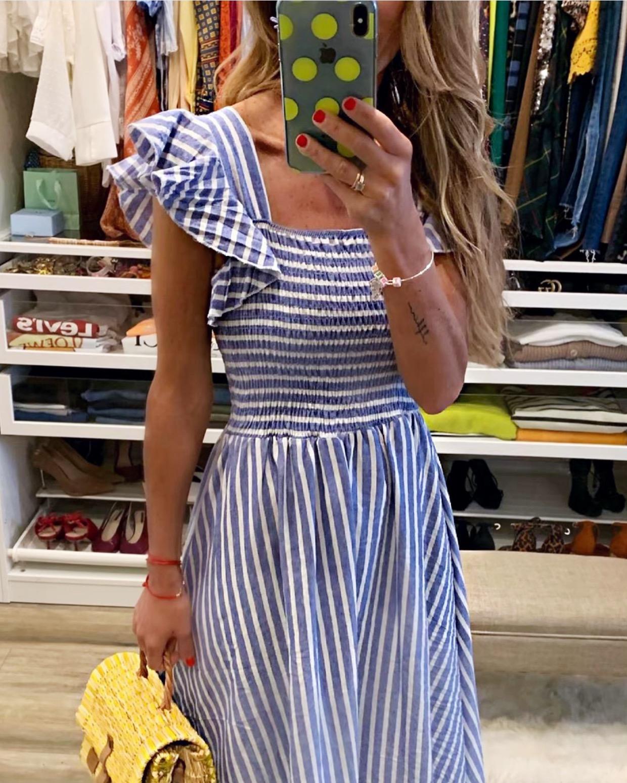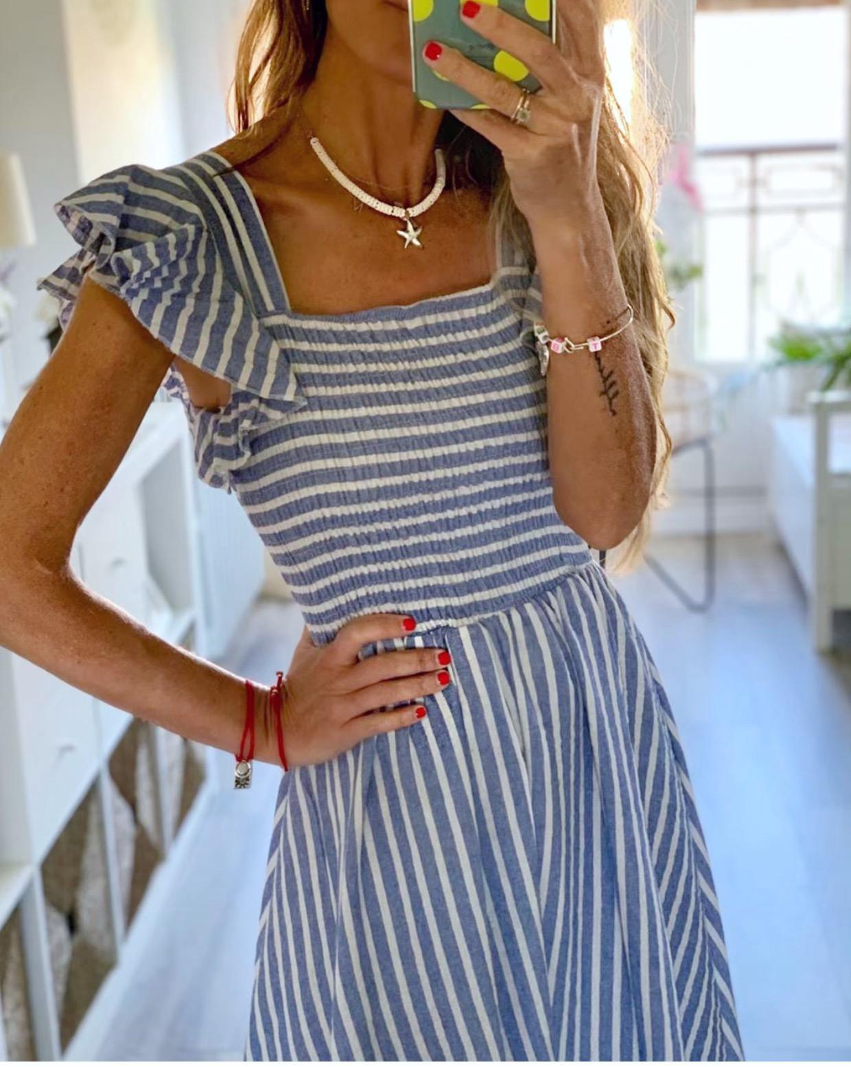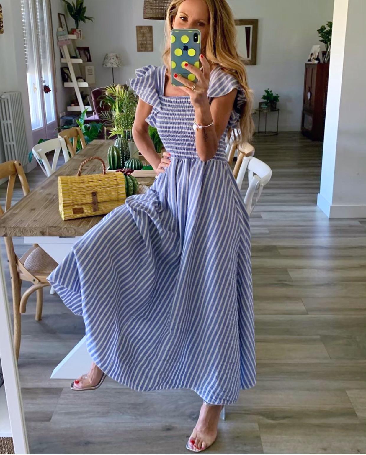 Una monada de vestido estampado de rayas con cuerpo fruncido y volante en los hombros.
