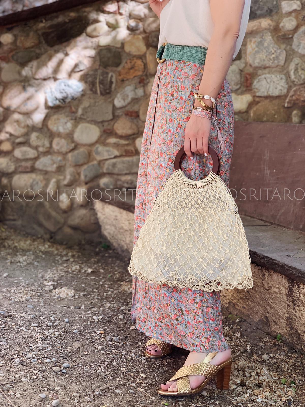 Falda larga estampada con detalle botones en frontal y cintura elástica. Combínala con nuestra blusa americana cotton en color coral y nuestro top de punto en beige y el resultado te encantará.
