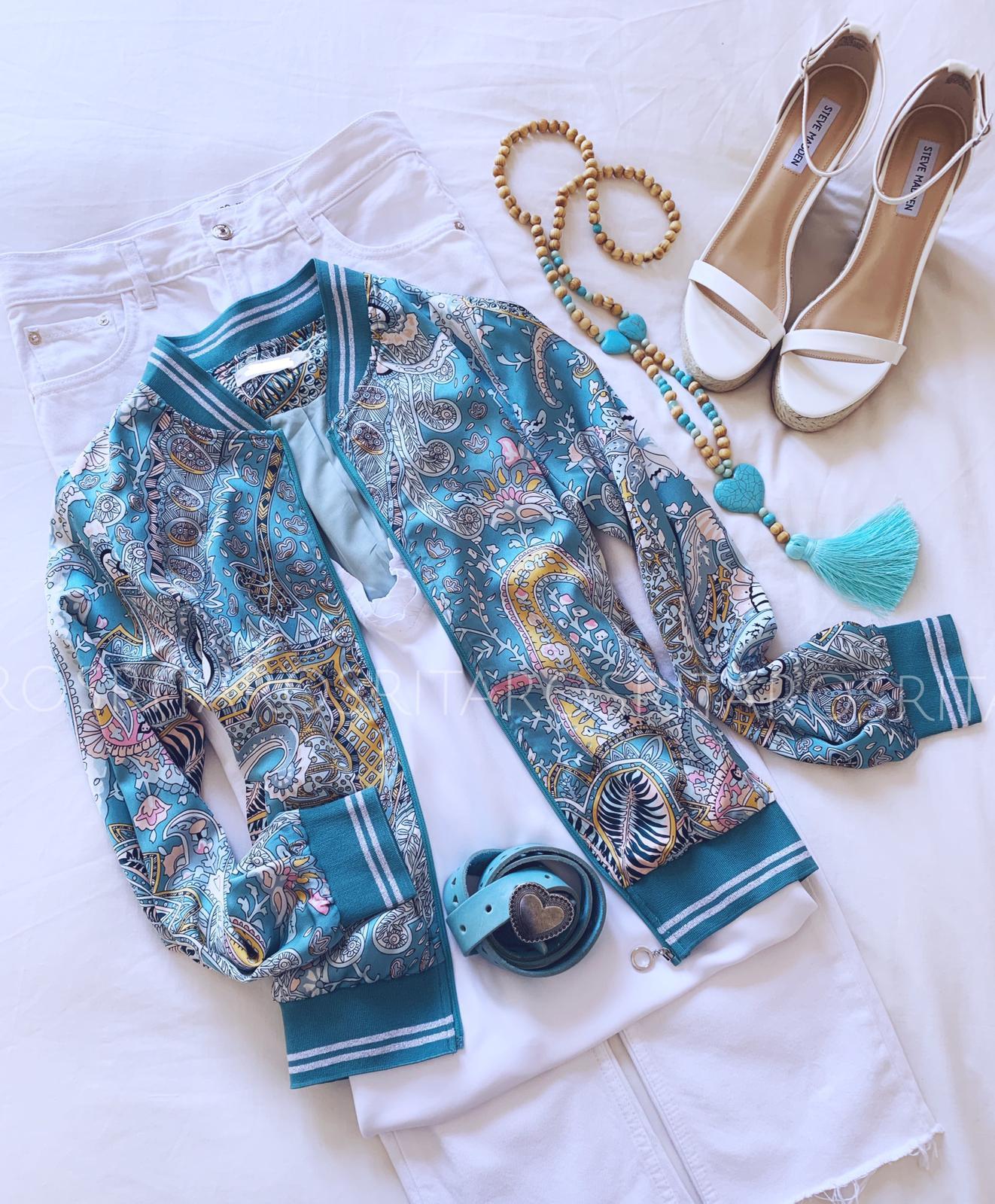 Preciosa bomber estampada con bolsillos laterales. Cuello, puños y bajo con goma.