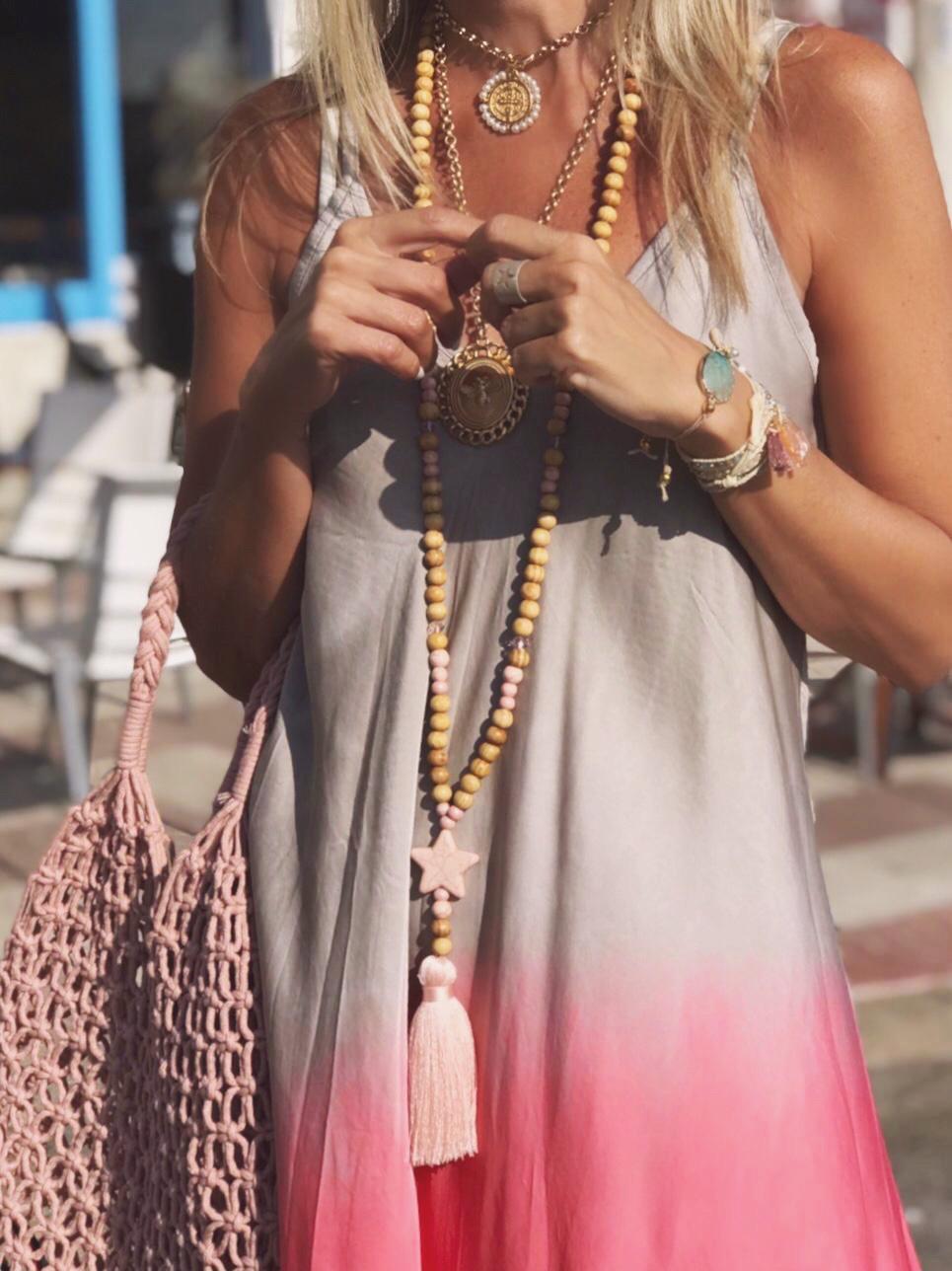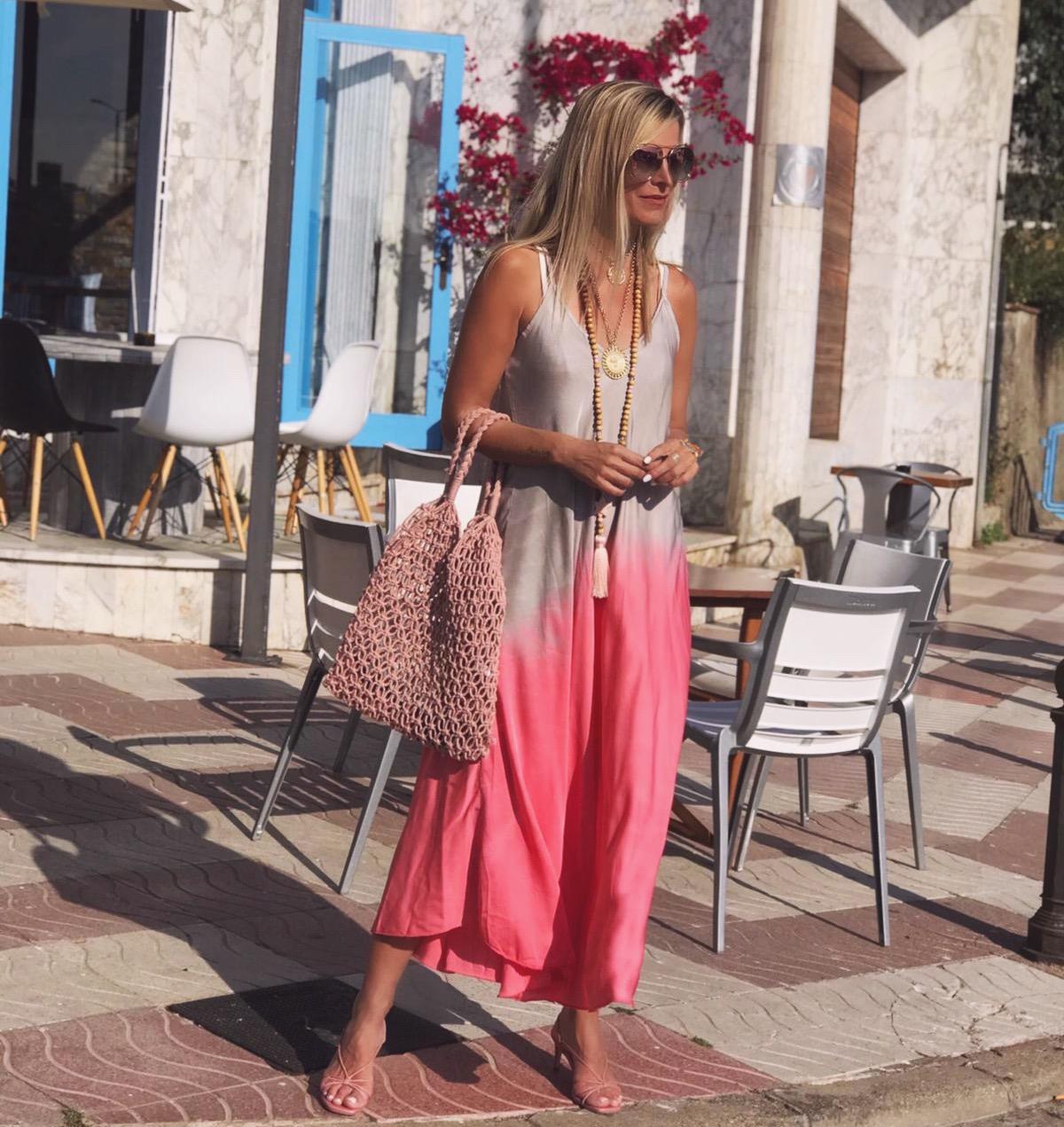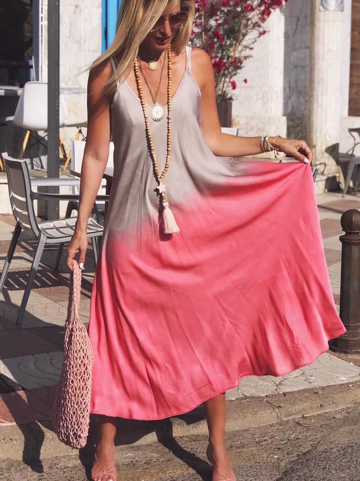 Vestido de raso de tirantes, largo con escote de pico y estampado Tie Dye. Una prenda comodísima y elegante que hemos combinado con nuestra americana de lino.