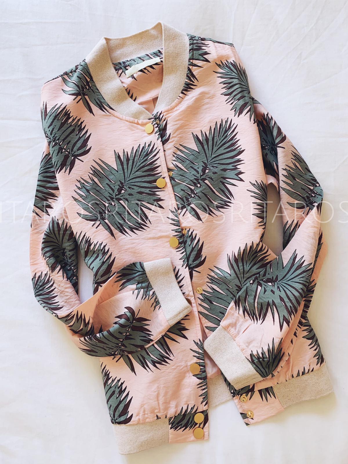Cazadora tipo bomber estampada cuello redondo y manga larga. Cierre delantero con botones en dorado. Cuello y puños en punto elástico brillante de canalé.