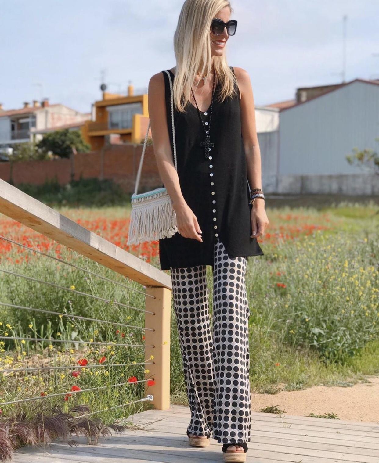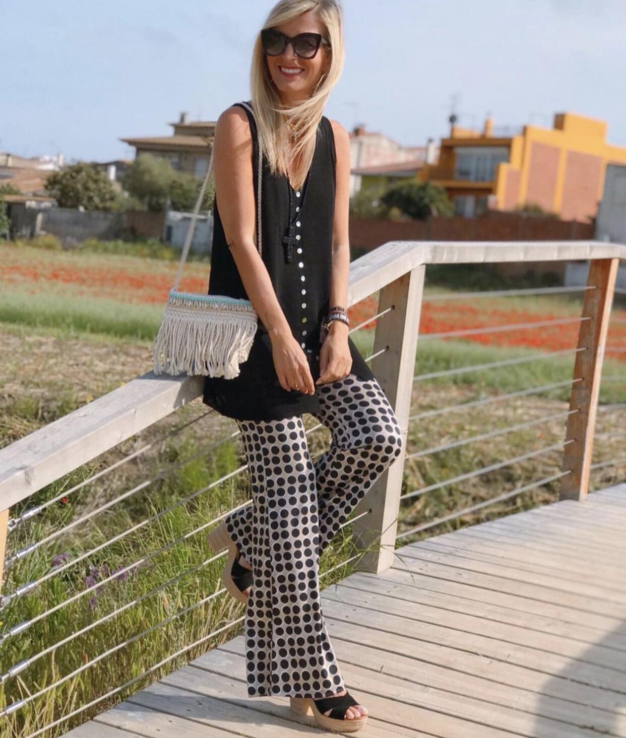 Pantalón de punto estampado de lunares acabado en forma acampanada. Lo hemos combinado con nuestro Jersey de punto largo en color negro, el resultado te encantará.
