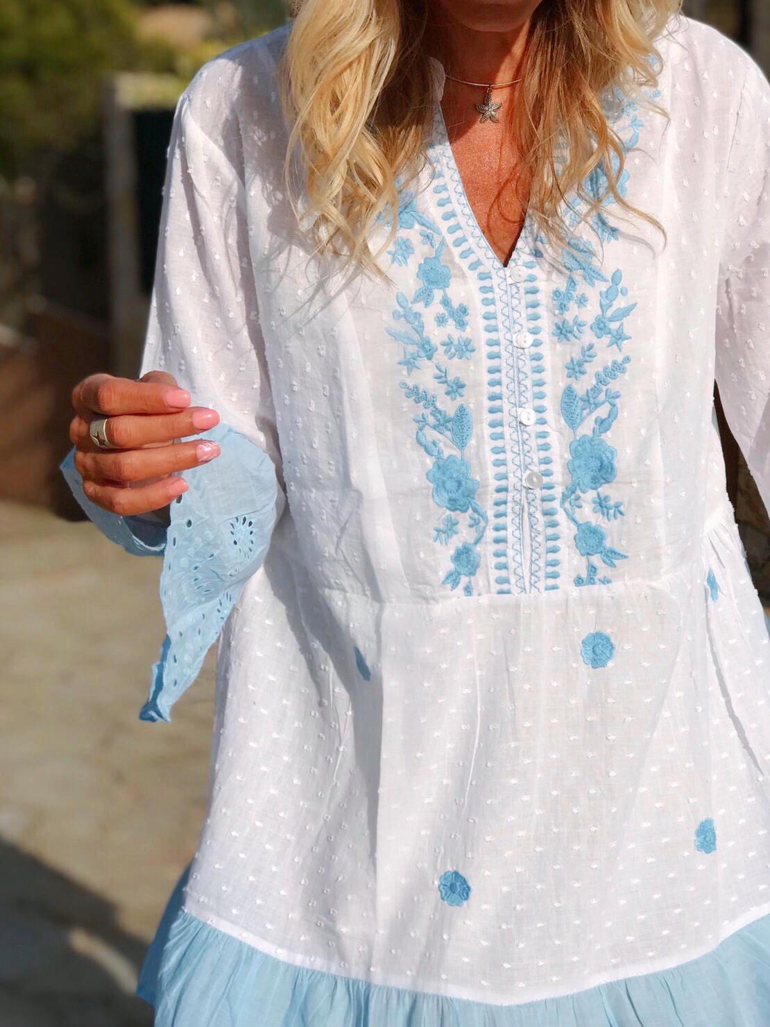 Precioso vestido blusón de estilo boho bordado con manga francesa y bajo acabados en volante de otro color. Una prenda llena de detalles preciosos que la hacen única.