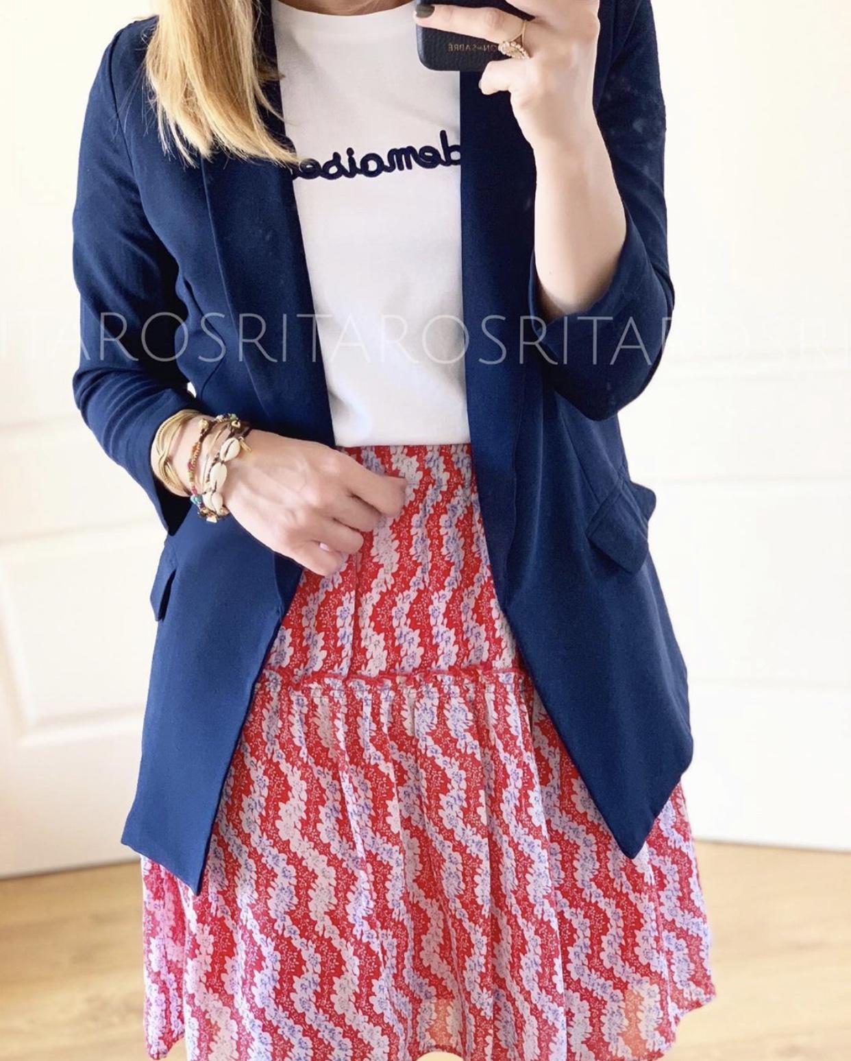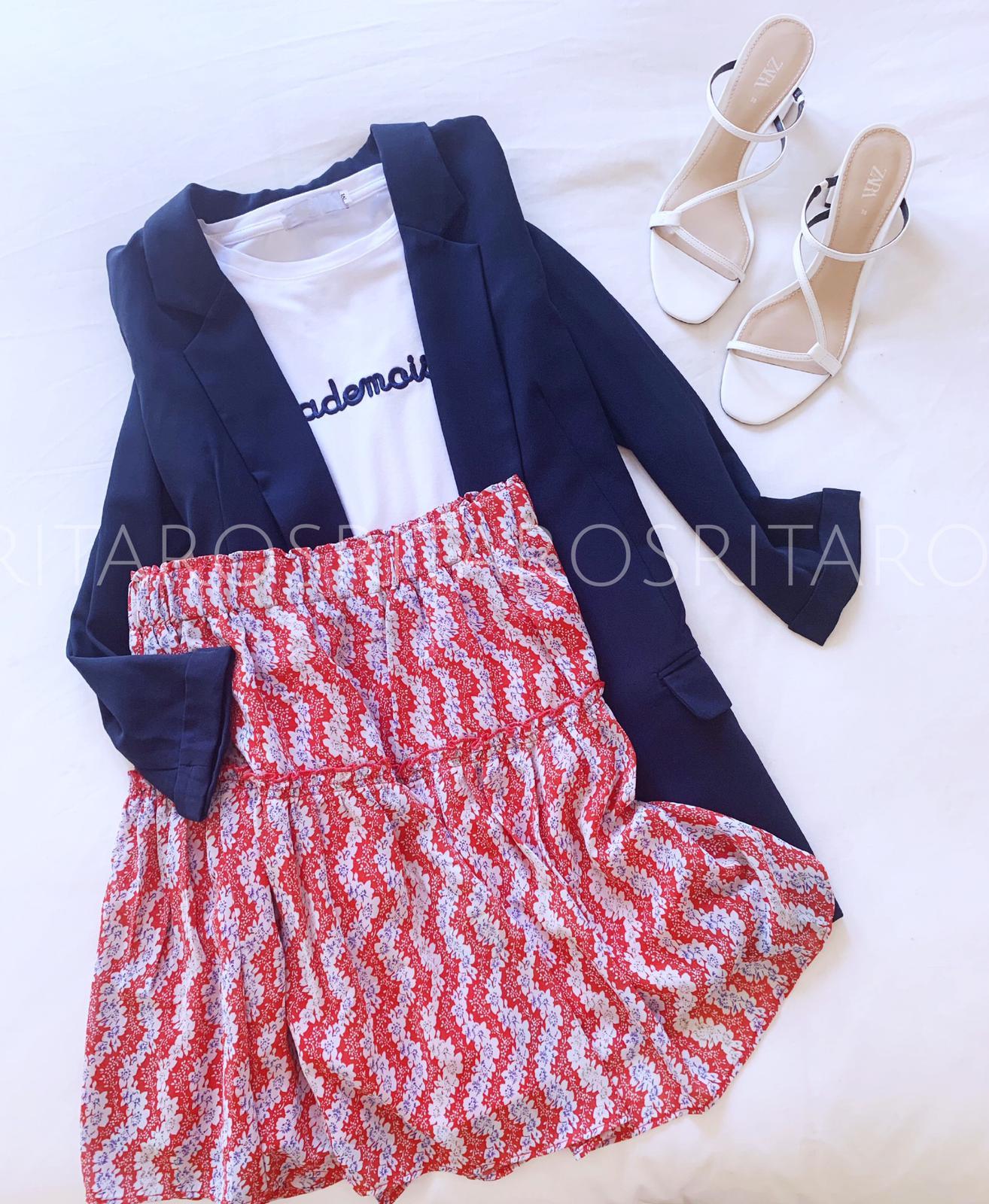 Falda corta estampada con cintura fruncida con un tejido maravilloso. Combínala con nuestra americana Alli en azul marino y la camiseta Mademoiselle con letras en azul marino y te encantará el resultado.