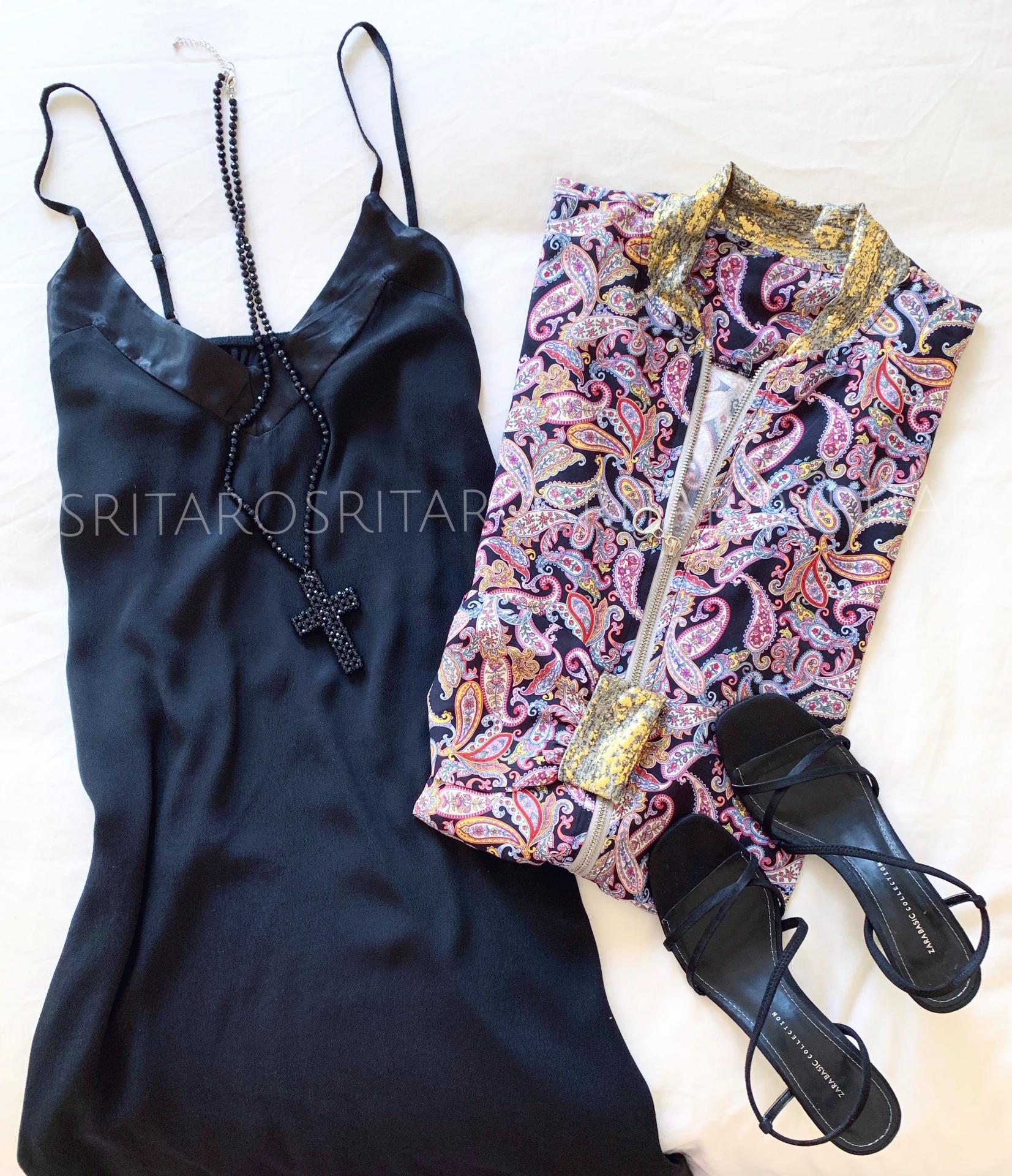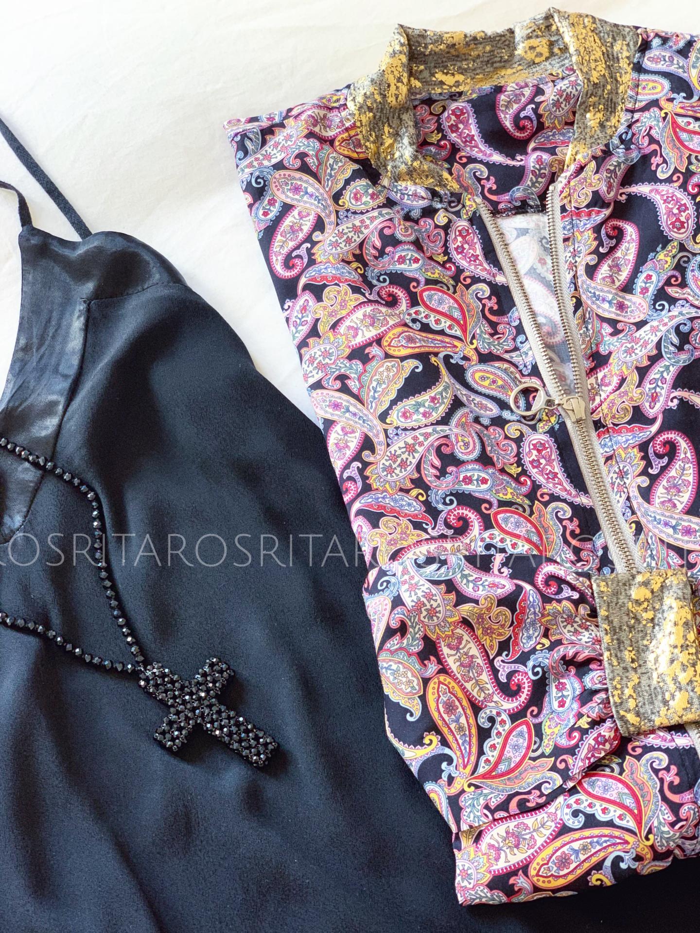 Cazadora tipo bomber estampada con cuello redondo y manga larga. Cuello, puños y bajo en dorado. El tejido es una maravilla.