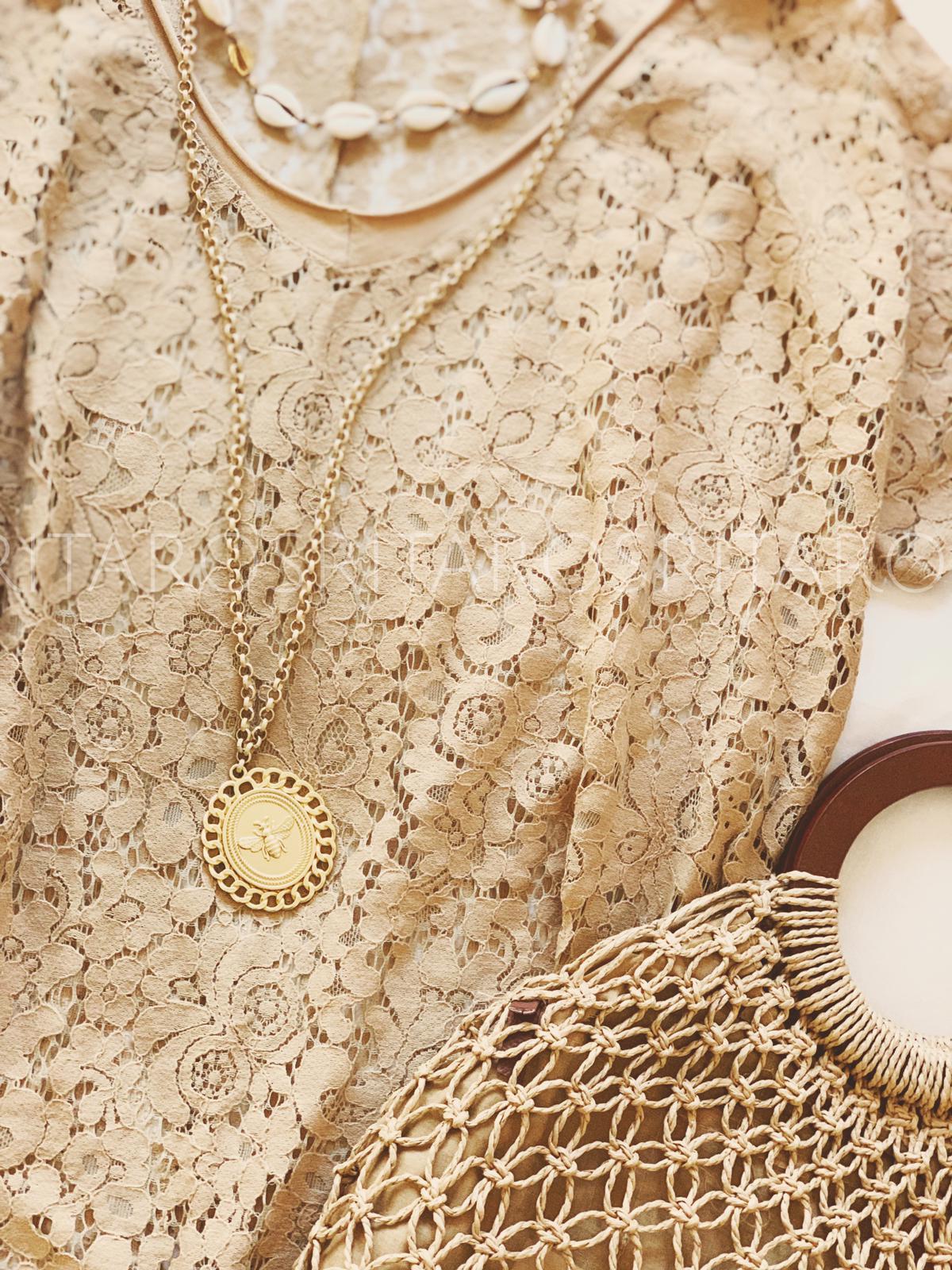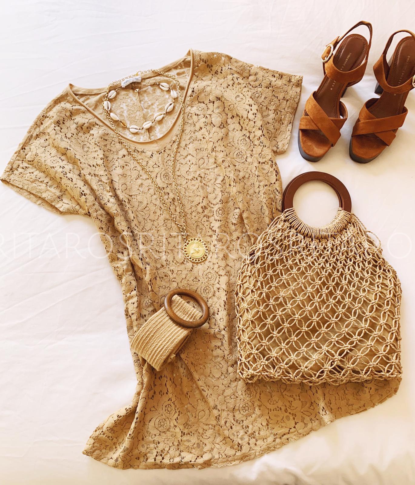 Blusa/vestido todo de encaje cuello de pico, manga corta y corte acabado evasé.