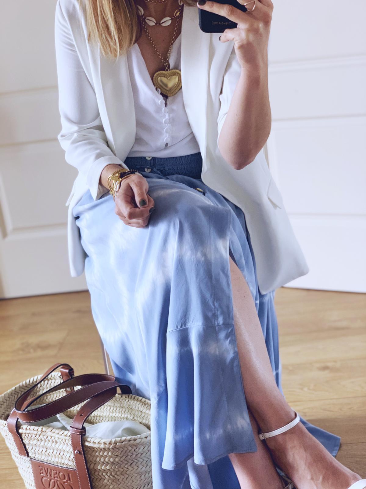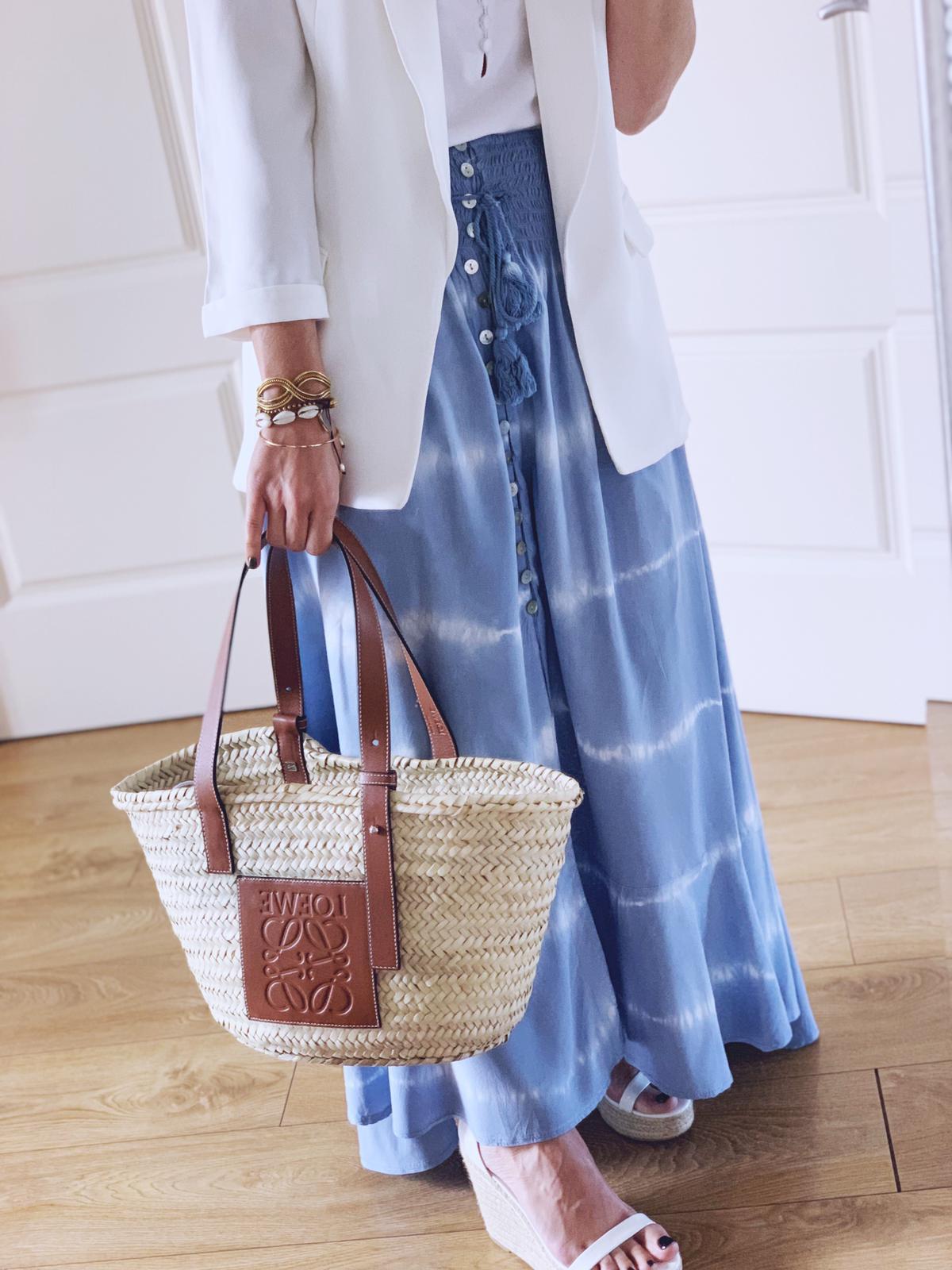 Falda larga estampada estilo Tie Dye con cintura ancha fruncida y detalle botones.