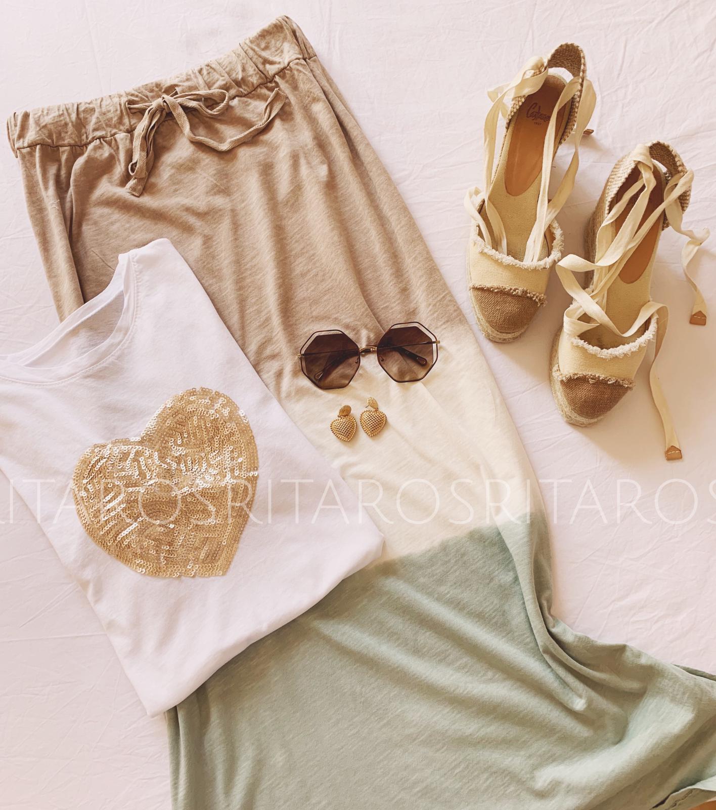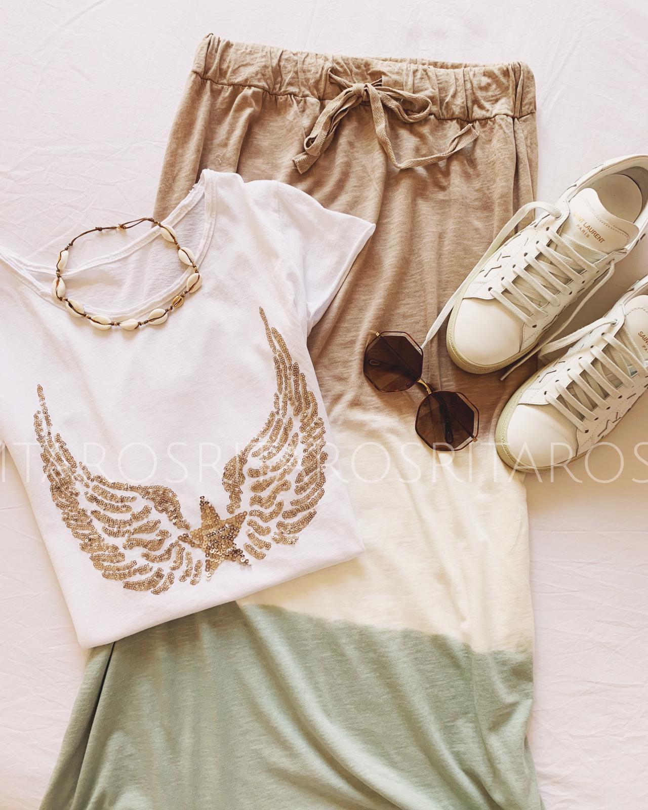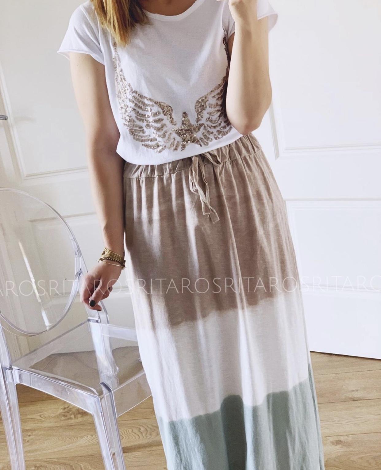Falda larga estampada Tie dye con cintura con goma elástica. Combínala con una de nuestra camisetas alas o corazón en color dorado y te encantará el resultado.