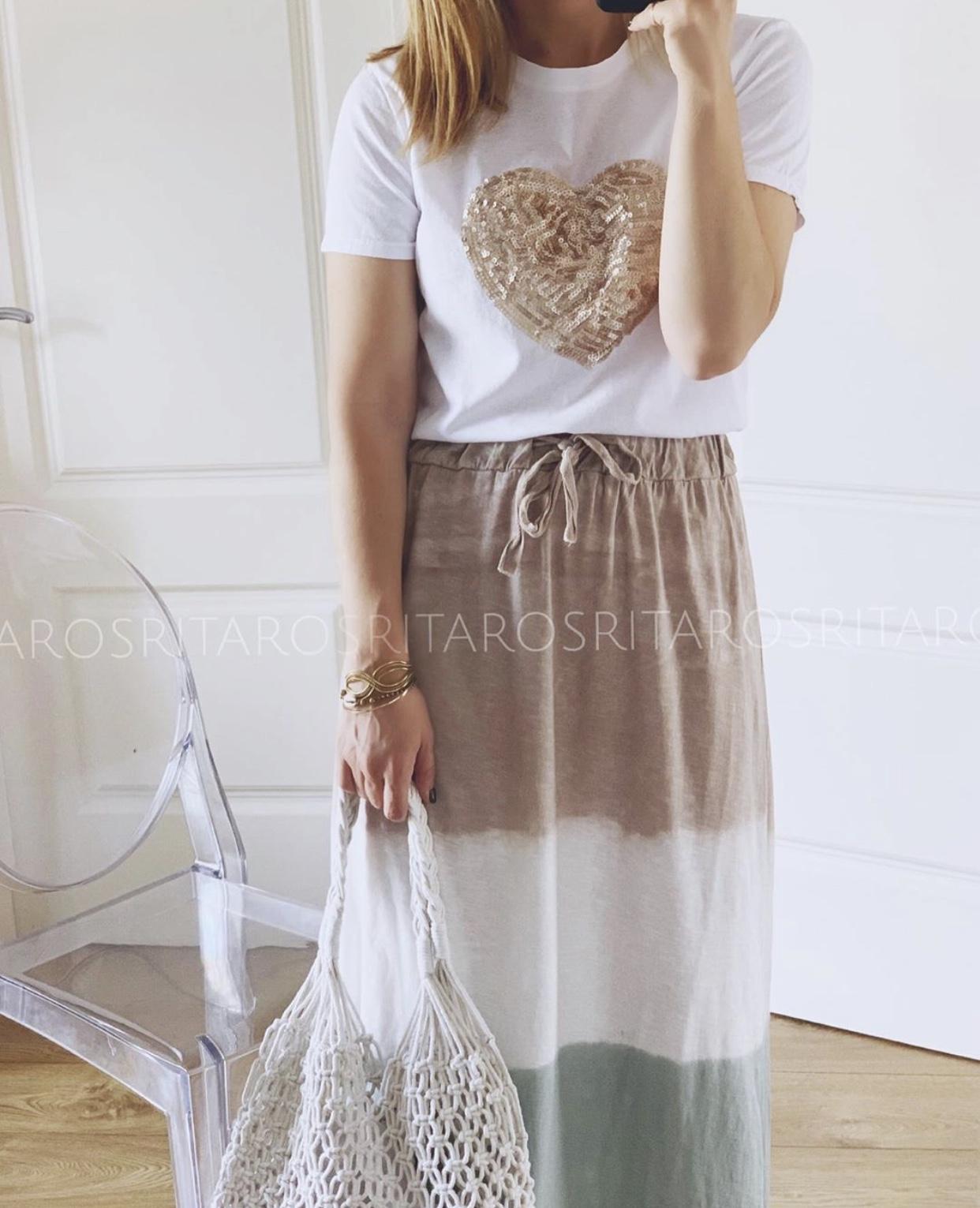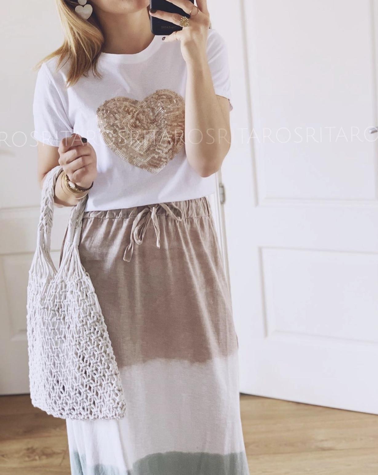 Camiseta de algodón de manga corta con detalle corazón con lentejuelas. La hemos combinado con nuestra falda Tie dye, te emcantará el resultado.