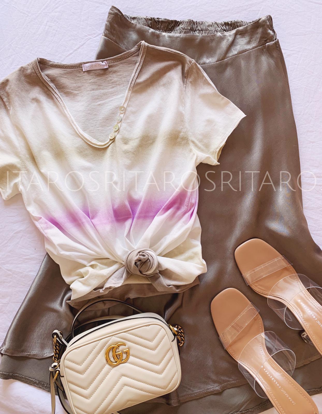 Camiseta de algodón manga corta estampada Tie dye en tres colores y detalle botones en escote. Combínala con nuestra falda satinada en color topo y te encantará el resultado.