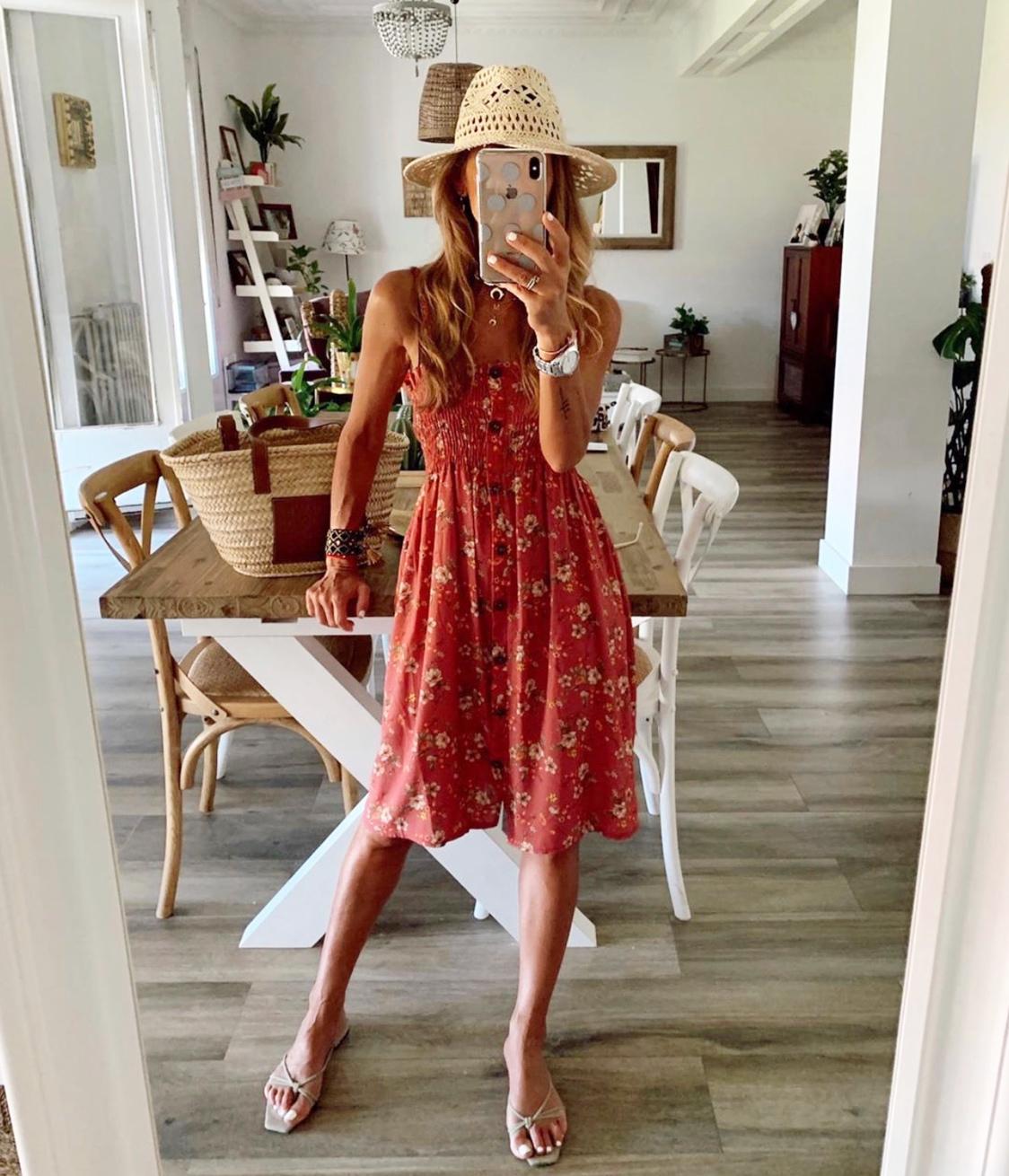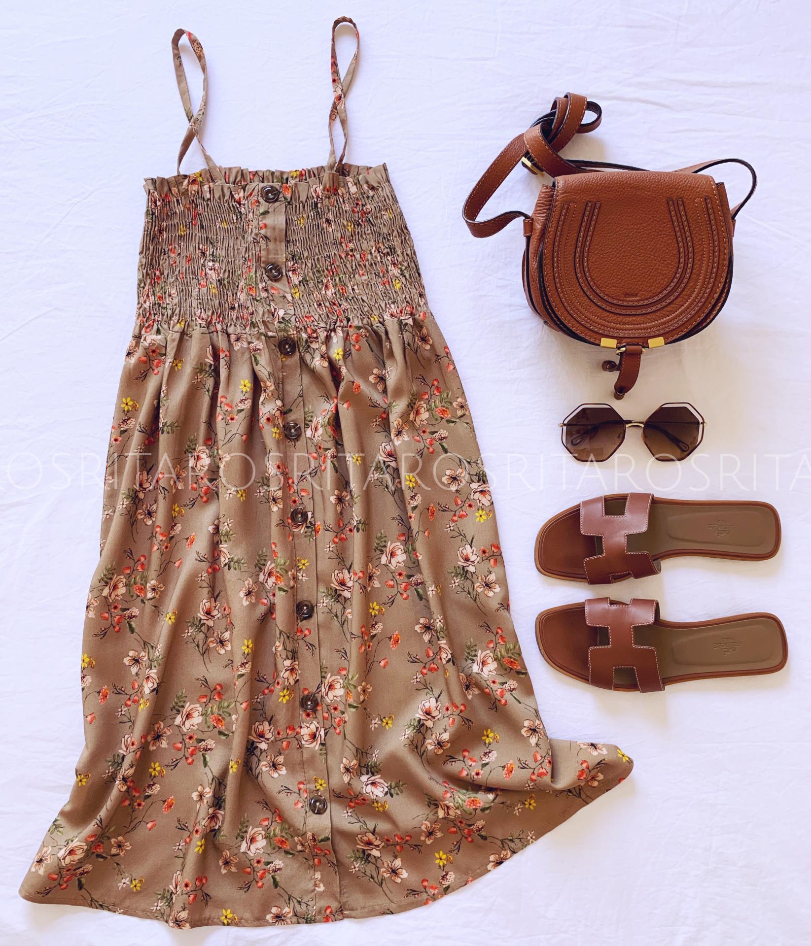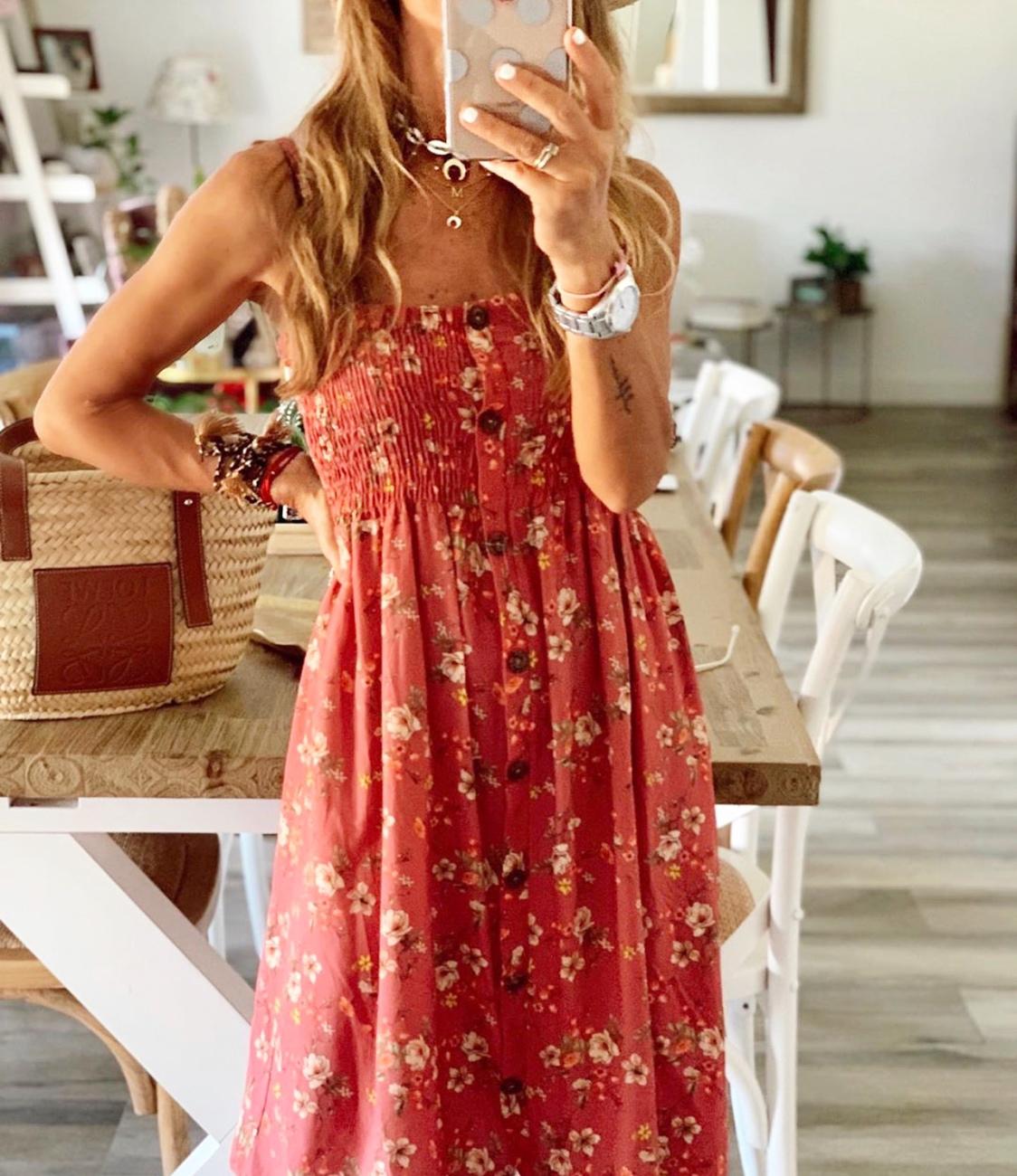 Vestido corto de tirantes con escote de nido de abeja y botones decorativos estampado de flores. Un vestido ideal para diario.